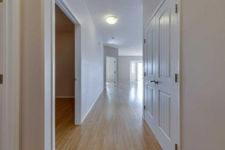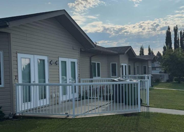 Great Location! Across from Rimbey's Senior's Center, close to hospital, park, shopping and all amenities. 55 plus Condo, so no more snow to shovel or grass to mow. Heat, garbage and water included in the condo fees. This unit has an open floor plan, modern decor, with garden doors to a patio area, large master bedroom with a three piece ensuite, along with a Den, and another four piece bathroom. Comes with all appliances, and there is in floor heating in the unit and the garage. This complex consists of four units, large common hallway with interior access to heated garage for each unit. This unit shows well!