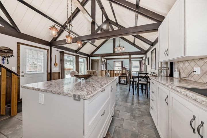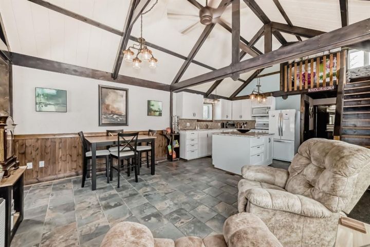 Inside, the main floor greets you with vaulted ceilings that make the space feel bright and open. You’ll find two cozy bedrooms and a 3-piece bathroom. The kitchen is well laid out and flows into the dining area, where you can enjoy views of the peaceful surroundings.