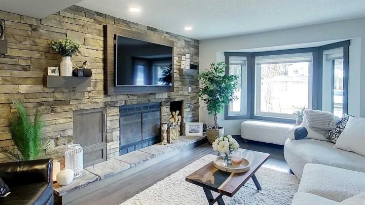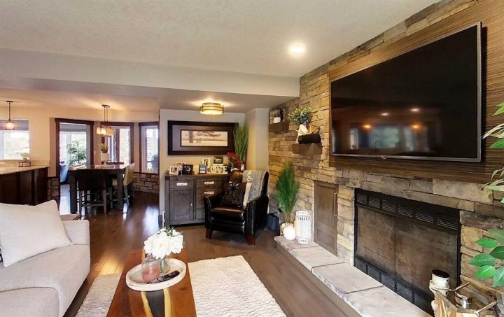 Back inside, unwind in the living room with a wood-burning fireplace and integrated media setup. A well-designed back hallway and mudroom offer more built-in storage, main floor laundry, and convenient access to the show-stopping garage.
