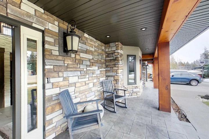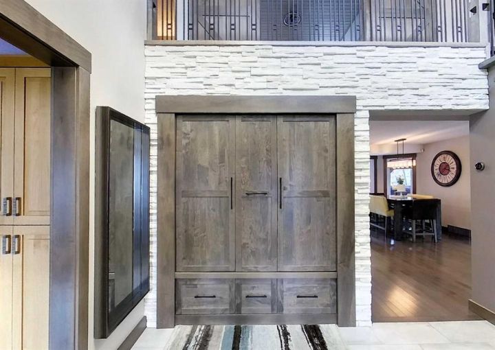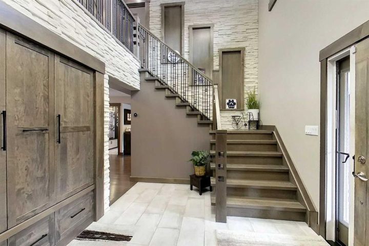Starting at the front, a triple attached garage includes a rare drive-through bay that leads to a hidden double garage at the back — perfect for projects, storage, or showcasing your toys. The covered front porch welcomes you into a stunning interior featuring soaring ceilings, a showpiece staircase, and built-in smart storage solutions.