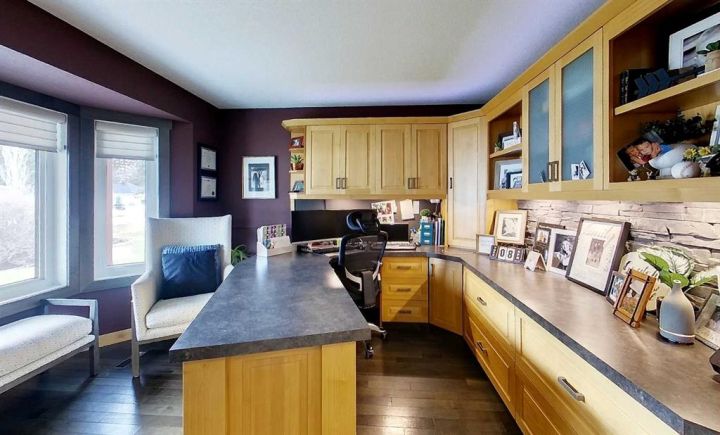 The main floor office is outfitted with custom cabinetry and can easily convert into an extra bedroom. Continue into the heart of the home, where an open-concept kitchen, dining, and living area provides the ultimate space for entertaining.