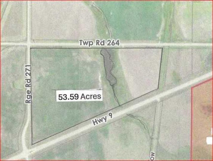 Excellent potential for this 53.59 Acres. Located 16 miles east of Balzac. The lot faces onto Highway 9. An irrigation fed creek crosses the easten end of the land. The property has resource income from a gas well lease and the land is leased each growing season to a regional farming operation. Will make a great location for a country home. Kathyrn K9 school is located nearby. Easy access, with dust free paved roads on three sides.