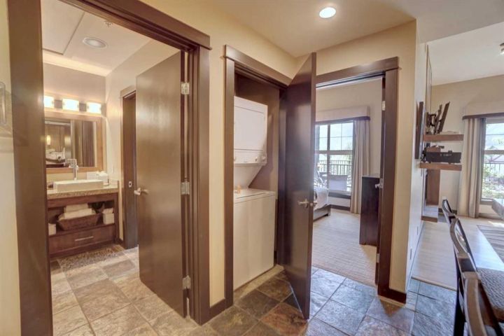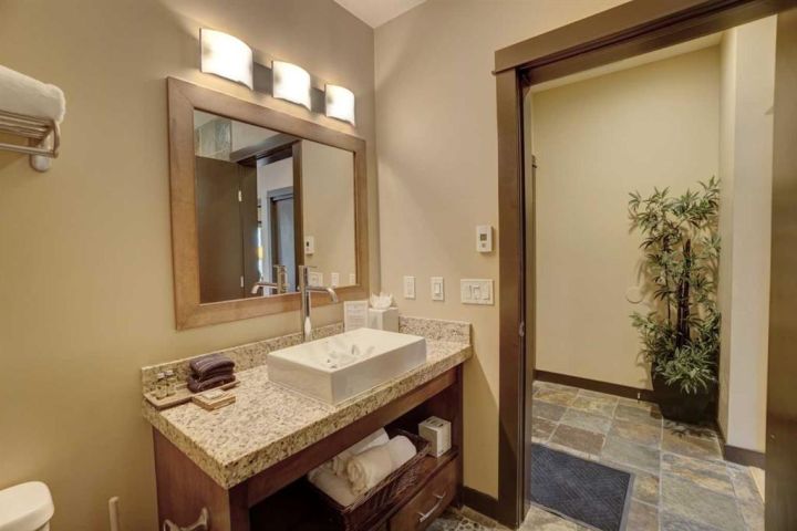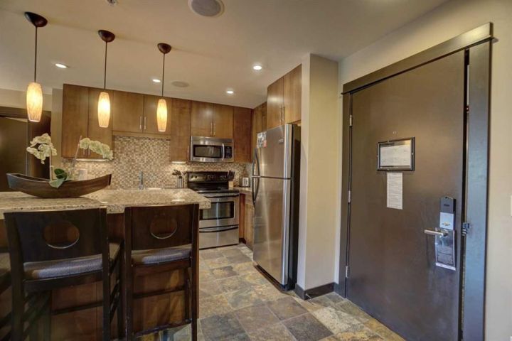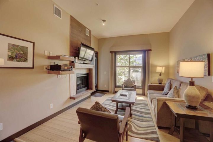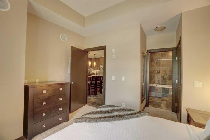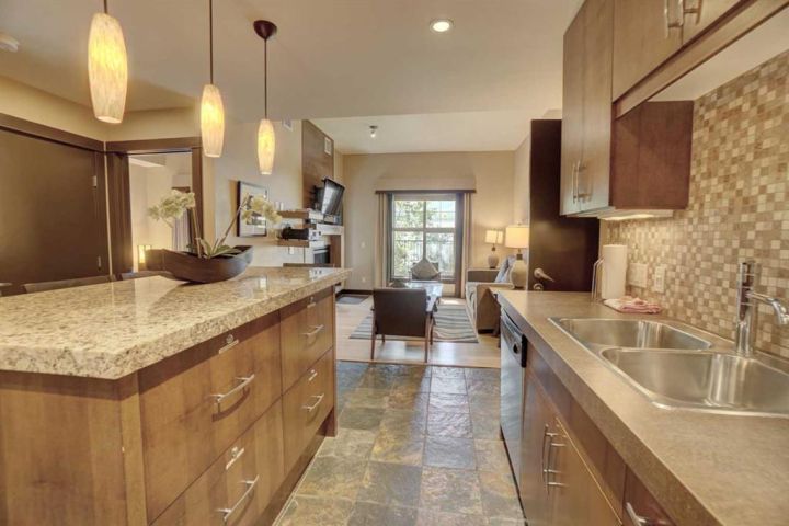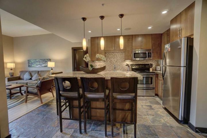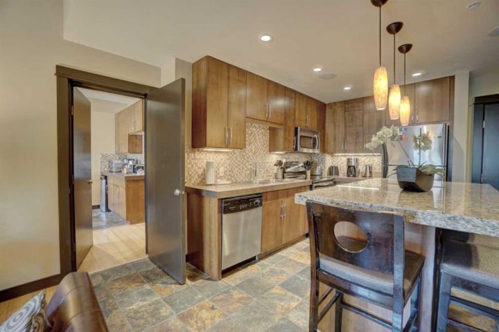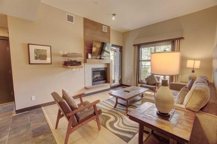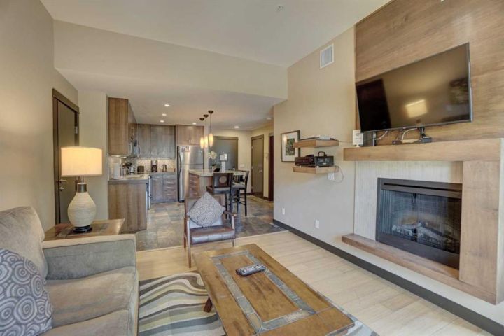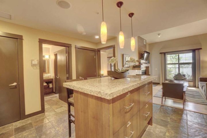 Relax and enjoy the Mountain Zen concept offered at Silver Creek Lodge. Thus beautiful 1/4 share fractional ownership lock-off suite features outstanding finishing including slate floors in kitchen/baths, open concept living area, 2 electric fireplaces, and stainless appliances. There are granite counter tops in bathrooms and kitchen island. This 2 bedroom, 2 bathroom lock-off unit can be used as a 2 bedroom suite, or separated by a lock-off door to create two versatile one bedroom, one bathroom units. This unit is pet friendly for owner's pets! The ground level patio walks out to a private grass area, with spectacular elevated west facing mountain views. Keep your condo in the optional revenue pool (every 4th week) generating revenue when you are not using it personally, or keep it for your own personal use every 4th week. Fabulous amenities include Steam room, massage room, fitness room, and hot tubs. Subject to GST. GST is included in the list price. GST may be deferred, consult your accountant.