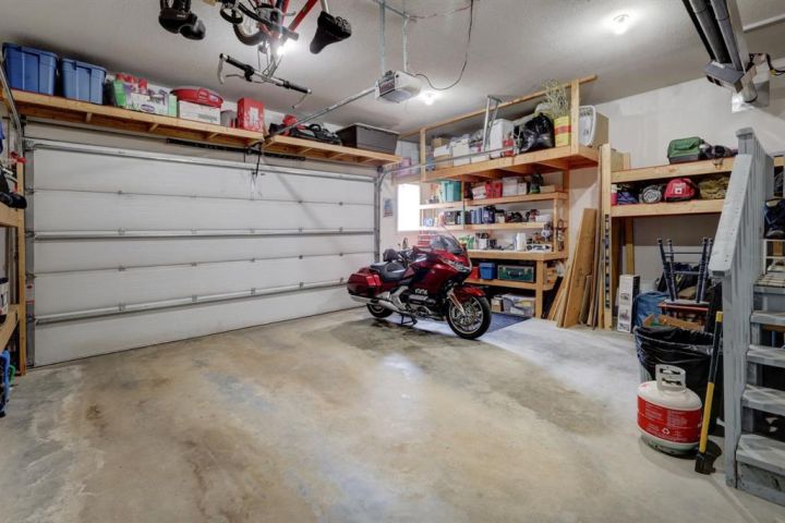 electric fireplace, garage shelving, window coverings, garage door opener and remote