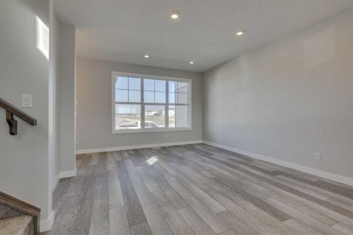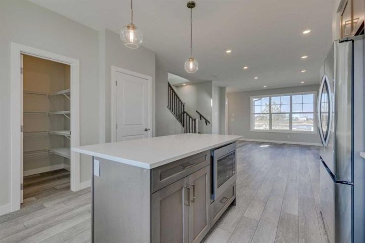 Discover the Eton, a move-in ready home in Chestermere with 1,490 sq ft of stylish living space. This craftsman-style home features Hardie board siding, black-framed windows, and an open-concept layout with luxury vinyl plank flooring. The rear-facing kitchen connects seamlessly to the backyard and includes Winter-stained maple cabinetry, quartz countertops, Samsung stainless steel appliances, a chimney hood fan, a large island, and a picture window above the granite sink. A functional back entry and walk-in pantry add convenience, while the front-facing great room is bright and inviting. Upstairs, the rear primary bedroom includes a dual-sink ensuite, complemented by upper-floor laundry and two additional bedrooms. Situated in Clearwater Park, one of Chestermere’s newest master-planned communities, residents enjoy exclusive access to the Clearwater Community Clubhouse. Cardel Homes offers better design and quality, making this a standout opportunity for modern living. Photos are representative.