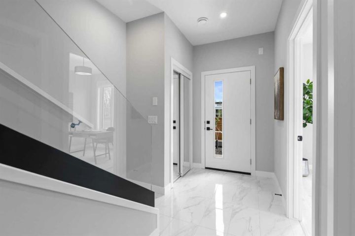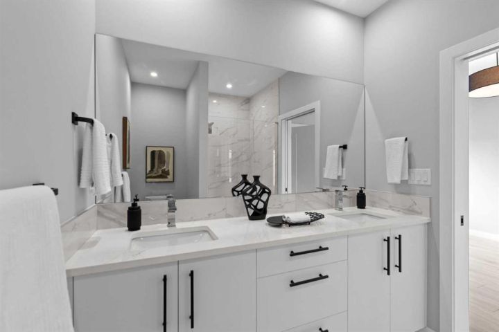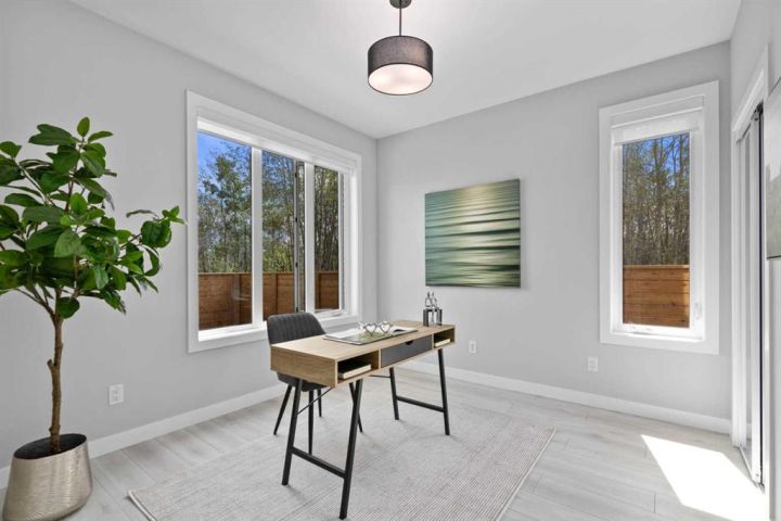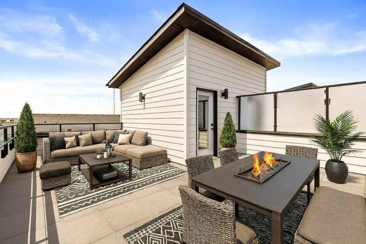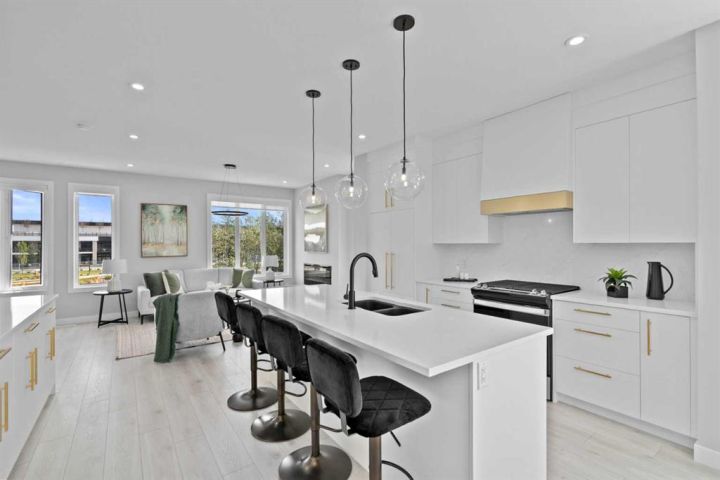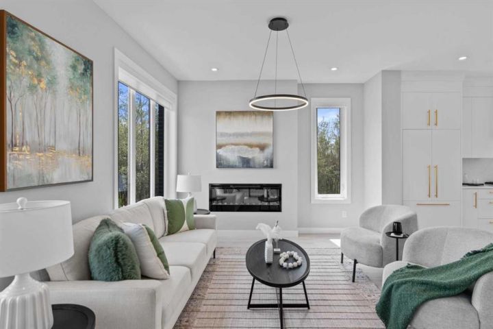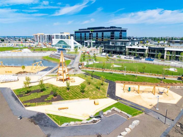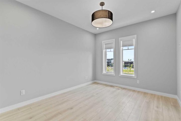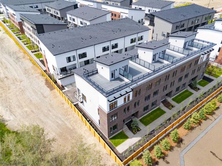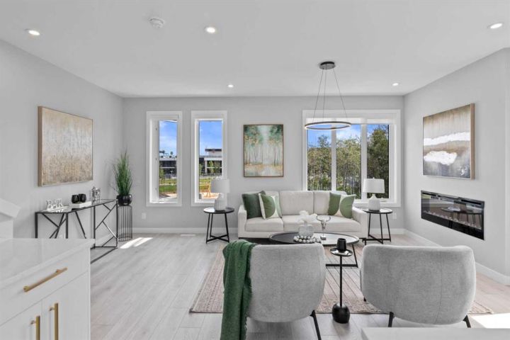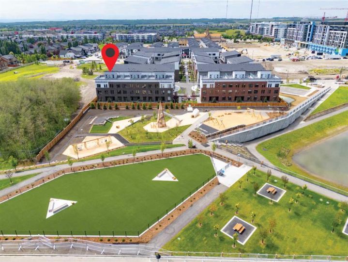 Brand new and never occupied, this executive end-unit townhome in the District Townhomes by Truman offers upscale living with premium finishes and exceptional outdoor space. The open-concept main floor is filled with natural light from the southwest-facing balcony and features wide-plank flooring, lofty ceilings, and a chef-style kitchen with full-height cabinetry, quartz countertops, gas range, built-in microwave, refrigerator, and a large island with breakfast bar. The spacious dining area opens to the balcony, while the living room is anchored by a sleek 50" electric fireplace. Upstairs, you'll find two large bedrooms, each with walk-in closets and private ensuite baths, plus convenient upper-floor laundry. The entry-level flex room—perfect for a home office or guest bedroom—is accessible from both the front entrance and the heated double garage. One of the few units in the development to include a private rooftop patio, this home offers 270° views—ideal for entertaining or enjoying sunset evenings. Located in a quiet, private setting, this townhome combines modern design with low-maintenance luxury living. Roughed-in for security, vacuflo, air conditioning and home networking. West District is a dynamic and trendy neighbourhood that offers a rich shopping and dining experience. Enjoy local shops, restaurants, grocery, fitness, and medical services. Featuring a focus on pedestrians, the main streets highlight twenty foot wide sidewalks complete with integrated walkway and bike paths. In the heart of West District is the central Radio Park featuring a recreation area with a basketball court, skatepark, amazing new playground, ice skating in the winter, summertime farmer’s marekts and events, live concerts and festivals at the outdoor amphitheatre and much more. Located just 15 minutes from downtown Calgary, 5 minutes from top public and private schools, and 45 minutes to Canmore,