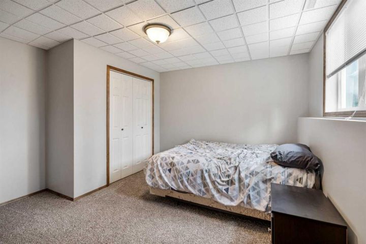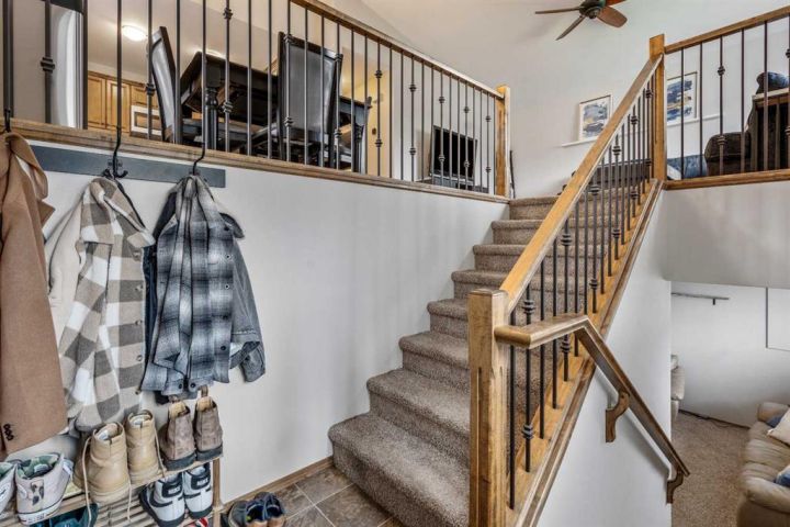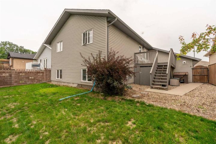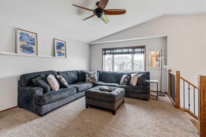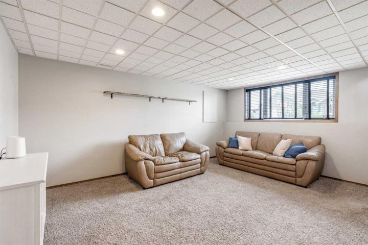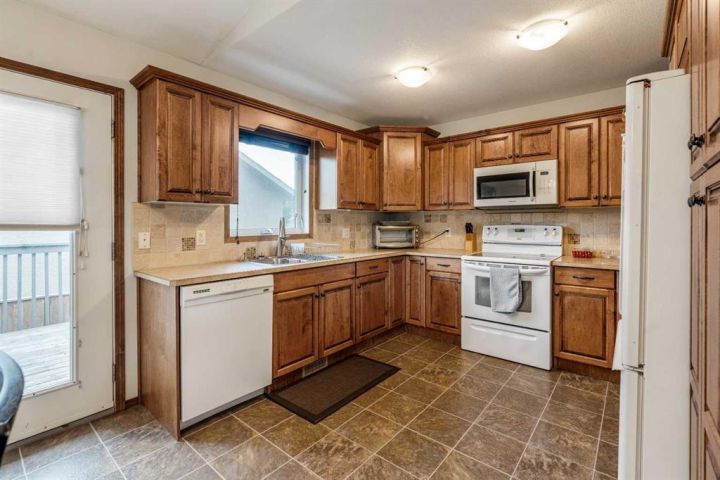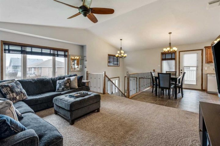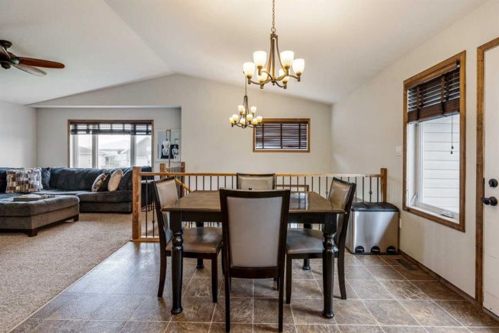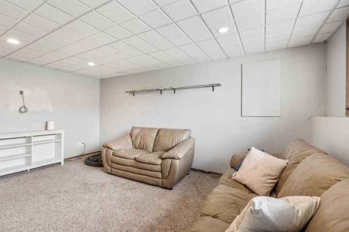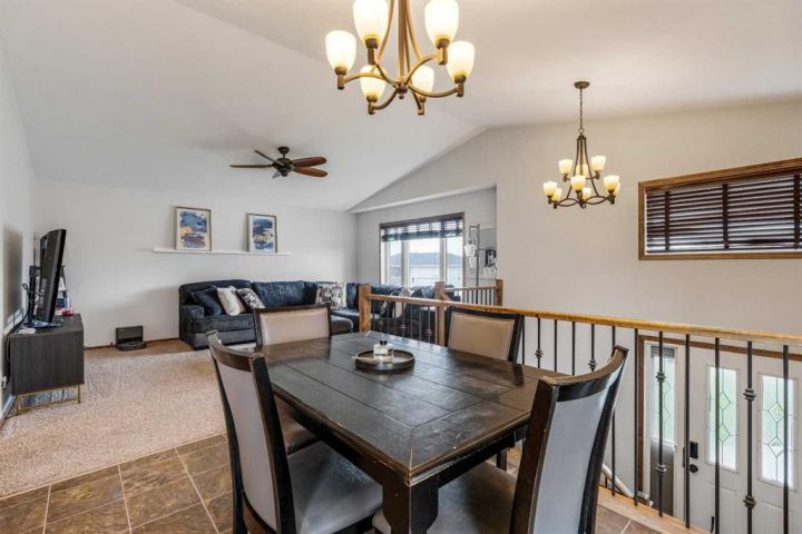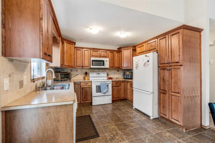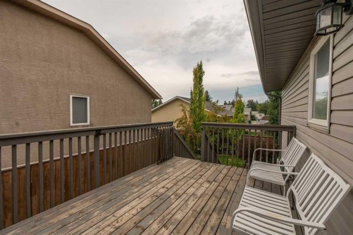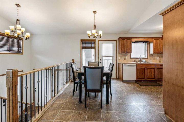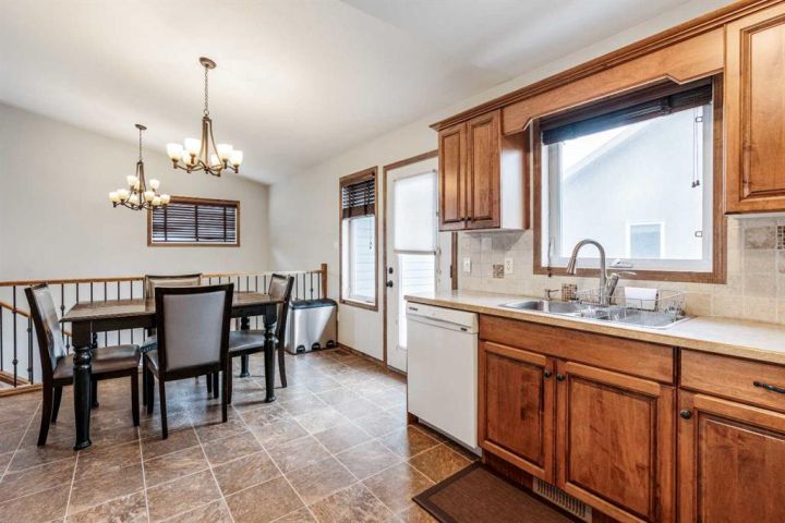 The bright main level welcomes you with a spacious living room featuring vaulted ceilings, , and large windows that flood the space with natural light. The kitchen is equipped with solid wood cabinets. Enjoy meals in the cozy dining area or step onto the deck off the south side for summer BBQs. There are two bedrooms upstairs, the primary has double closets for ample storage, the main floor also has a 4-piece bathroom with built-in linen storage. The basement offers two additional bedrooms with closet organizers, a large family room. and a bar area with a feature wall making it perfect for entertaining. Other highlights include nice blinds throughout, 8-foot ceilings, and real wood trim. This move-in-ready home offers exceptional value in a fantastic location — perfect for families looking for space, comfort, and proximity to a great school. Don’t miss your chance to make this wonderful property your next home!