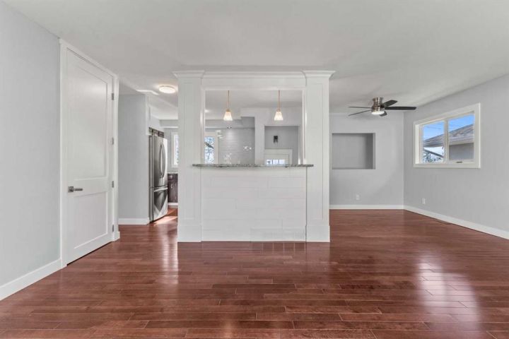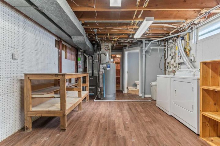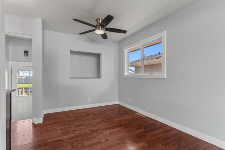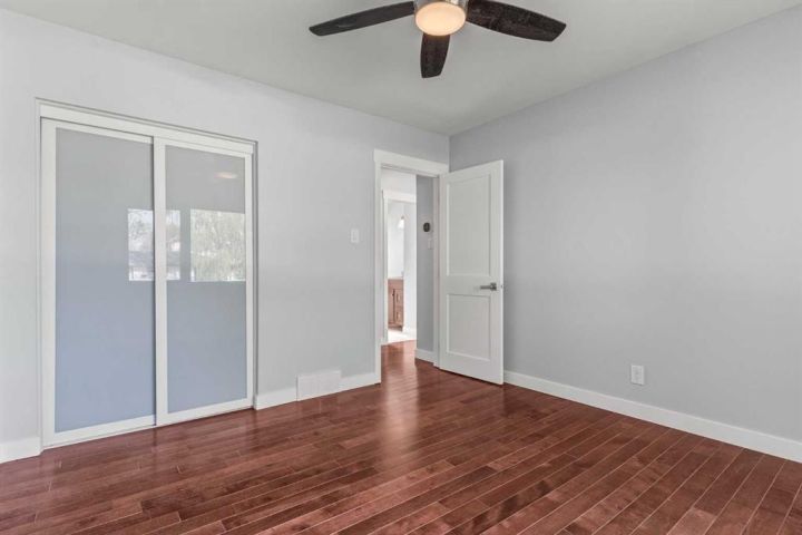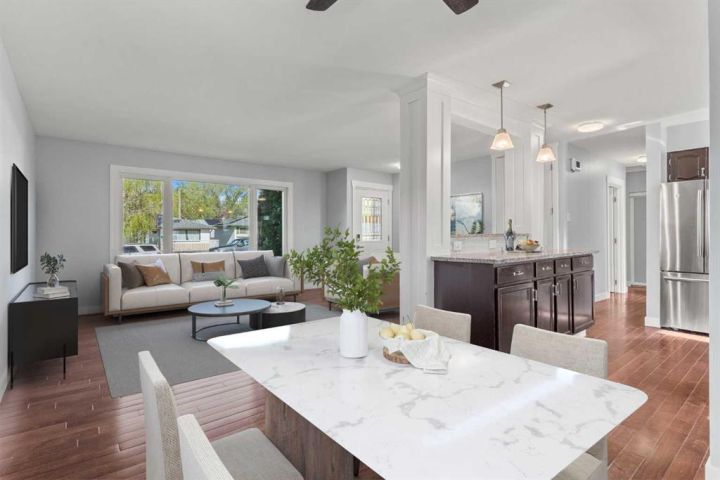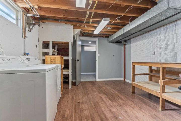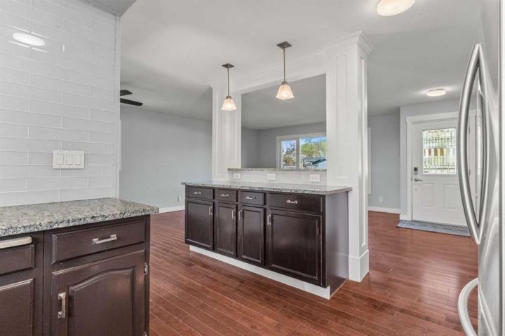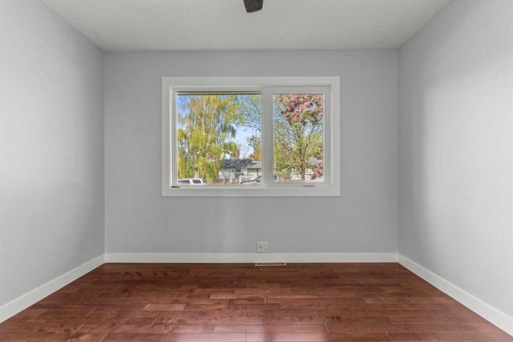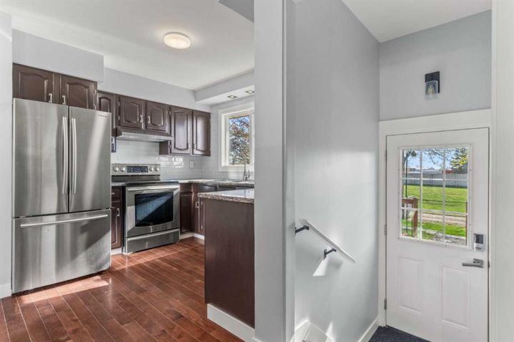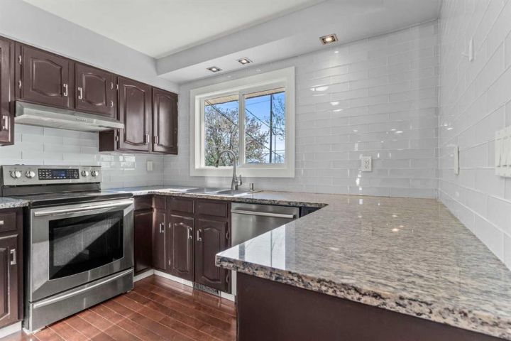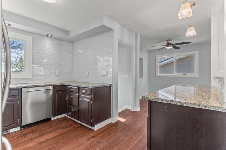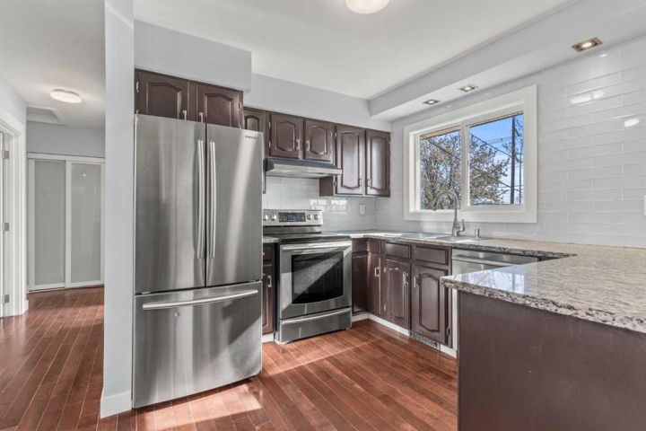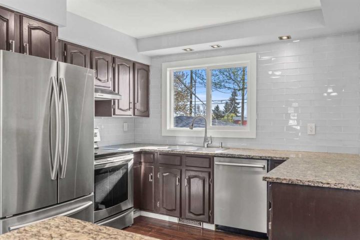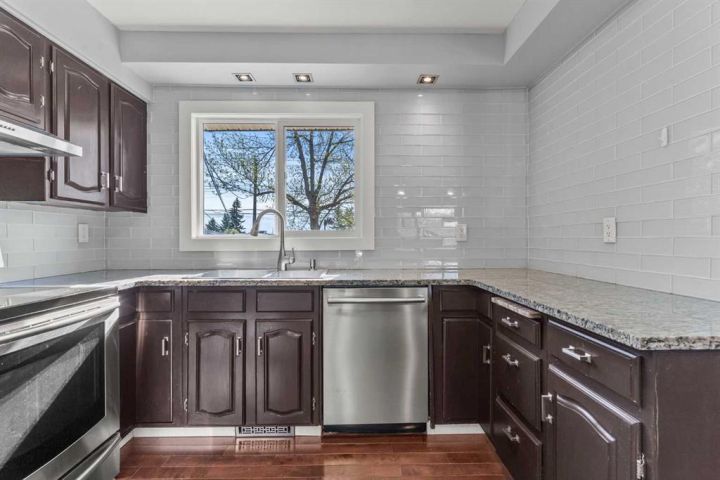 This fully finished and updated bungalow located in the well established, family friendly community of Fairview offers you a perfect blend of urban convenience and suburban tranquility. Situated on a tree lined street this well maintained home offers charming curb appeal reminiscent of the 1950s suburbia when this neighbourhood was established. They just don’t make them like this anymore. Having said that, you will appreciate the bright, fresh and modern feel of this updated home as soon as you step inside. Not to mention the comfort and luxury of central air conditioning. The open concept layout features a spacious living area with a huge front window allowing for tons of natural light. A fun and unique breakfast bar between the kitchen and living area adds both architectural interest and practicality with the extra seating it provides. Beautiful glass tile backsplash, stainless steel appliances, granite counters and updated lighting are some of the kitchen upgrades. You’ll also love the rich hardwood flooring and updated baseboards & doors throughout. The main floor offers 3 bedrooms in total all with modern frosted glass closet doors. The main bath comes complete with granite counters and a tub with tile surround and glass block window for light. Expand your living space in the fully finished lower level where you’ll find a great sized rec room featuring an electric fireplace that looks like an old fashioned wood stove. A 4th bedroom, 2 pc bath and ample storage space including laundry round out this level. Be ready to enjoy summer in this amazing East facing backyard with 2 tiered landscaping, raised planters, a ground level deck and tons of towering trees and lush landscaping. You’ll also appreciate the convenience of a natural gas line to the deck for your grill or fire table as well as a gas line to your single detached garage. There is back alley access and plenty of parking for extra cars or even an RV. You get to benefit from the behind the scenes updates that have been made to this home so that you don’t have to worry about a thing. These include a water softener, high efficiency furnace, new hot water tank (2018,) new shingles (2021,) new triple pane front windows and double pane back & side windows. You can just move right in and enjoy. Fairview offers convenient access to transit, major roadways, shopping, restaurants and all amenities. It is also located in a favourable school district with a number of reputable schools in close proximity including Fairview, Acadia, St. Cecilia and Le Roi Daniels. Don’t wait to take a tour of this terrific home.