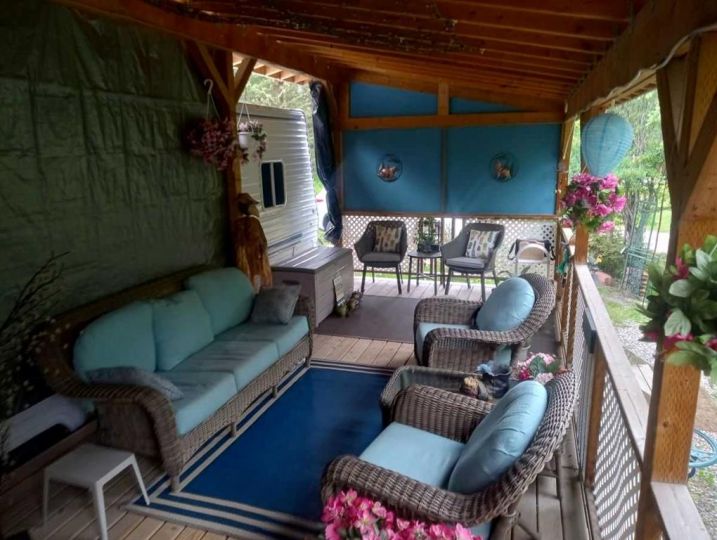 SUNDRE'S RIVERSIDE RV VILLAGE- NICE UNIT IN MOST DESIREABLE QUIETEST PARK PHASE 5. BORDERED ON TWO SIDES BY SMALL SPRING FED CREEKS, LARGE TREES AND SHRUBS GIVE EXTREME PRIVACY. FRONT IS COVERED WITH WILD DAISIES. THE RV IS JUST LIKE NEW, ONE BEDROOM WITH BATHROOM WITH TOILET AND SHOWER AND SINK. LARGE SLIDE IN THE LIVING ROOM AREA. THE COVERED DECK IS REALLY UNIQUE THE PERFECT PLACE TO SIT AND READ A BOOK, LISTEN TO THE BIRDS AND WATCH THE WILDLIFE. THIS UNIT BOTH RV AND COVERED DECK HAVE ALWAYS BEEN ENGULFED IN A LARGE TARP. RIVERSIDE HAS A FABULOUS CLUBHOUSE WITH SEASONAL WASHROOMS AND LAUNDRY. THE MAIN WASHROOMS AND LAUNDRY ARE OPEN YEAR ROUND FOR THOS HARDY WINTER CAMPERS. CARETAKERS ARE ON SITE YEAR ROUND AND PATROL THE PARK FOR SECURITY DAILY. LOCATED JUST A COUPLE OF BLOCKS FROM THE MAIN STREET IN TOWN AND THOSE FABULOUS EATING ESTABLISHMENTS. AND OH SO MANY LIQUOR STORES. RIVERSIDE IS A GATED COMMUNITY SO CALL FOR GATE ACCESS.