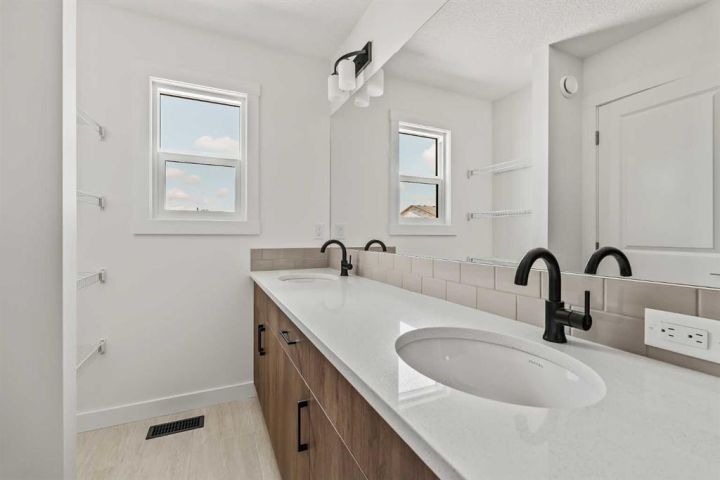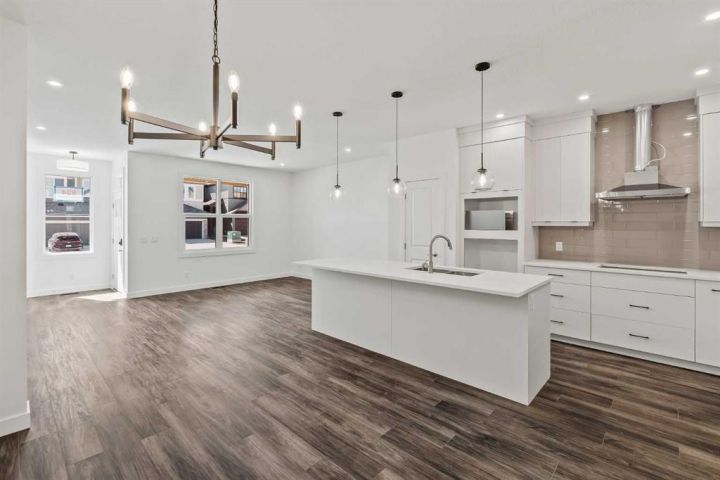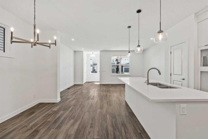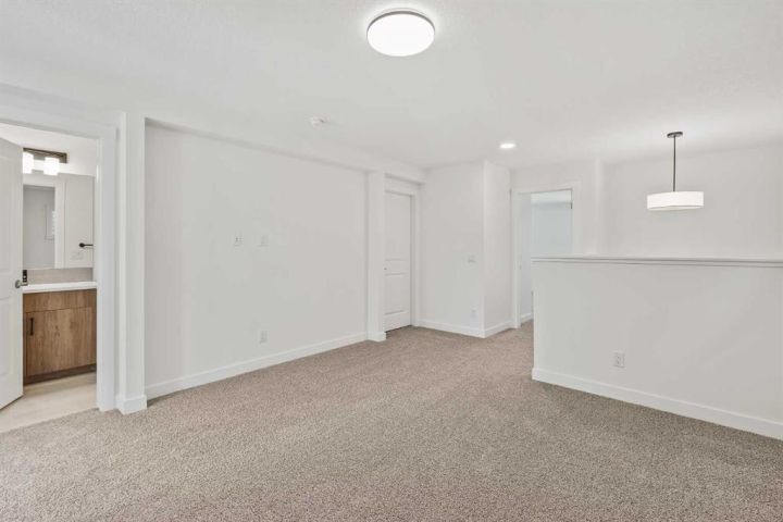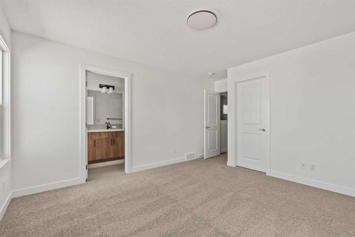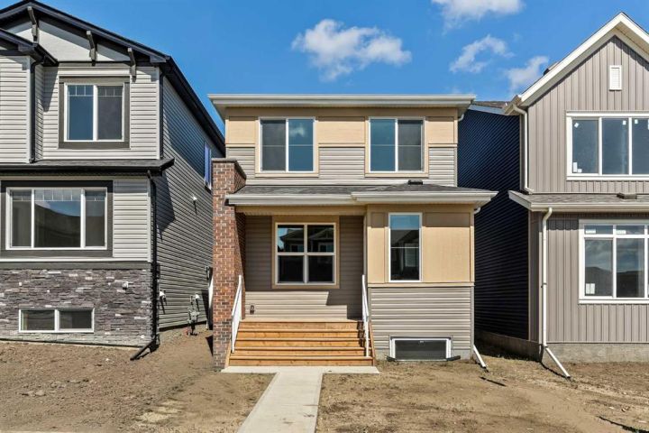 An incredible opportunity to own a brand new home in the desirable new community of Livingston with immediate possession! This home is situated on a bright and sunny lot with a south-facing front yard - allowing natural light to pour through the main level all day long. Featuring 4 bedrooms, 3.5 bathrooms and two living spaces + an undeveloped basement with a private side entrance, this property is perfect for investors, multi-generational living or those that want a large family home with space to grow! Built by Brookfield Residential, the Oxford model is a stunning home boasting nearly 2,000 square ft. of living space. This open concept main floor has 9 ft. ceilings and extended height cabinets and a large island with a gourmet kitchen package including chimney hood fan and built-in oven + microwave. The main floor features a large great room with plenty of natural light and a main floor bedroom with its own full en suite! Luxurious and resilient LVP and tile flooring flow throughout the main level, making it perfect for those with children and pets. The upper level features a central bonus room that separates the primary bedroom from secondary rooms. Enjoy the luxury of this large primary suite and a beautiful ensuite bathroom with dual sinks and a walk-in shower. Two more bedrooms, a full bathroom and a laundry room complete the second level.  The basement has direct access via a side entrance and is undeveloped - awaiting your design touches! This home is brand new and comes with builder warranty + Alberta New Home Warranty! The Oxford really does offer it all - 4 bedrooms with one being on the main level, 3.5 bathrooms, 2 living areas + a private backyard and double parking pad *Please note: Photos are from a show home model for representation purposes and are not an exact representation of the property for sale.