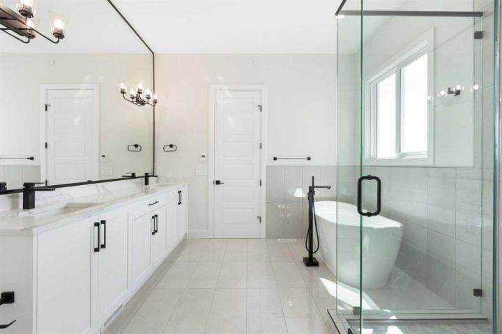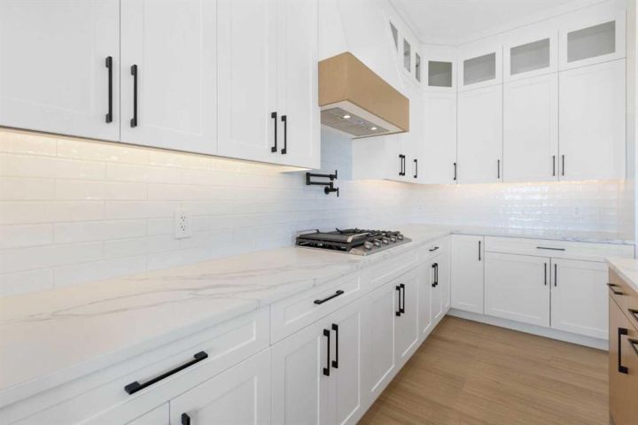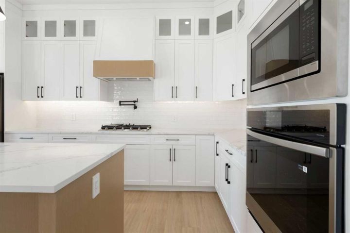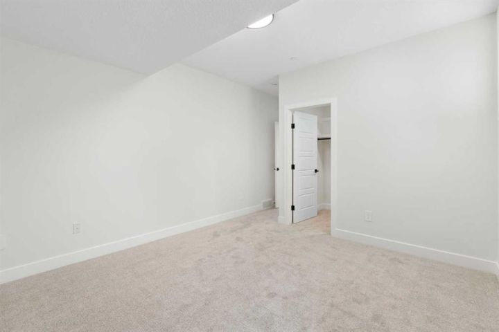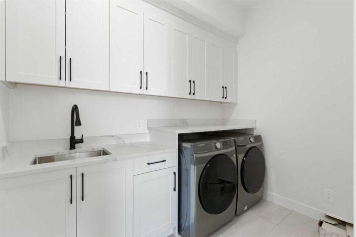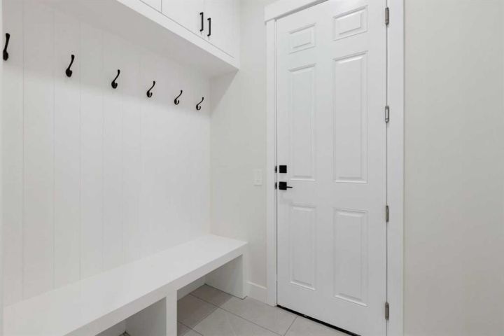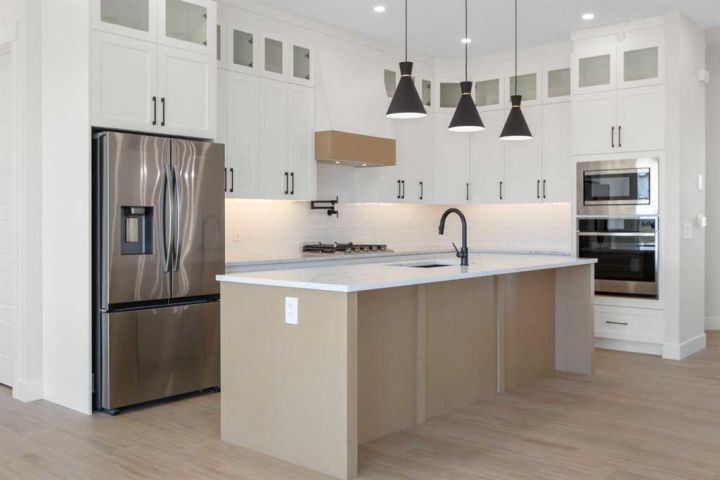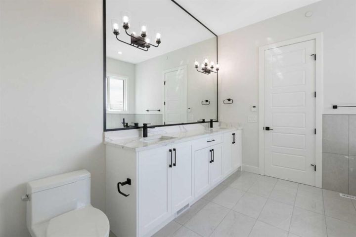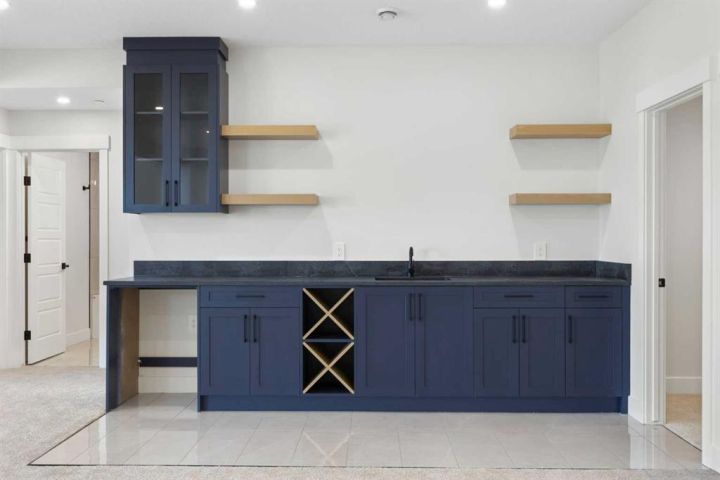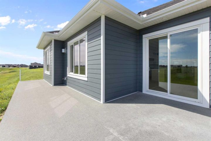 ELIGIBLE FOR FIRST HOME BUYERS GST REBATE. Nestled along the picturesque canal in the Lakes of Muirfield, this stunning 5-bedroom walk-out bungalow epitomizes luxurious living. As you approach the house, the exposed aggregate finished driveway greets you as well as the oversized triple garage. The exterior boasts Hardie board siding and upgraded stone accents, perfectly complemented by recessed lighting in the soffits, illuminating the home beautifully at night. The spacious garage is fully drywalled and taped, with natural gas rough-ins ready for a heater. Step inside to find a blend of modern and classic design elements. The main floor, with its soaring 10 ft ceilings and 8 ft doors, exudes an air of grandeur, while the basement’s 9 ft ceilings create an inviting and cozy atmosphere. The heart of this home is the exquisite kitchen, where cabinets stretch to the ceiling, offering ample storage. Quartz countertops add a luxurious feel, while the black hardware and stainless steel appliances provide a modern contrast. The kitchen is equipped with gas cooktop and wall oven, dishwasher and microwave and large pantry. Entertaining is a breeze with the built-in ceiling speakers and a gas fireplace with a tile finish in the main living area. The primary bedroom is a sanctuary of its own, boasting a stunning feature wall and spacious closets with built in shelving for all your storage needs. Plus enjoy a beautiful five-piece ensuite with dual sinks, tiled shower, and stand-alone tub. Two more bedrooms ( one that could be a den), a full bathroom and laundry room complete this level. The back deck expands across the back of the home and extends your indoor living space to the outdoors. The walkout basement transforms into an entertainment hub, complete with a built-in media center, a wet bar, and an electric fireplace, perfect for movie nights and gatherings. Also, two large bedrooms and a full bath for extended family or visitors. The thoughtful design extends to the flooring, with options for LVP or laminate flooring on the main floors, ceramic tiles in the bathrooms and mudroom, and plush carpeting in the basement with high-grade underlayment for added comfort. The mudroom is practical yet stylish, featuring a stainless steel sink with a black pull-out faucet.