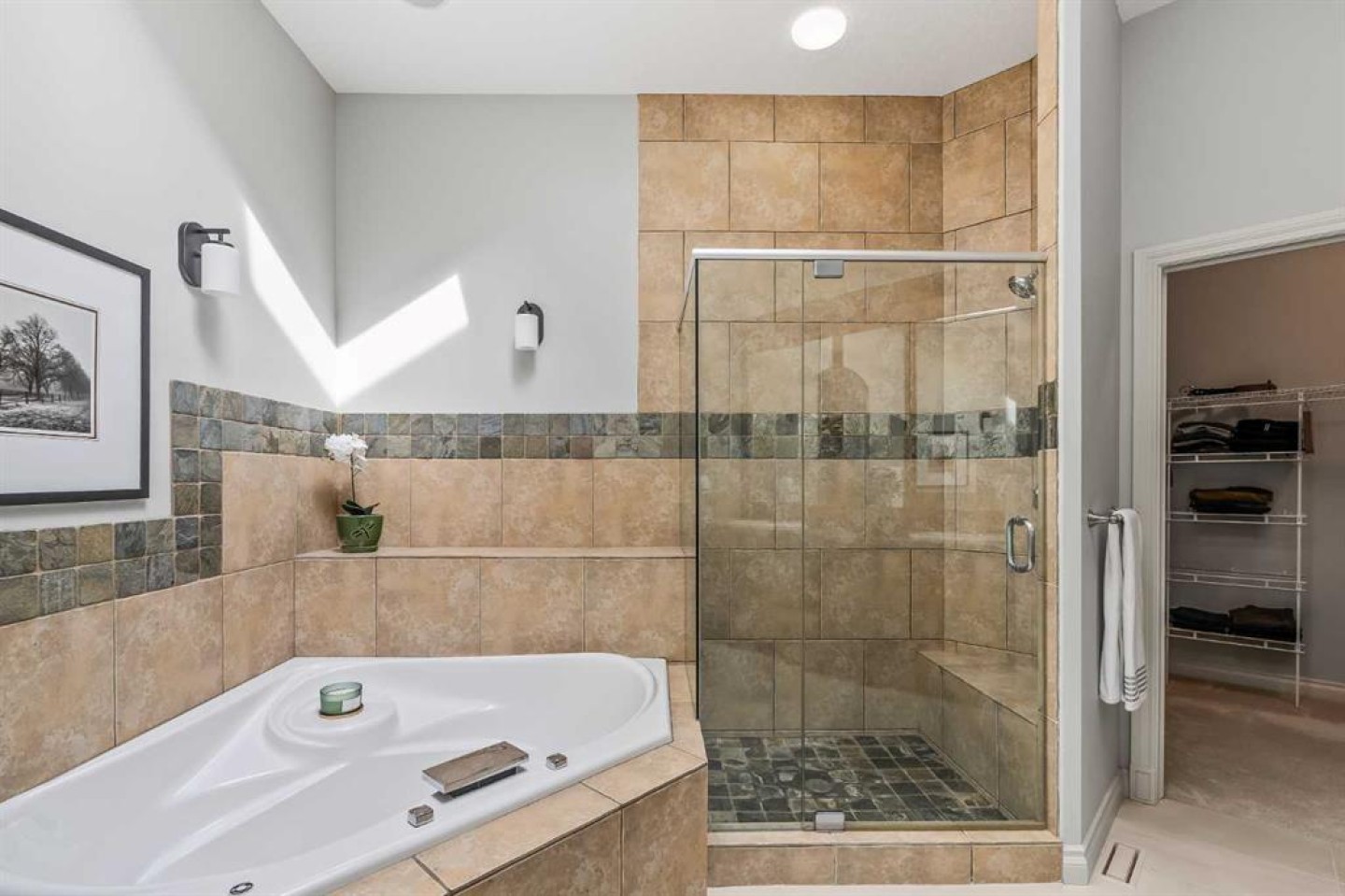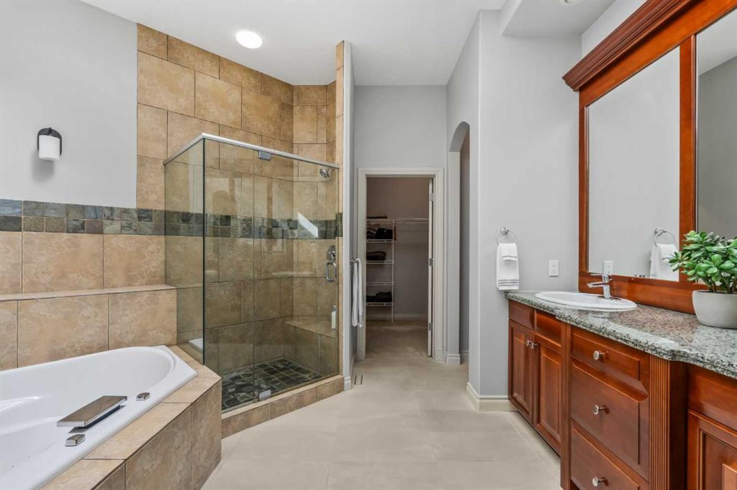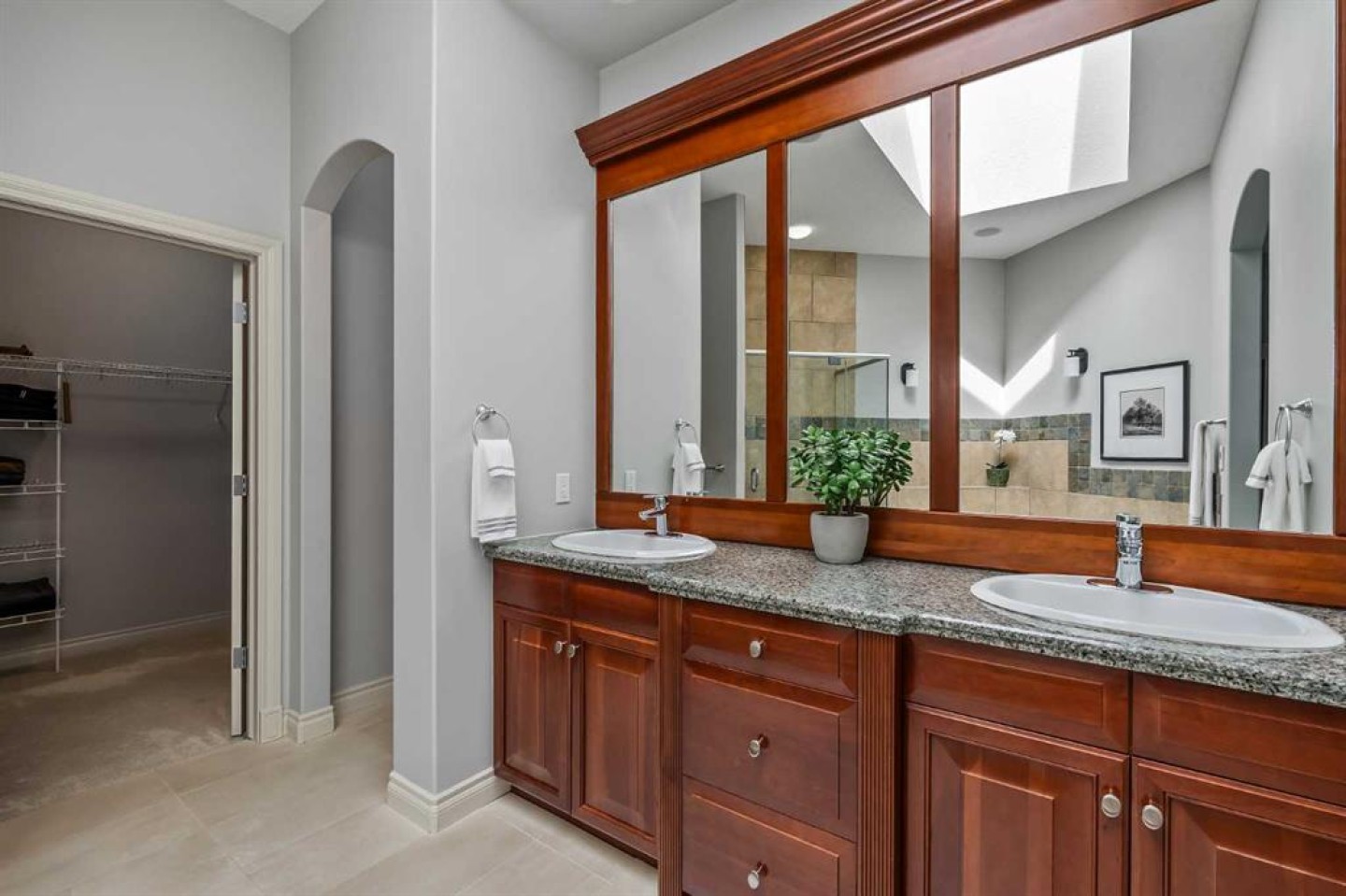 Bookcases, Breakfast Bar, Built-in Features, Ceiling Fan(s), Central Vacuum, Double Vanity, Granite Counters, High Ceilings, Jetted Tub, Kitchen Island, Open Floorplan, Recessed Lighting, Skylight(s), Storage, Tray Ceiling(s), Walk-In Closet(s), Wired for Sound