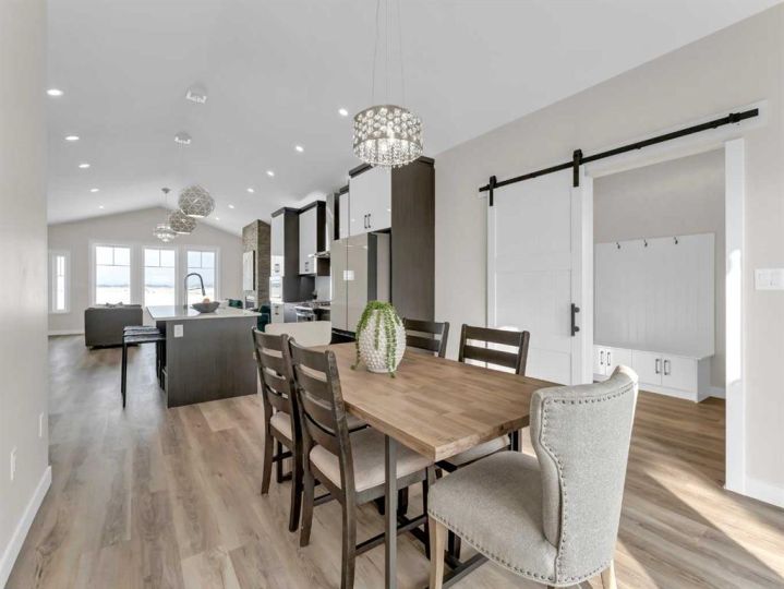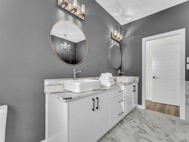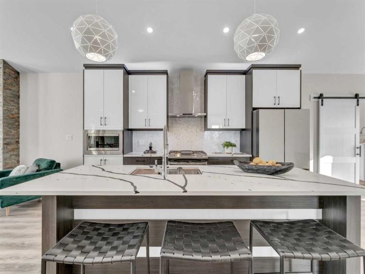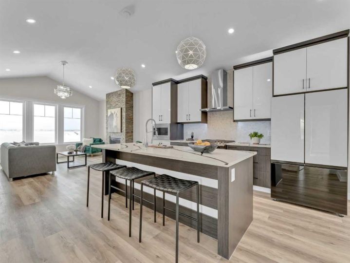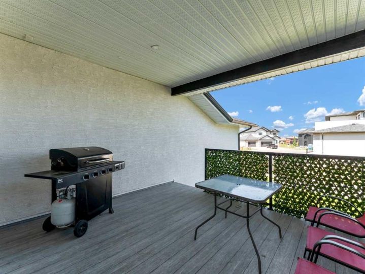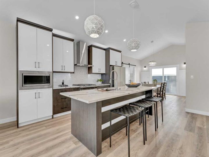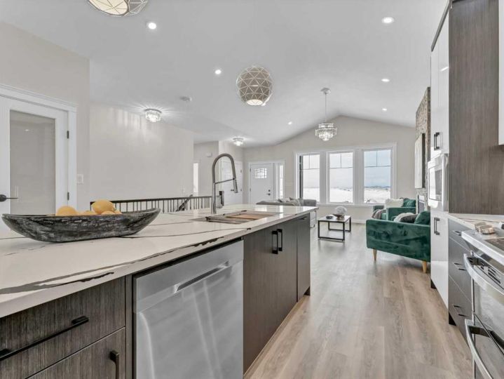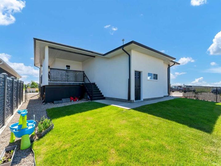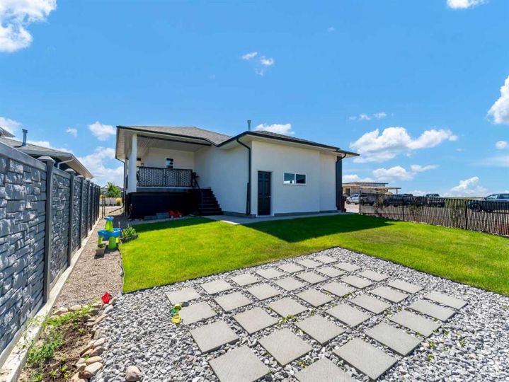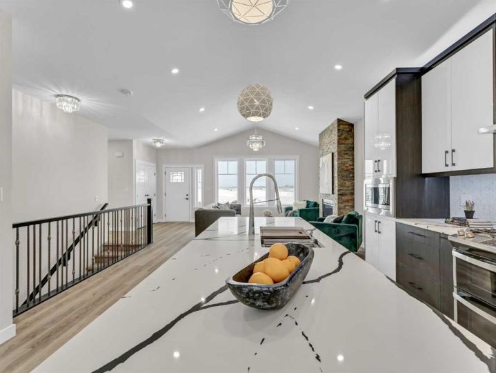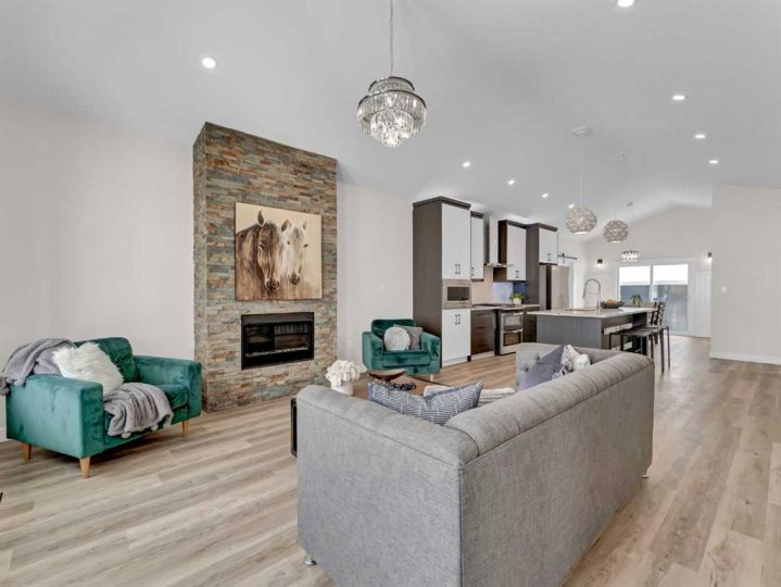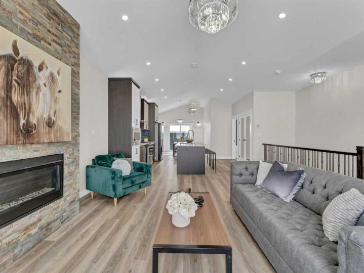 This executive fully developed bungalow in Desert Blume features 5 bedrooms, 3 full bathrooms, and a triple car heated garage on a corner lot! This beautifully finished home is waiting for its owners to move right in and start creating memories in. This home offers a functional, open concept floor plan with a large front living room w/ gas fireplace, and a beautiful kitchen with two toned cabinets, a large centre eat-at island, gas range, tile backsplash and quartz countertops. The huge dining area will host large family suppers and game nights with friends. The conveniently located laundry/mudroom has a sliding barn door and direct access to the huge, attached garage. This level offers 3 large bedrooms, including the primary which hosts a large walk-in closet and a gorgeous 5-piece ensuite with dual sinks, a stand-alone soaker tub, and separate walk-in shower. A 4-piece bathroom finishes off this level. The fully finished basement is perfect for older kids with a huge family/rec room featuring a wet bar, built-in office nook, and two huge bedrooms, one with access to the large 4-piece bathroom. A unique feature of this magnificent home is that there is also access to the attached garage from the basement. The back covered deck features a privacy wall and looks out over the good-sized back yard which is fully landscaped with underground sprinklers and a black chain link fence. This home is a must see!!!