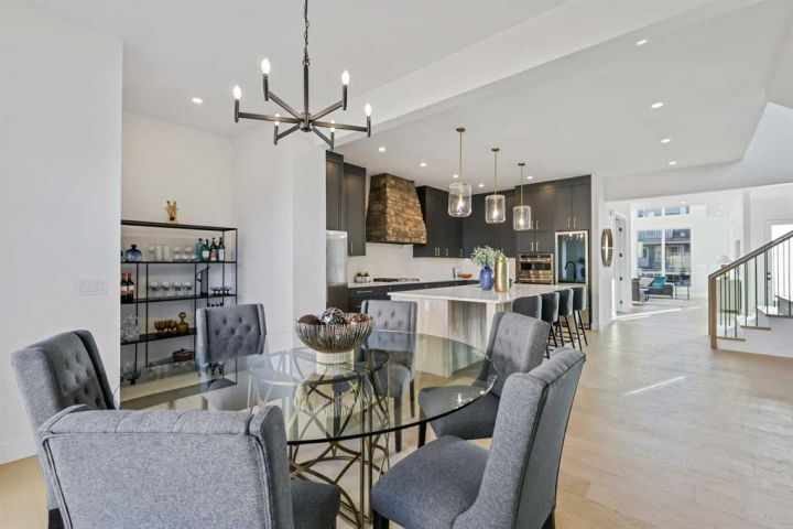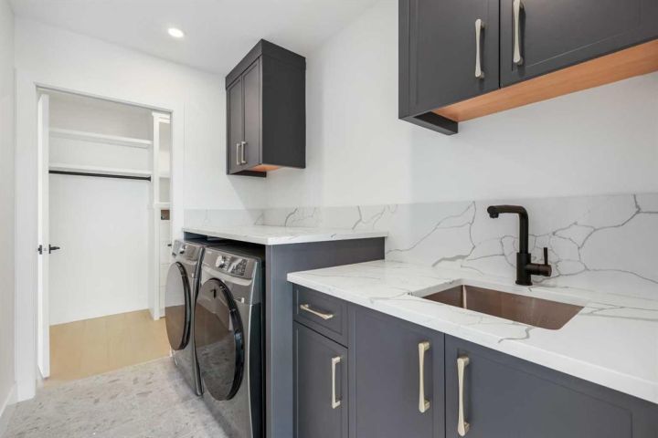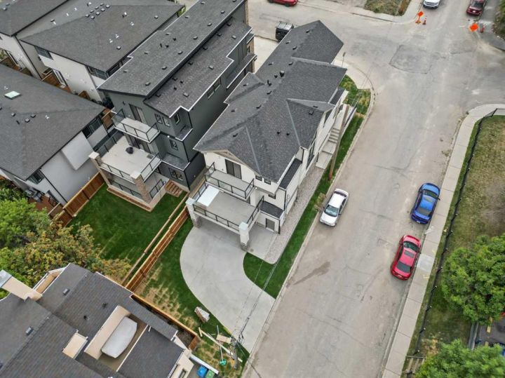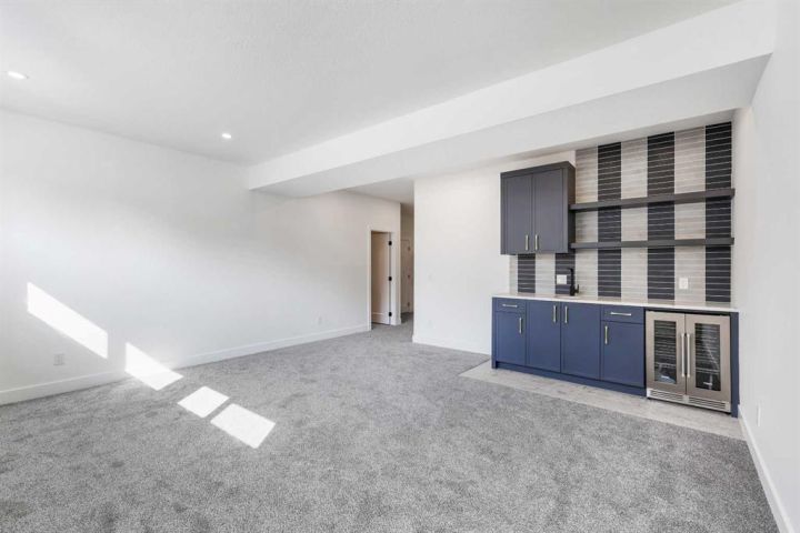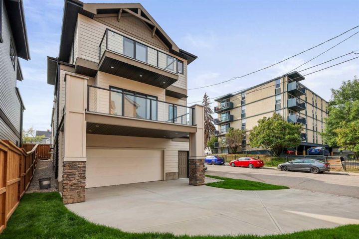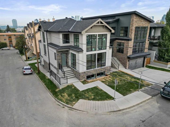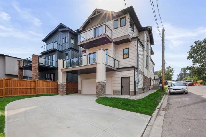 Welcome to 1516 22 Ave SW — a brand-new, luxurious infill offering panoramic Downtown views in the heart of Calgary’s highly sought-after Bankview neighborhood. With 3,465 square feet of meticulously crafted living space, this modern masterpiece boasts 4 spacious bedrooms, 4 designer bathrooms, and a stunning fusion of comfort, style, and sophistication. Step inside to soaring vaulted ceilings accented with rich wood tones, creating a warm and inviting atmosphere. The sun-drenched living room features custom built-ins, a dramatic stone gas fireplace, and expansive bay windows that frame the skyline. A versatile den or home office adds functional flexibility. The chef-inspired kitchen is a standout, equipped with premium GE Café appliances including a wall oven, gas cooktop, and microwave. Elegant quartz countertops, chic blue cabinetry, a generous island, and a handcrafted stone range hood are complemented by a crisp white tile backsplash. A dedicated wine cellar adds a touch of indulgence. The adjacent dining room is ideal for everyday meals or elegant entertaining. Upstairs, the serene primary suite offers a walk-in closet with custom built-ins and a luxurious 5-piece ensuite with a soaker tub, dual sinks, and a glass steam shower. Two additional bedrooms, each with their own walk-in closets, share a stylish 4-piece bathroom. Enjoy sweeping Downtown views from the private second-floor deck. The upper-level laundry room includes a washer, dryer, sink, and ample storage for added convenience. The fully developed walk-out basement is perfect for entertaining or relaxing, featuring a large family room, wet bar, guest bedroom, 3-piece bath, and generous storage. The oversized lot enhances the home’s spacious feel and natural flow. Perfectly positioned near 17th Avenue’s vibrant shops and restaurants, Marda Loop, Mount Royal University, and with easy access to Downtown, this extraordinary residence is more than a home — it’s a statement of modern luxury living.