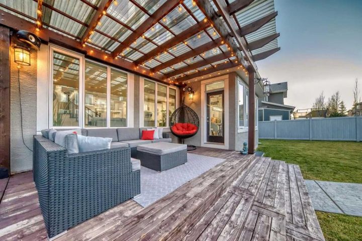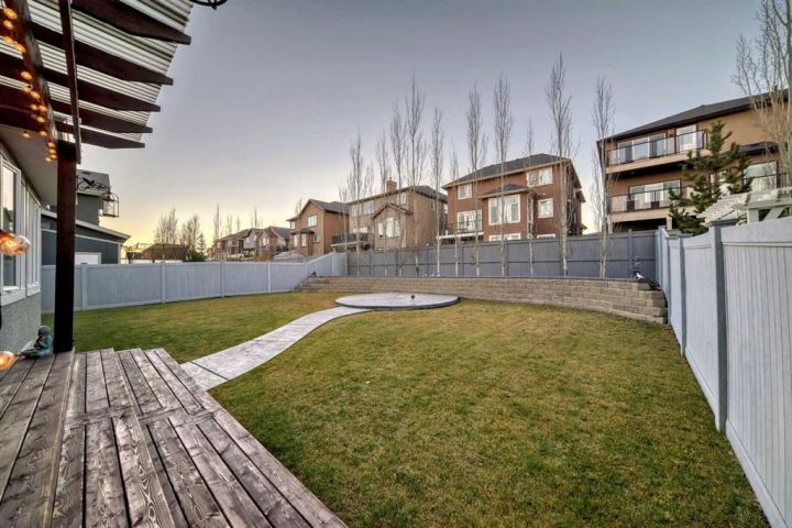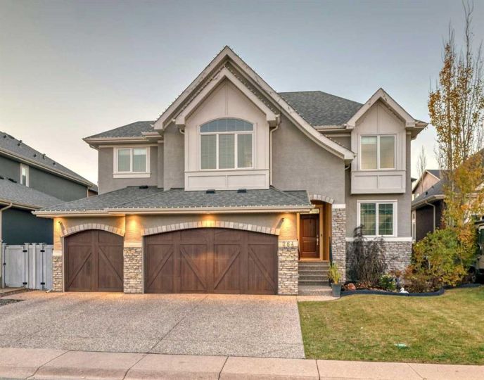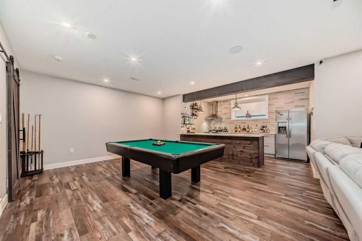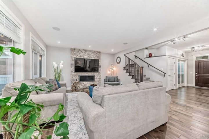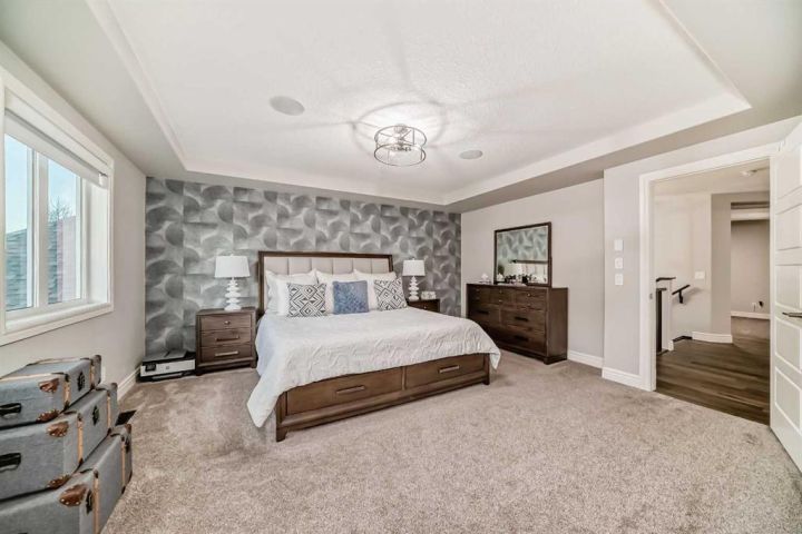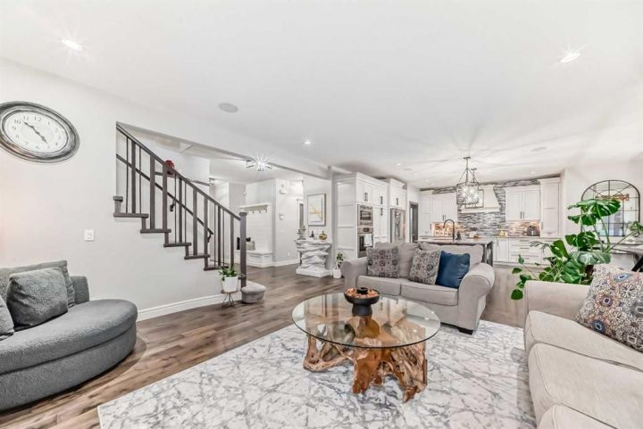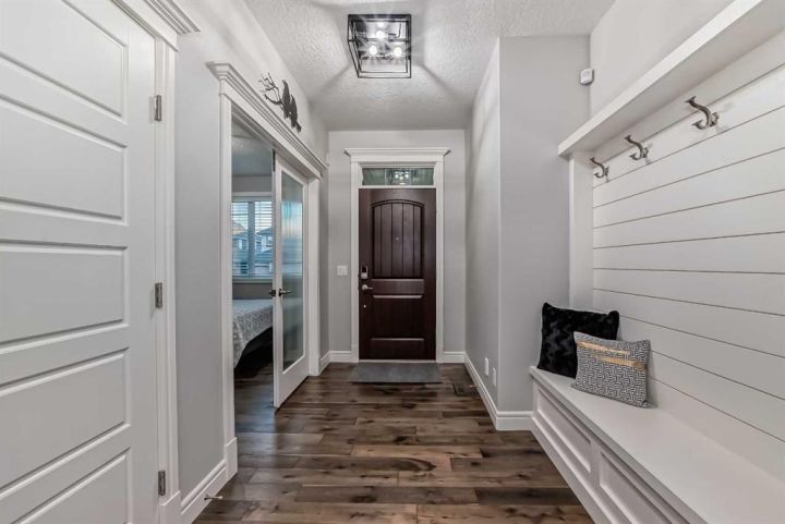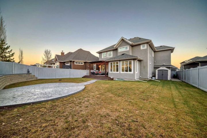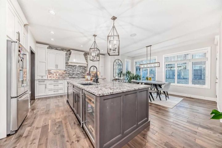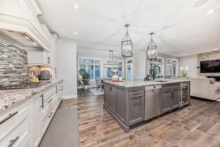 Welcome to this stunning executive home featuring a triple car garage and over 4,098 sq. ft. of beautifully designed living space. With 5 bedrooms, 4 bathrooms, and a main floor office, this residence is nestled on one of Chestermere’s most tranquil and sought-after streets. This home is loaded with high-end finishes and thoughtful upgrades, including new carpet, rich hardwood floors, granite countertops, upgraded and recessed lighting, and a chef’s kitchen outfitted with premium built-in Bosch stainless steel appliances. Additional features include two air conditioning units, central vacuum, built-in speakers, CCTV security cameras, a heated garage, and an exposed aggregate concrete driveway. As you step through the front door, you’re welcomed by a spacious foyer featuring a built-in bench and coat hooks. Just off the entry is a beautifully designed home office, perfectly placed for privacy and productivity. The main floor boasts an open-concept layout ideal for entertaining. The family room offers plenty of seating space and a cozy gas fireplace with a floor-to-ceiling stone surround. The chef’s kitchen is a dream, featuring Bosch built-in stainless-steel appliances, a gas cooktop with a custom hood fan canopy, granite counters, and a kitchen island with a built-in bar fridge for extra beverage storage. A walk-through butler’s pantry with a prep sink provides additional storage and connects seamlessly to the mudroom, which includes built-in cabinetry, a bench, and coat hooks. The dining area is located at the back of the home, filled with natural light from large windows and providing easy access to the backyard. A conveniently located 2-piece bathroom completes the main level. The backyard is a true outdoor retreat with a covered deck, a generous grassy area with mature trees, and a stamped concrete pathway leading to a separate patio with seating around a cozy fire pit — ideal for relaxing or entertaining guests. Upstairs, you'll find four generously sized bedrooms, each featuring custom-built walk-in closets. A bright and spacious bonus room with vaulted ceilings offers additional space for relaxation or play. The luxurious primary suite is the ultimate retreat with tray ceilings, a spa-inspired 5-piece ensuite that includes dual vanities, a freestanding soaker tub, a custom tile shower with bench, and a massive walk-in closet with custom built-ins. A full 4-piece bathroom and a well-placed laundry room complete the upper level. The fully finished basement is designed for entertaining, with 9-foot ceilings and a large open family and recreation area. A stylish wet bar includes an island with a fridge, stove, and dishwasher — perfect for hosting. The lower level also features a fifth bedroom and a modern 3-piece bathroom with a custom walk-in shower.