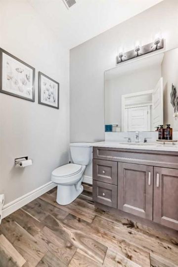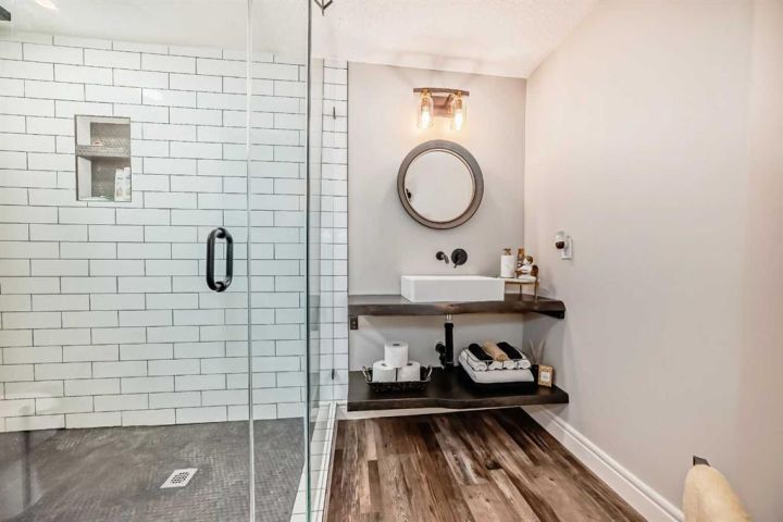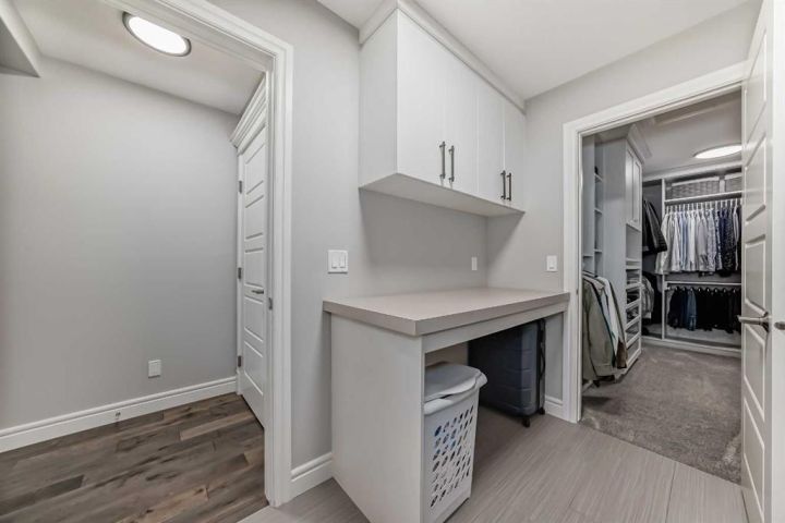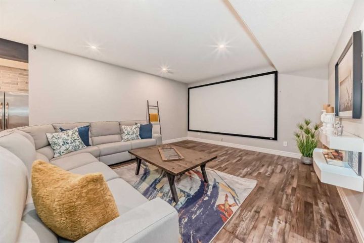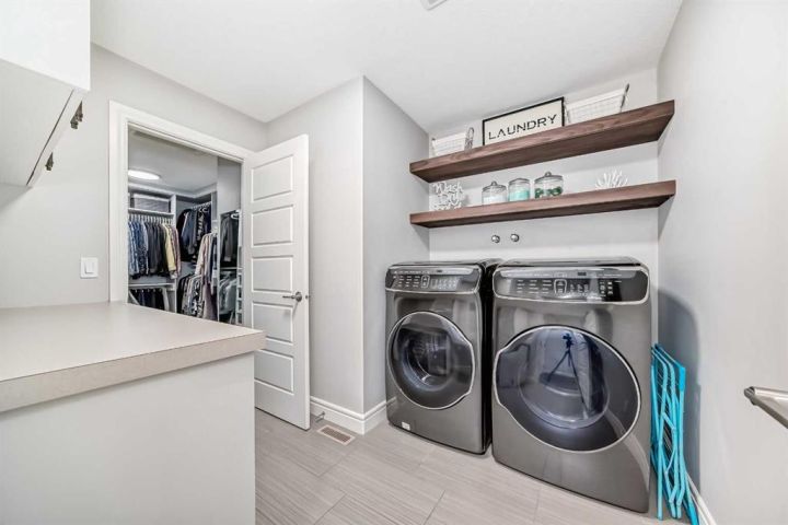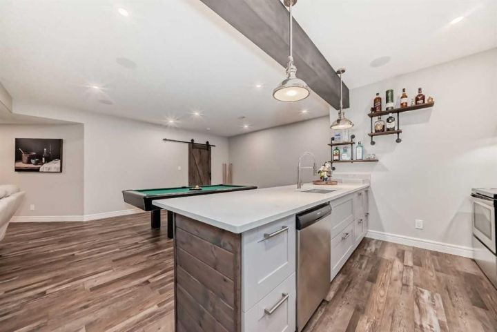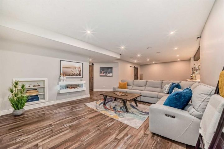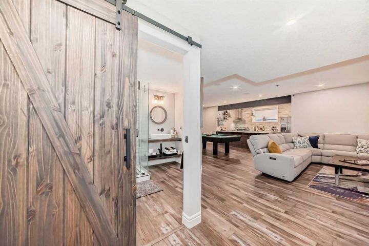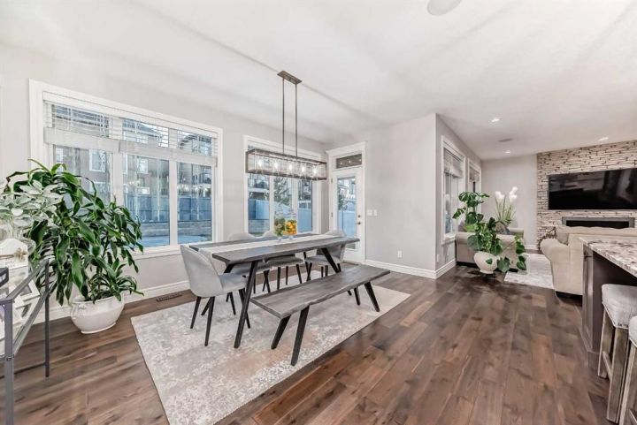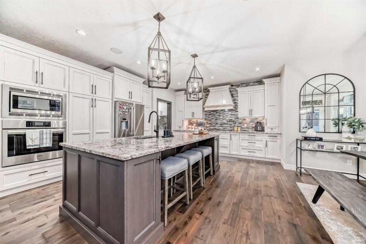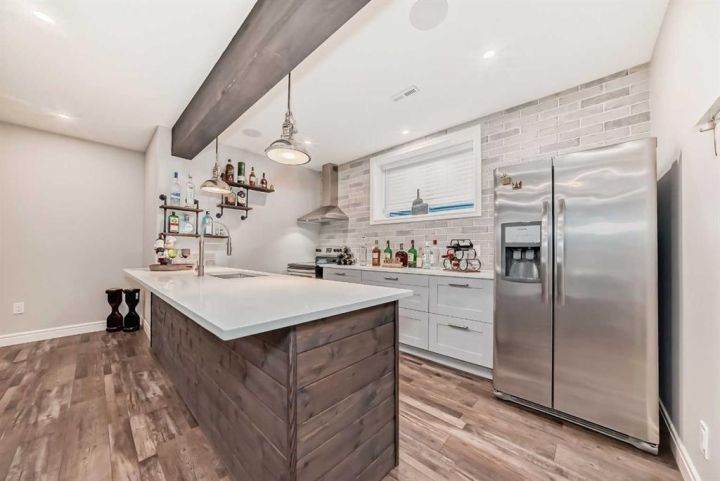 Welcome to this stunning executive home featuring a triple car garage and over 4,098 sq. ft. of beautifully designed living space. With 5 bedrooms, 4 bathrooms, and a main floor office, this residence is nestled on one of Chestermere’s most tranquil and sought-after streets. This home is loaded with high-end finishes and thoughtful upgrades, including new carpet, rich hardwood floors, granite countertops, upgraded and recessed lighting, and a chef’s kitchen outfitted with premium built-in Bosch stainless steel appliances. Additional features include two air conditioning units, central vacuum, built-in speakers, CCTV security cameras, a heated garage, and an exposed aggregate concrete driveway. As you step through the front door, you’re welcomed by a spacious foyer featuring a built-in bench and coat hooks. Just off the entry is a beautifully designed home office, perfectly placed for privacy and productivity. The main floor boasts an open-concept layout ideal for entertaining. The family room offers plenty of seating space and a cozy gas fireplace with a floor-to-ceiling stone surround. The chef’s kitchen is a dream, featuring Bosch built-in stainless-steel appliances, a gas cooktop with a custom hood fan canopy, granite counters, and a kitchen island with a built-in bar fridge for extra beverage storage. A walk-through butler’s pantry with a prep sink provides additional storage and connects seamlessly to the mudroom, which includes built-in cabinetry, a bench, and coat hooks. The dining area is located at the back of the home, filled with natural light from large windows and providing easy access to the backyard. A conveniently located 2-piece bathroom completes the main level. The backyard is a true outdoor retreat with a covered deck, a generous grassy area with mature trees, and a stamped concrete pathway leading to a separate patio with seating around a cozy fire pit — ideal for relaxing or entertaining guests. Upstairs, you'll find four generously sized bedrooms, each featuring custom-built walk-in closets. A bright and spacious bonus room with vaulted ceilings offers additional space for relaxation or play. The luxurious primary suite is the ultimate retreat with tray ceilings, a spa-inspired 5-piece ensuite that includes dual vanities, a freestanding soaker tub, a custom tile shower with bench, and a massive walk-in closet with custom built-ins. A full 4-piece bathroom and a well-placed laundry room complete the upper level. The fully finished basement is designed for entertaining, with 9-foot ceilings and a large open family and recreation area. A stylish wet bar includes an island with a fridge, stove, and dishwasher — perfect for hosting. The lower level also features a fifth bedroom and a modern 3-piece bathroom with a custom walk-in shower.