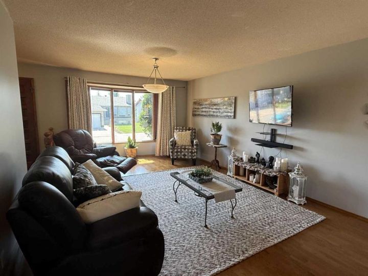 Welcome to this beautifully maintained 1,375 sq. ft. home, perfectly situated in one of Hanna’s most sought-after neighborhoods. With a fantastic kids’ park right next door and schools, shopping, and amenities all within walking distance, this property combines the best of family living and everyday convenience. Step inside and you’ll immediately notice the bright, open layout that makes this home so inviting. The main floor features a spacious living room with an adjoining dining area—ideal for family gatherings or entertaining guests. The kitchen is both functional and stylish, offering a walk-around island, ample counter space, and updated appliances. Large windows throughout the main floor allow sunlight to pour in, creating a warm and cheerful atmosphere. Many of the windows have been updated, ensuring both comfort and energy efficiency. Patio doors off the dining area lead you onto the back deck, where you can enjoy summer evenings grilling on the natural gas BBQ (included in the sale). Down the hall you’ll find thoughtful details designed for everyday ease: a 4-piece bathroom with extra storage and the convenience of main floor laundry. The primary suite is a true retreat, featuring a generous walk-in closet and private 3-piece ensuite. Two additional bedrooms on this level provide plenty of space for children, guests, or even a home office. The fully finished lower level is a true bonus, offering incredible versatility. The expansive open space is currently home to a pool table (included with the home) and plenty of room for entertaining, game nights, or cozy movie marathons. There’s also a great area for a home office, fitness setup, or hobby space—endless possibilities to suit your lifestyle. A bonus room (currently used as a bedroom), a 3-piece bathroom, and a large utility/storage room complete this level. This home has also seen important updates, including a brand-new hot water tank (Feb 2025) and an updated furnace for peace of mind. Outdoors, you’ll love the low-maintenance landscaping that lets you spend more time enjoying your yard and less time maintaining it. The property features a double garage, plus an additional parking pad with plenty of room for your RV, boat, quads, or other recreational toys. From its thoughtful floor plan and sun-filled living spaces to its prime location and updated mechanicals, this home truly has it all. Don’t miss your chance to make it yours—contact your REALTOR® today to schedule your private showing!