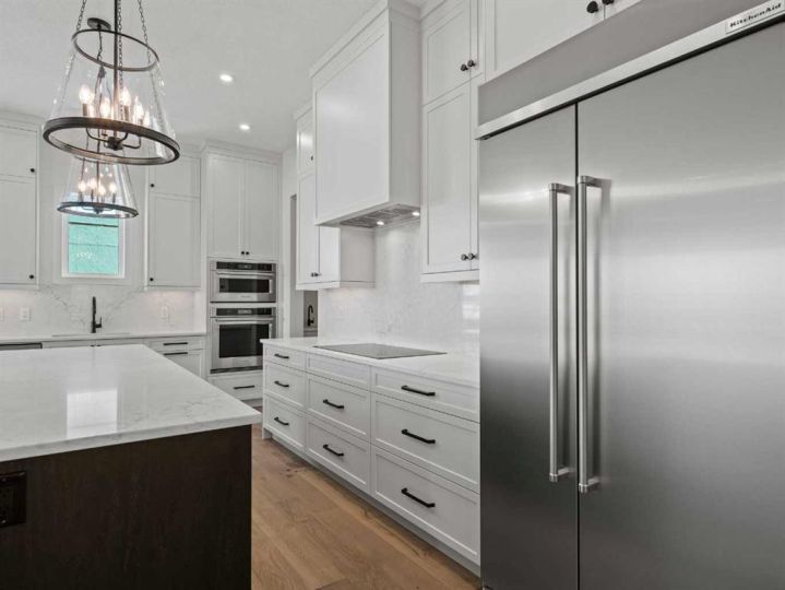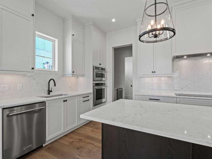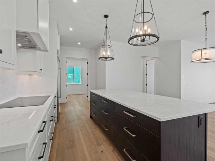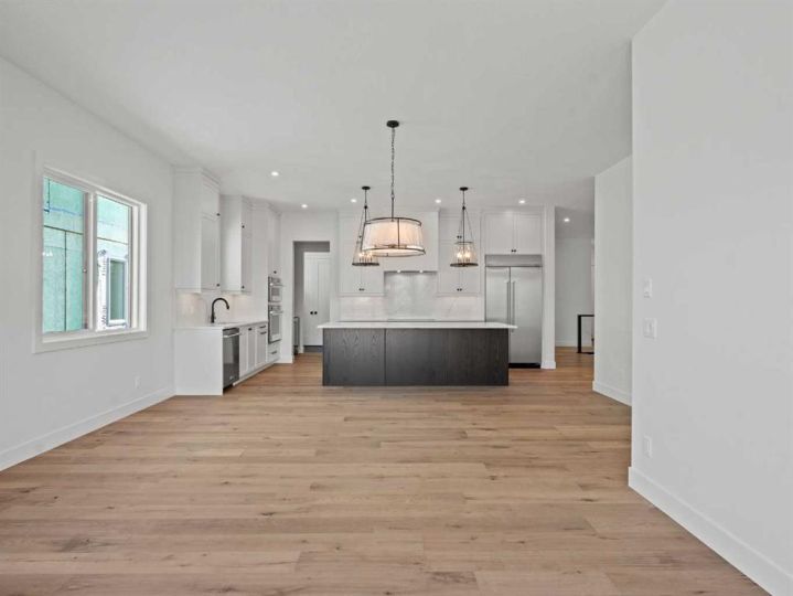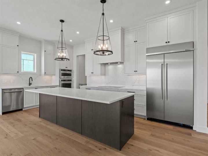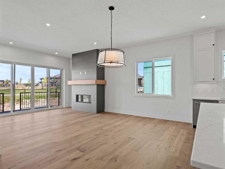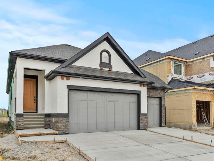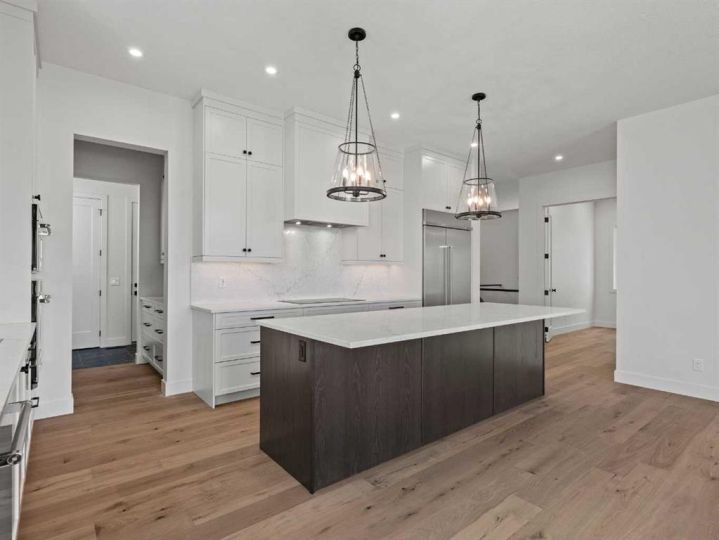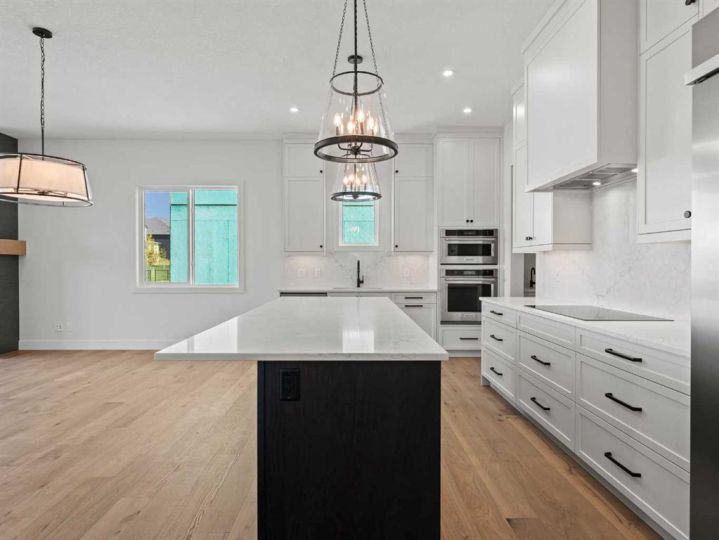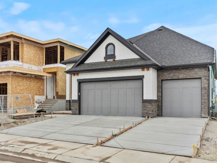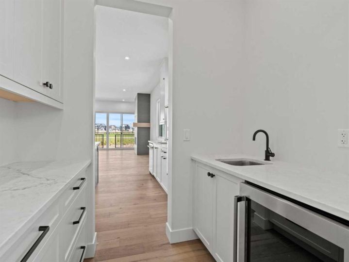 Nestled in the heart of Calgary's prestigious Mahogany Estates, this brand-new custom-built, 3,200 sq ft bungalow by Baywest Homes redefines lakeside living. With exclusive access to a semi-private dock and beach, this home offers an unparalleled lifestyle in one of the city's most sought-after lake communities. The main level, spanning nearly 1,700 square feet, boasts soaring nine-foot ceilings and wide plank luxury hardwood flooring in natural wood tones, creating a warm and inviting ambiance. The open-concept design seamlessly integrates the living, dining, and kitchen areas, making it perfect for both entertaining and everyday living. The kitchen is a chef's dream, featuring full-height white cabinetry, a striking oversized dark island, and a high-end appliance package that includes a high-end Kitchen Aid fridge-freezer and built-in oven with a convention microwave. Quartz countertops extend as a sleek backsplash, complemented by designer lighting and a butler’s pantry equipped with a bar sink and beverage fridge. The living room, with its elegant feature fireplace, opens onto a north-facing deck overlooking serene green space, complete with a gas line for effortless outdoor grilling. The master suite is a private retreat, offering a spa-like en-suite with heated tile floors, an oversized shower, a freestanding soaker tub, dual vanities, and a private water closet. A spacious walk-in closet and adjacent laundry room add to the convenience and luxury of this space. The main floor also includes a private office with glass French doors, a well-appointed mudroom, and a walk-in closet. Descending to the fully finished basement, you'll find a large recreation room, a family room, two generously sized bedrooms, and a full bathroom with heated floors. The home is thoughtfully designed with ample storage and numerous upgrades, including tankless hot water and triple-paned windows. The attached triple garage, with its 14-foot ceilings, offers ample space for a car lift and is equipped with 220V for a vehicle charging station. This property is a masterpiece of design and functionality, offering the perfect blend of luxury, comfort, and convenience. With its prime location and exclusive amenities, lakeside living in Mahogany has never been more enticing.