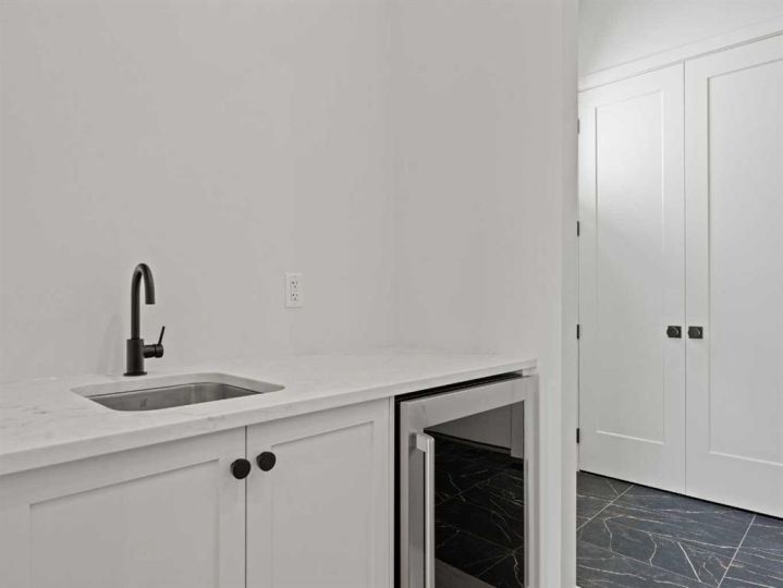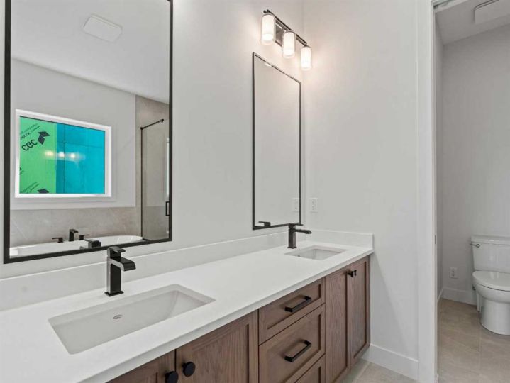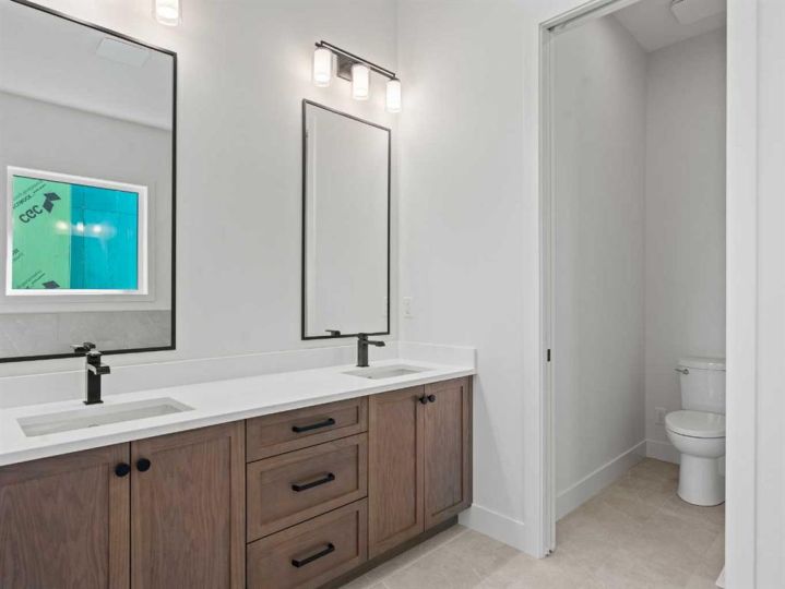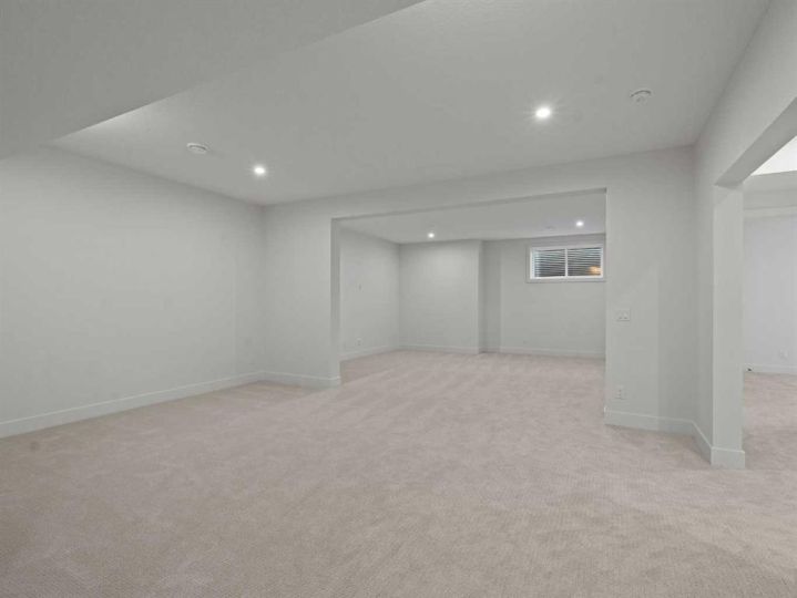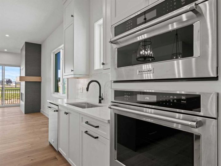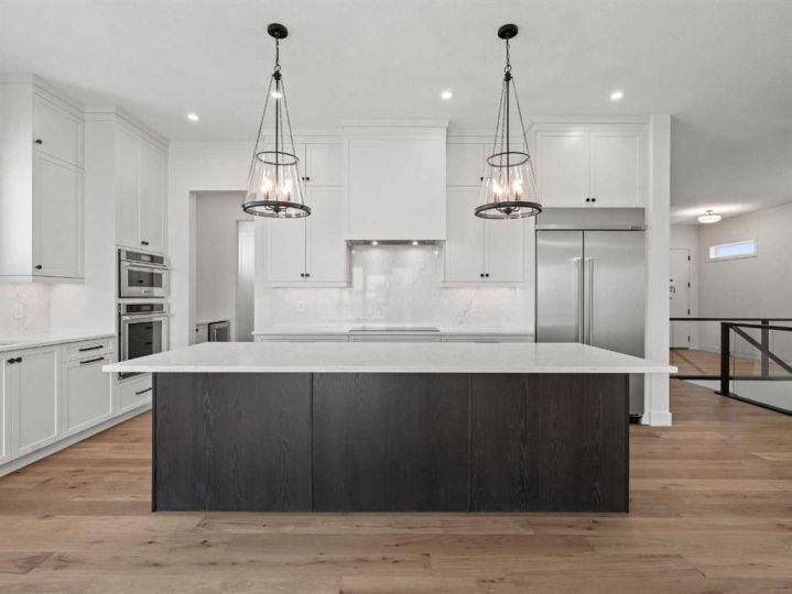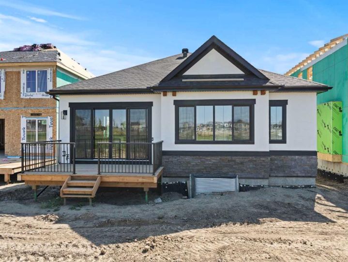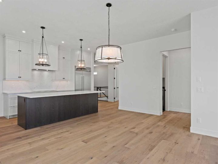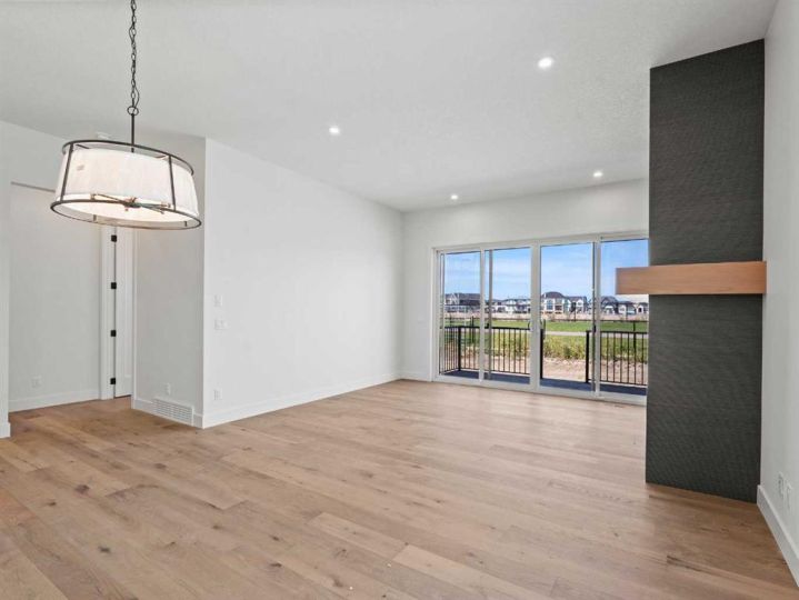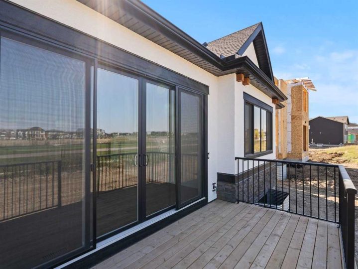 Nestled in the heart of Calgary's prestigious Mahogany Estates, this brand-new custom-built, 3,200 sq ft bungalow by Baywest Homes redefines lakeside living. With exclusive access to a semi-private dock and beach, this home offers an unparalleled lifestyle in one of the city's most sought-after lake communities. The main level, spanning nearly 1,700 square feet, boasts soaring nine-foot ceilings and wide plank luxury hardwood flooring in natural wood tones, creating a warm and inviting ambiance. The open-concept design seamlessly integrates the living, dining, and kitchen areas, making it perfect for both entertaining and everyday living. The kitchen is a chef's dream, featuring full-height white cabinetry, a striking oversized dark island, and a high-end appliance package that includes a high-end Kitchen Aid fridge-freezer and built-in oven with a convention microwave. Quartz countertops extend as a sleek backsplash, complemented by designer lighting and a butler’s pantry equipped with a bar sink and beverage fridge. The living room, with its elegant feature fireplace, opens onto a north-facing deck overlooking serene green space, complete with a gas line for effortless outdoor grilling. The master suite is a private retreat, offering a spa-like en-suite with heated tile floors, an oversized shower, a freestanding soaker tub, dual vanities, and a private water closet. A spacious walk-in closet and adjacent laundry room add to the convenience and luxury of this space. The main floor also includes a private office with glass French doors, a well-appointed mudroom, and a walk-in closet. Descending to the fully finished basement, you'll find a large recreation room, a family room, two generously sized bedrooms, and a full bathroom with heated floors. The home is thoughtfully designed with ample storage and numerous upgrades, including tankless hot water and triple-paned windows. The attached triple garage, with its 14-foot ceilings, offers ample space for a car lift and is equipped with 220V for a vehicle charging station. This property is a masterpiece of design and functionality, offering the perfect blend of luxury, comfort, and convenience. With its prime location and exclusive amenities, lakeside living in Mahogany has never been more enticing.