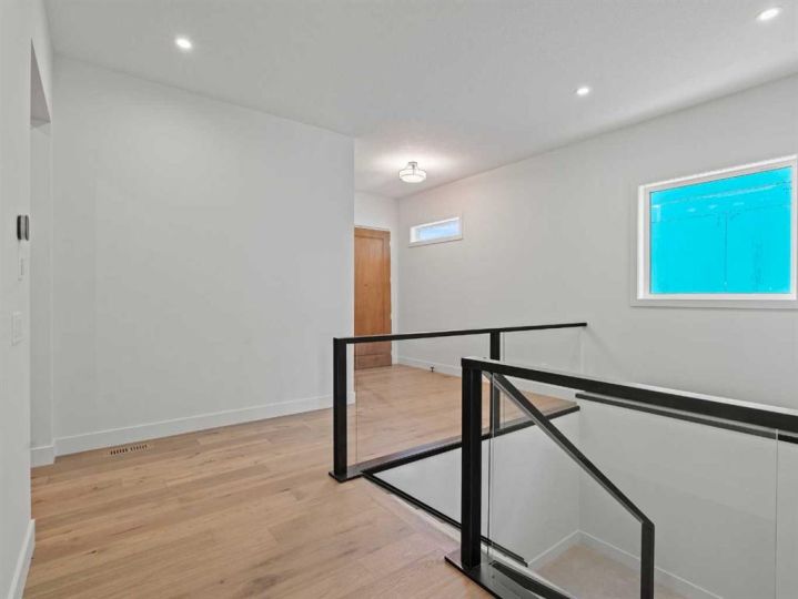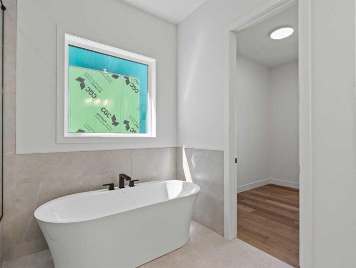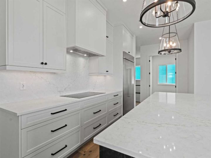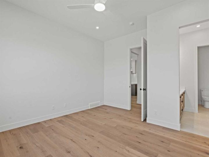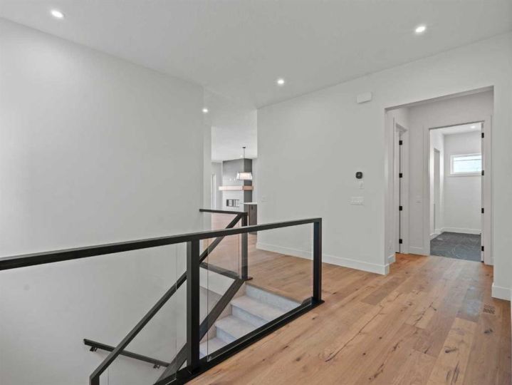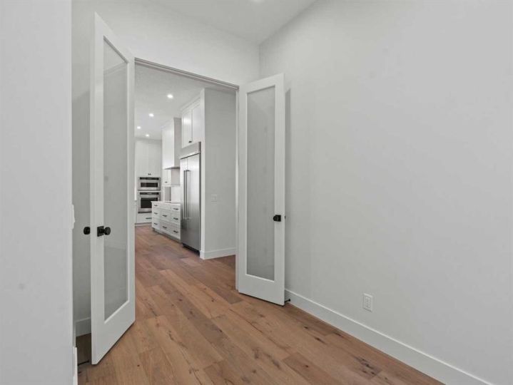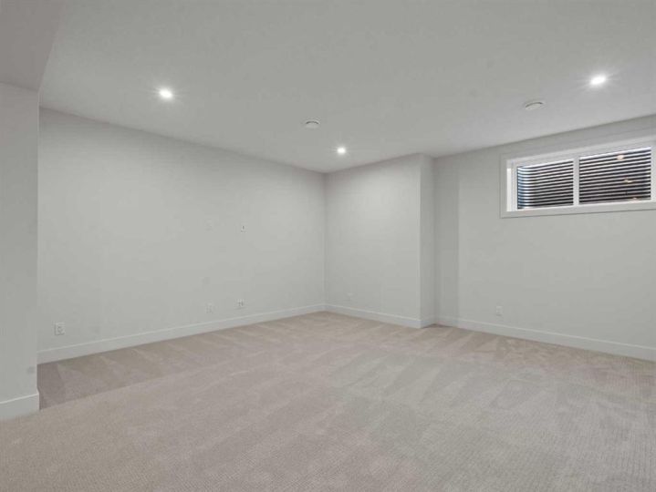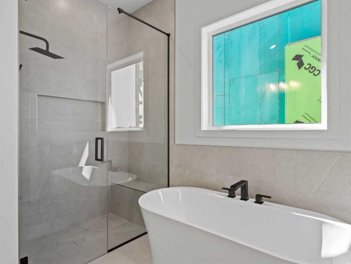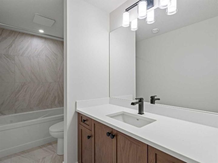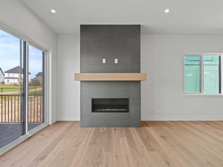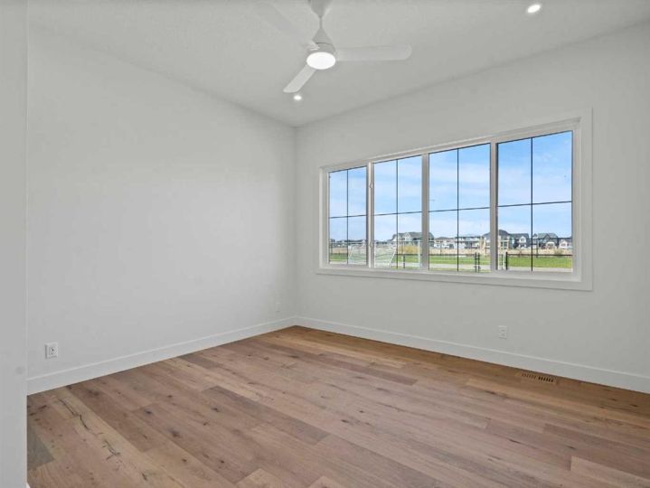 Nestled in the heart of Calgary's prestigious Mahogany Estates, this brand-new custom-built, 3,200 sq ft bungalow by Baywest Homes redefines lakeside living. With exclusive access to a semi-private dock and beach, this home offers an unparalleled lifestyle in one of the city's most sought-after lake communities. The main level, spanning nearly 1,700 square feet, boasts soaring nine-foot ceilings and wide plank luxury hardwood flooring in natural wood tones, creating a warm and inviting ambiance. The open-concept design seamlessly integrates the living, dining, and kitchen areas, making it perfect for both entertaining and everyday living. The kitchen is a chef's dream, featuring full-height white cabinetry, a striking oversized dark island, and a high-end appliance package that includes a high-end Kitchen Aid fridge-freezer and built-in oven with a convention microwave. Quartz countertops extend as a sleek backsplash, complemented by designer lighting and a butler’s pantry equipped with a bar sink and beverage fridge. The living room, with its elegant feature fireplace, opens onto a north-facing deck overlooking serene green space, complete with a gas line for effortless outdoor grilling. The master suite is a private retreat, offering a spa-like en-suite with heated tile floors, an oversized shower, a freestanding soaker tub, dual vanities, and a private water closet. A spacious walk-in closet and adjacent laundry room add to the convenience and luxury of this space. The main floor also includes a private office with glass French doors, a well-appointed mudroom, and a walk-in closet. Descending to the fully finished basement, you'll find a large recreation room, a family room, two generously sized bedrooms, and a full bathroom with heated floors. The home is thoughtfully designed with ample storage and numerous upgrades, including tankless hot water and triple-paned windows. The attached triple garage, with its 14-foot ceilings, offers ample space for a car lift and is equipped with 220V for a vehicle charging station. This property is a masterpiece of design and functionality, offering the perfect blend of luxury, comfort, and convenience. With its prime location and exclusive amenities, lakeside living in Mahogany has never been more enticing.