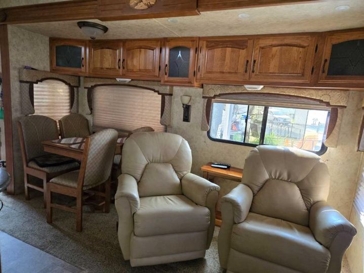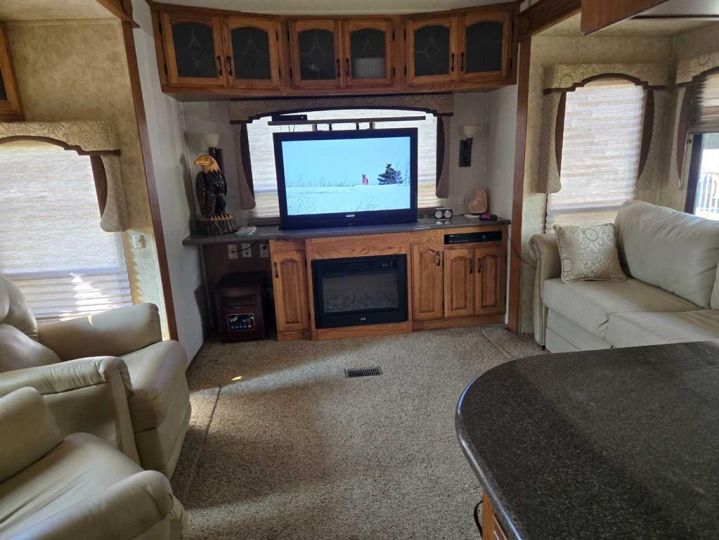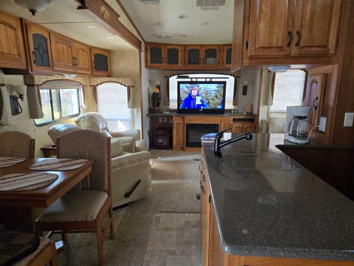 Fridge, stove, microwave, queen bed, hide-a-bed, 2 reclining chairs, 3 TV's, electric fireplace, table & 4 chairs, BBQ, 2nd Fridge, deck, awning, shed