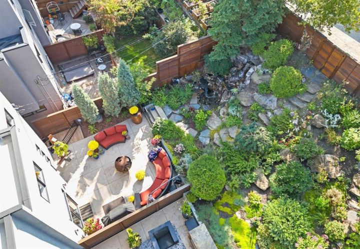 - Back Lane, Back Yard, City Lot, Garden, Landscaped, Private, Rectangular Lot, Sloped Down, Underground Sprinklers, Waterfall