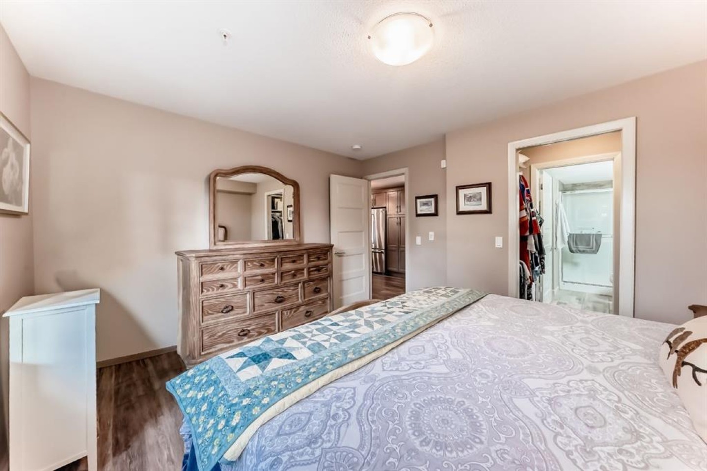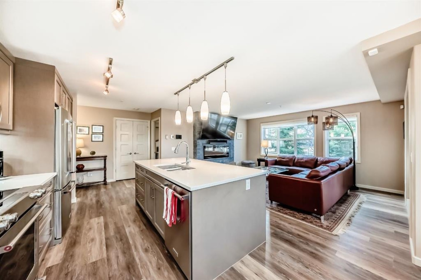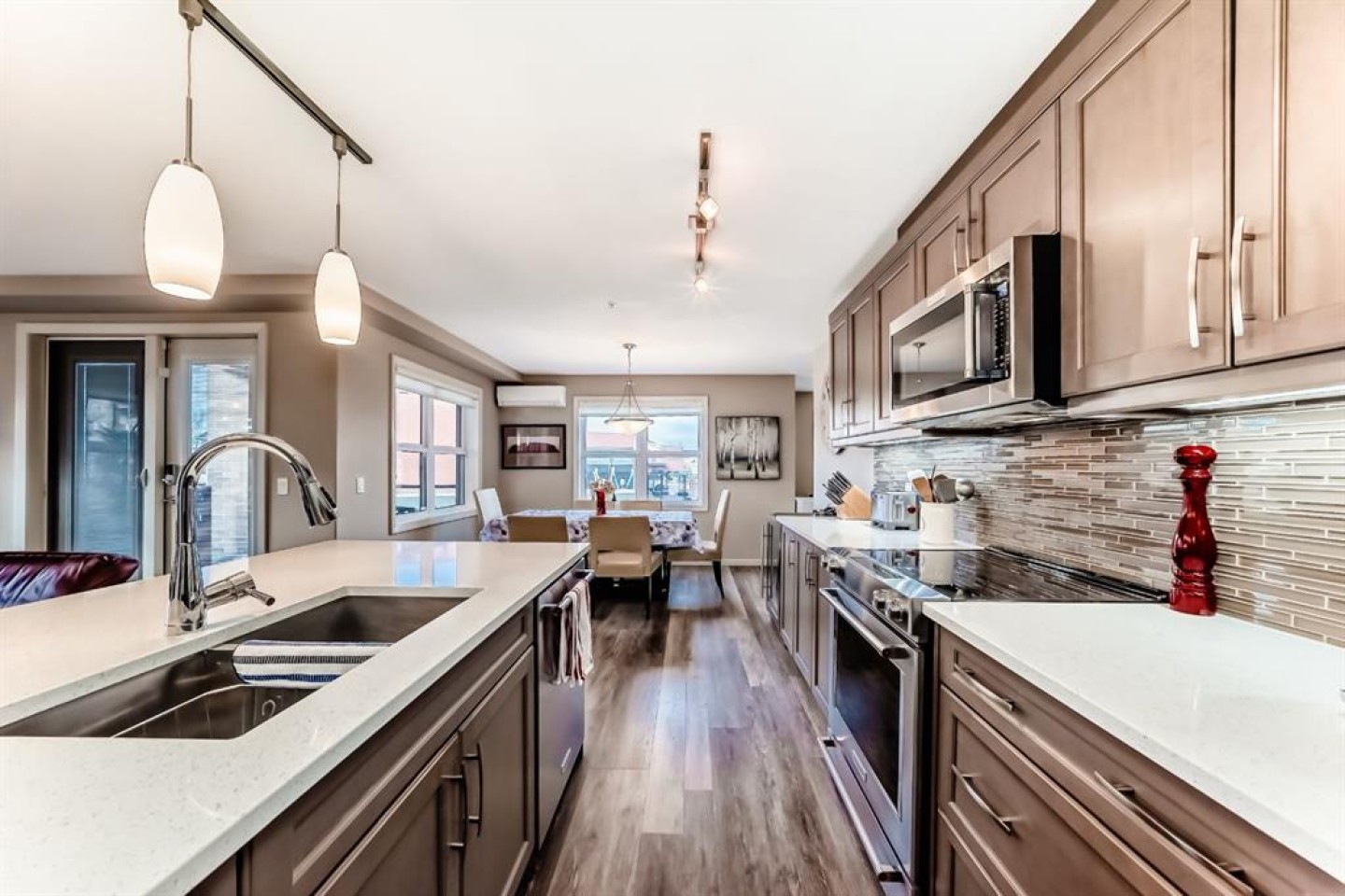 Welcome to The Chateaux at King’s Heights — Airdrie’s premier 55+ condominium, where luxury, comfort, and convenience come together. This exceptional corner suite is the LARGEST unit in the building, showcasing two spacious bedrooms, a bright den, and a sun-soaked south-facing layout designed for elegance and ease. Every detail has been elevated with the Alto Premium Upgrade Package and over $35,000 in additional enhancements, including upgraded tile and cabinetry, luxury vinyl plank flooring, a stunning floor-to-ceiling stone gas fireplace, in-floor radiant heating, air conditioning, a garburator, and a full alarm system with window and door sensors plus keypad entry on both exterior doors. The gourmet kitchen features solid maple shaker cabinetry, energy-efficient stainless-steel appliances, a 21-cu.-ft. refrigerator with glass shelving, and quartz countertops that flow seamlessly into the open-concept dining and living area. Oversized windows flood the space with natural light, high ceilings and a large south-facing balcony with a natural gas BBQ hookup create an airy, inviting retreat. Both bedrooms are generously sized, with the primary bedroom offering a walk-through closet and private 3-piece ensuite complete with a vanity and spa-inspired finishes. The versatile den provides extra space for an office or flex use, and the in-suite laundry includes custom built-in shelving for added storage. Enjoy the convenience of TWO TITLED parking stalls — one secure underground heated stall with an attached private storage locker and a second titled outdoor stall (valued at $9,500). The building offers secure underground access, bike storage, a beautifully landscaped courtyard, and a well-maintained common area with elevator service, a welcoming lobby, and pressurized hallways for quiet, comfortable living. Perfectly located in the heart of King’s Heights, this address offers the best of Airdrie right at your doorstep. Stroll to Save-On-Foods, Shoppers Drug Mart, local banks, and everyday conveniences — or meet friends for coffee at La Table or Starbucks, a glass of wine or dinner at Abes, Vapiano Cucina Italian or dessert at just down the street. Nearby, you’ll find a gym/yoga studio, salons, dental and medical clinics, and beautiful walking paths and ponds that wind through the community. Known for its friendly residents, social gatherings, and worry-free lifestyle, The Chateaux offers the perfect balance of elegance, practicality, and community.