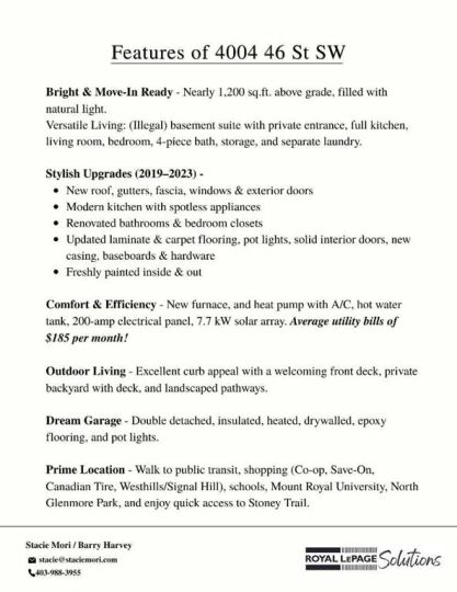 Come and enjoy this Move-in-Ready Home... Beaming with natural light, this 2 storey home in Glamorgan features a one bedroom basement suite (illegal) and major upgrades between 2019 and 2023. New roof (2019), gutters, facia, windows & exterior doors, new kitchen & appliances, bathrooms, bedroom closets, laminate flooring and carpet, pot lights throughout, solid interior doors, casings, baseboards, hardware, freshly painted inside and out! I forgot to mention... heat pump, new furnace, hot water tank and 200amp electrical panel! The 7.7kW solar array & heat pump keeps utility costs and your carbon footprint low with overall average utility bills of just $185/month, including AC! This home’s cost of ownership is truly remarkable (inquire for more info!). Put your energy savings into your mortgage and see the advantages! Great curb appeal greets visitors with a beautiful first impression on the cozy front deck, shaded by the front yard tree. Inside you are welcomed by a handy entrance that leads you to a comfortable living room with a vaulted ceiling and wood-burning fireplace. The bright, modern kitchen offers lots of counter space, cupboard storage, and spotless appliances. The roomy dining area leads to livable deck space & private back yard. A generously proportioned concrete path takes you to the double detached garage which is insulated, heated and drywalled, with an epoxy floor & bright pot lights. The upper level has a new bathroom, two bedrooms with space-efficient closets giving a boost of colour. The lower level features a separate entrance, large windows, 2nd kitchen and living room, a 3rd bedroom, and a 4 pc bath, plenty of storage plus a separate laundry! Offset your mortgage by renting the lower level or enjoy the additional space as a larger family home. All of this within walking distance public transit, shopping, schools, cafes, off leash area, parks, close proximity to North Glenmore Park / Reservoir, Mount Royal University and quick access to Stoney Trail!