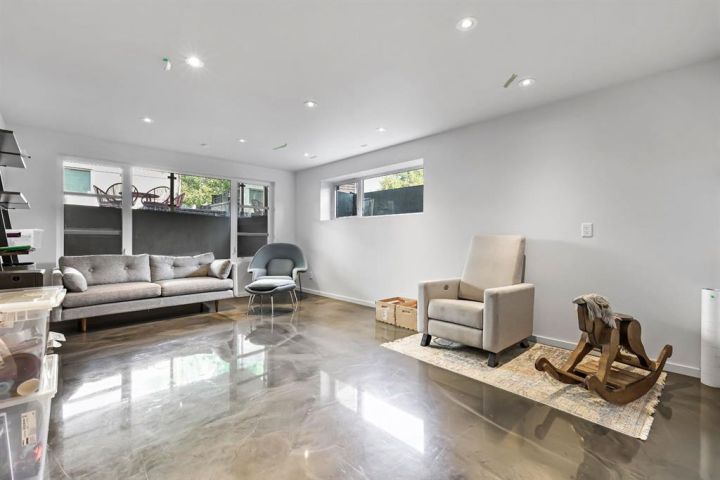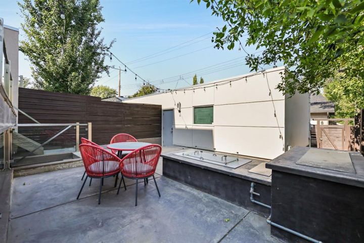 The backyard retreat offers a spacious patio perfect for barbecues, al fresco dining, and evenings around the fire table.