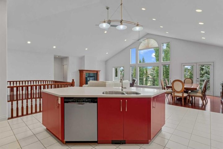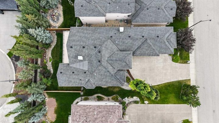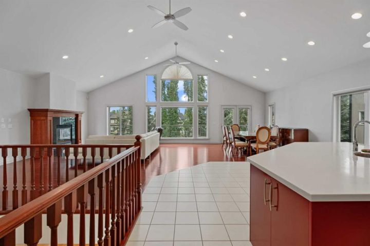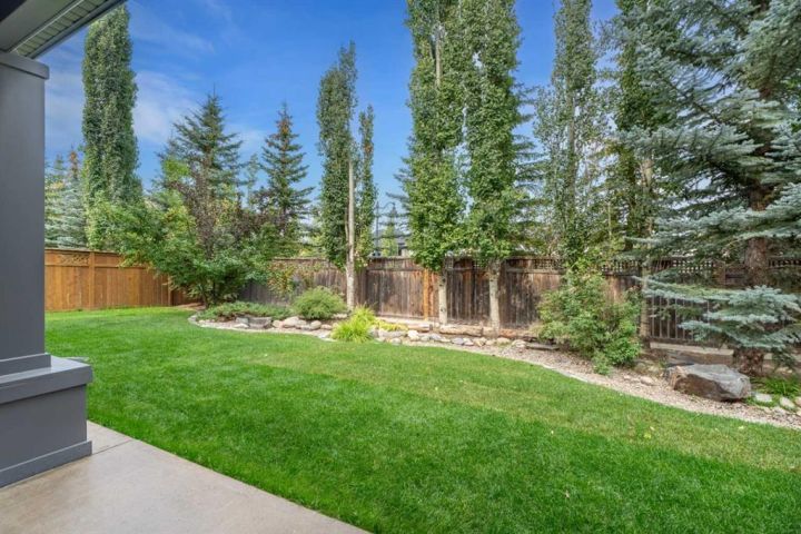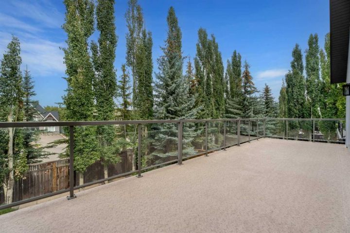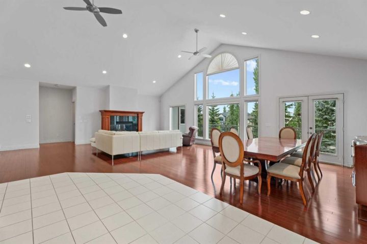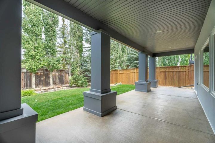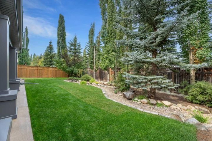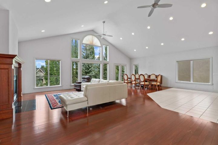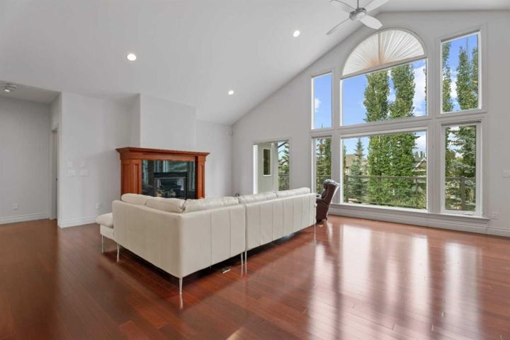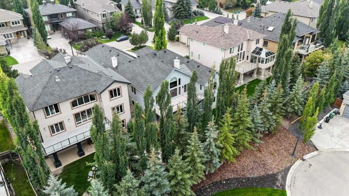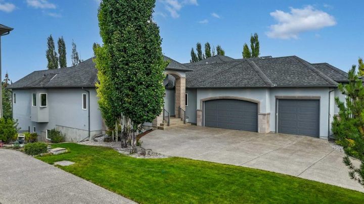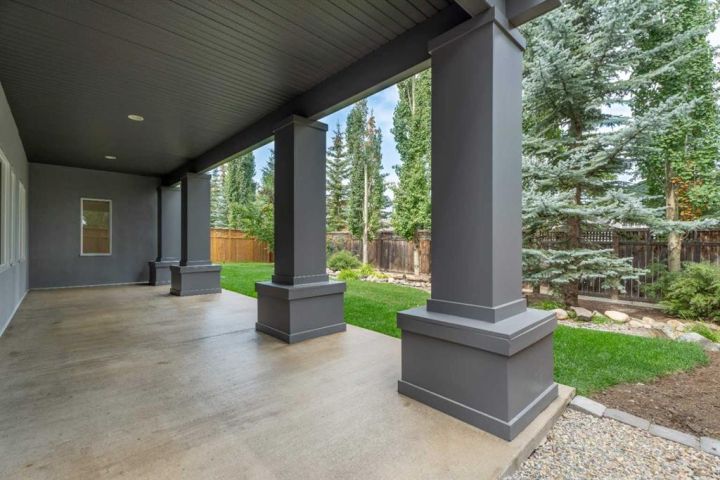 Welcome to this exceptional estate residence in the prestigious community of Aspen, perfectly situated on a beautifully landscaped 8,471 sq. ft. lot that offers privacy, mature trees, and no homes directly behind. This immaculate bungalow showcases timeless craftsmanship with over 4,600 sq. ft. of living space, thoughtfully designed for both everyday comfort and elegant entertaining. From the moment you arrive, the home makes a statement with its oversized triple garage, a newly refinished driveway with ample room for additional parking, and stunning curb appeal that sets the tone for what’s inside. Step into the main level where soaring vaulted ceilings and expansive windows create a bright, airy atmosphere that is both warm and inviting. The open floor plan flows seamlessly between the living, dining, and kitchen areas, highlighted by a large deck that extends the living space outdoors and overlooks the lush, private backyard. A spacious front office with a nearby 4-piece bath provides the ideal work-from-home setup or easily functions as a second main-floor bedroom. The primary retreat is tucked away for privacy and comfort, featuring a generous 5-piece ensuite with dual vanities, a separate soaker tub and shower, and a private water closet. A large laundry and mudroom with sink adds practicality, while the thoughtful layout ensures convenience throughout. The professionally developed walkout basement nearly doubles the living space, offering a massive recreation and games room perfect for family gatherings or entertaining guests. Comfort is paramount with two dedicated in-floor heating zones—one for the bedroom wing, which includes two spacious bedrooms and a 4-piece bathroom, and another for the expansive recreation space. A freshly sealed lower-level patio opens onto the meticulously maintained backyard, where mature landscaping, newer fencing, and carefully designed outdoor spaces create a peaceful oasis. Additional highlights of this home include central air conditioning for year-round comfort, a water softener, built-in central vacuum with attachments, and abundant storage space. Every detail reflects the pride of ownership and meticulous care that has gone into maintaining this home. Combining an enviable location in Aspen’s sought-after estate area with a rare blend of space, privacy, and elegance, this residence offers a truly unique opportunity to own a forever home in one of Calgary’s premier communities.