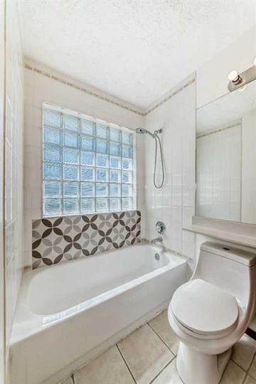 The primary bedroom includes a walk-in closet and a full ensuite bath, while additional bedrooms are bright and comfortable. Both bathrooms showcase timeless white tile finishes, one highlighted by a decorative glass-block window that adds both light and privacy.