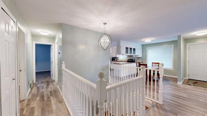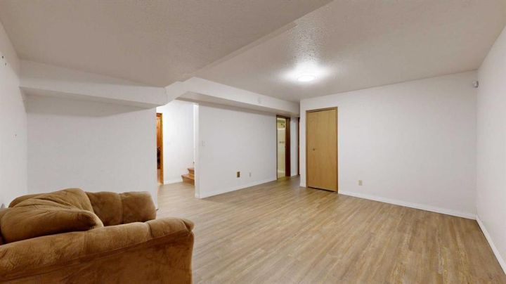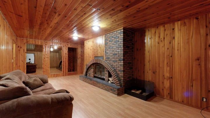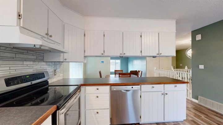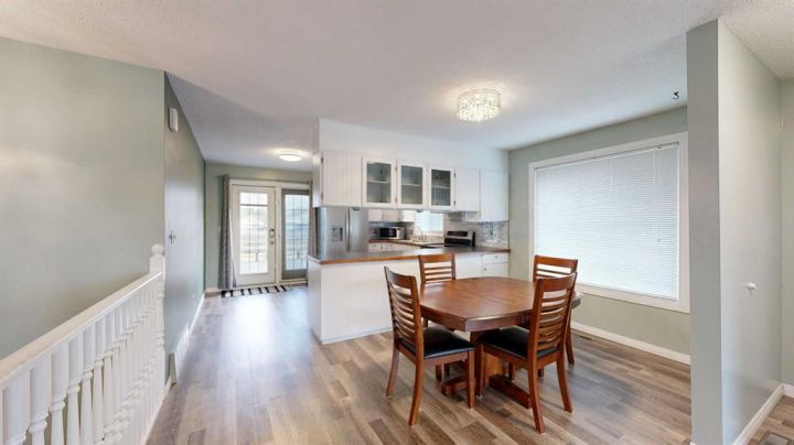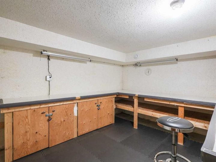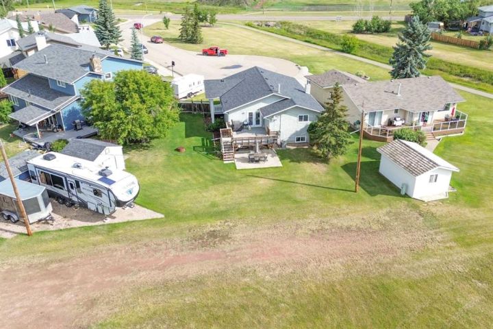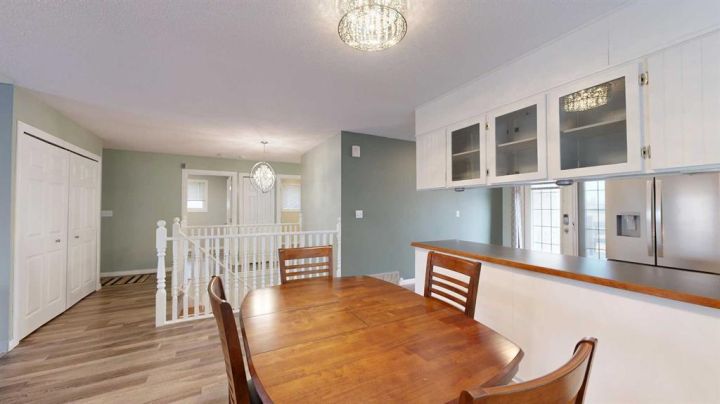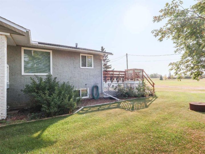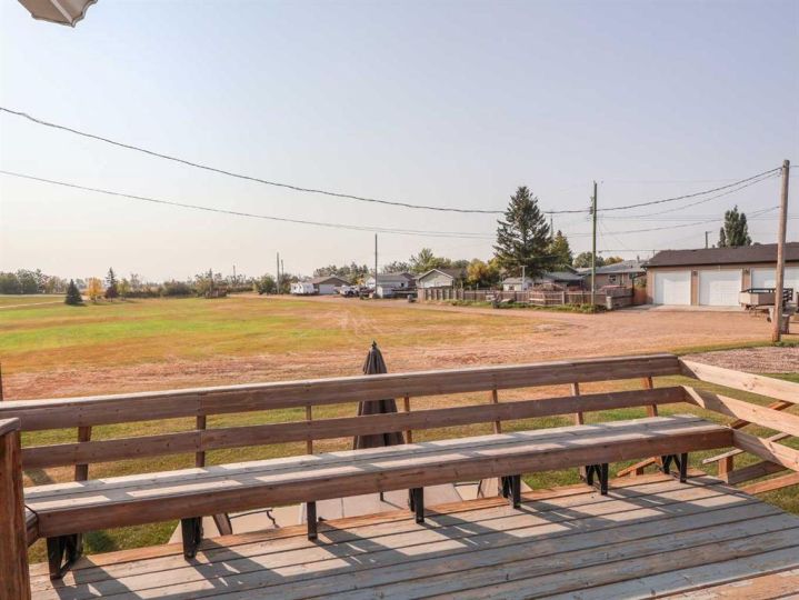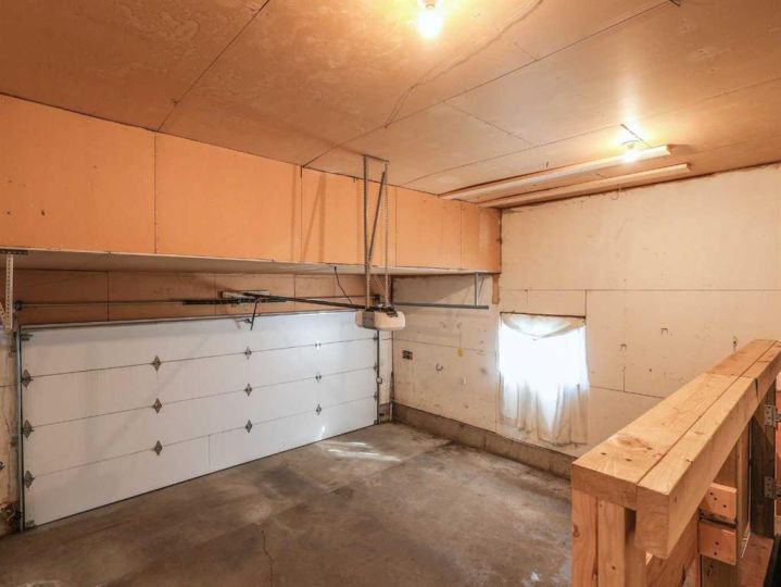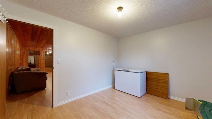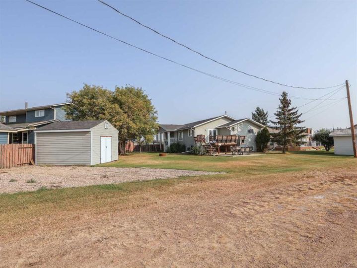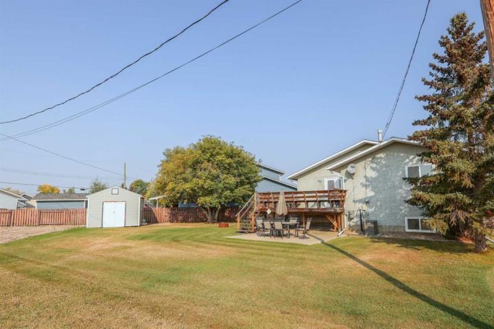 This amazing property sits on the edge of town and has dedicated green space in nearly every direction you look. This oversized, pie-shaped lot offers plenty of space for a family of any size to grow and set down roots. Inside, the home’s layout offers versatile spaces for relaxation and entertainment. Wood-look vinyl plank flooring throughout much of the home adds warmth and elegance, while large windows bathe the interior in natural light. The living room faces the crescent and is open to the dining room. The seamless flow to the kitchen allows for easy entertaining and daily life. The bright kitchen is equipped with white cabinets, modern stainless-steel appliances, and garden doors. The three bedrooms are well-proportioned, with the primary bedroom offering extra space for furniture. The bathroom blends functionality with style, featuring a walk-in shower with glass and tile surround. Central air conditioning is an added bonus on the hot summer days, keeping this home comfortable. Heading downstairs, there is a family room done in knotty pine tongue and groove and has a unique brick fireplace with a nook for firewood. There is a storage room further back and the mechanical room/laundry room with front load washer and dryer. Next, there is a multi-purpose room with space for gym equipment, games, kids toys, etc. There is a bedroom and a 3-pc bathroom conveniently beside it. There is a workroom with cabinets, countertops, shelving, and task lighting to appease your tinkering and crafting hobbies. Outside, the double garage has a cement pad in front for off-street parking. The roof overhangs the sidewalk to the main door, keeping you out of the elements. Heading to the backyard, the garden doors take you to a huge deck with built in, bench seating and an unobstructed view of the green space behind the property. The yard is partially fenced and has shrub beds along the home’s foundation. There is a cement pad for patio furniture but it is also large enough for the hot tub you have been dreaming about. In addition, the backyard has a fire pit, a nice sized garden shed, and a tidy gravel parking pad for a large RV. The location of this home provides a balance of community accessibility and residential comfort.