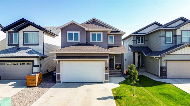 Welcome to 563 Moonlight Lane, a modern home in the thriving community of West Lethbridge. The main floor is open and filled with natural light, thanks to extra-large windows that make the living room, dining area, and kitchen feel bright and inviting. The spaces flow effortlessly, allowing you to cook, visit, and stay connected with everyone at the same time. The kitchen combines style and function with rich cabinetry, a tile backsplash, and wood-grain flooring, adding a warm, welcoming touch. Upstairs, the primary suite is a cozy retreat with its own three-piece ensuite, while two additional bedrooms, a full bath, and laundry area keep everyday family life practical and convenient. The walkout basement is a bright blank canvas ready to be customized, opening onto a covered patio and a spacious backyard with alley access. Additional features include central air conditioning for year-round comfort and convenience of a gas line already plumbed into the garage, should you decide to add a heater. This home is spotless, move-in ready, and still feels like new. Best of all, it’s located in one of the most family-friendly neighborhoods in Lethbridge, just steps from a green space, playground, and excellent schools. It’s the kind of community you’ll be happy to come home to.