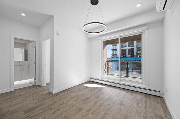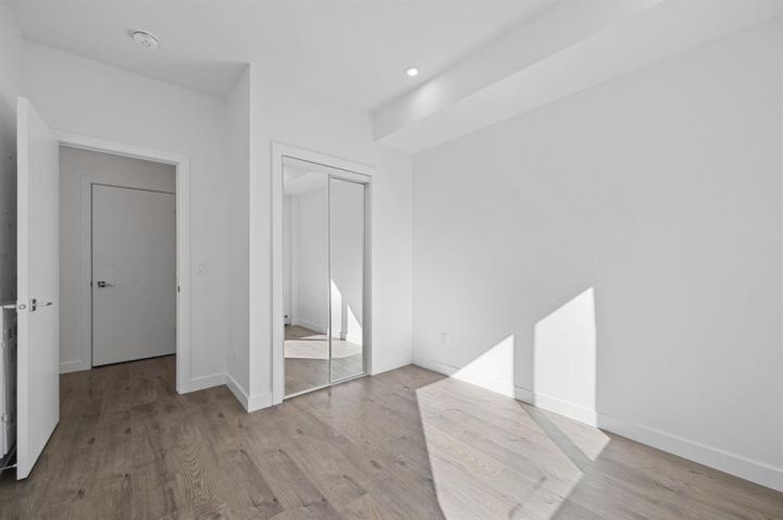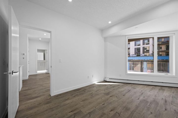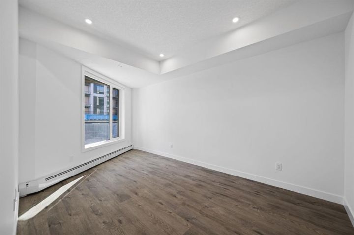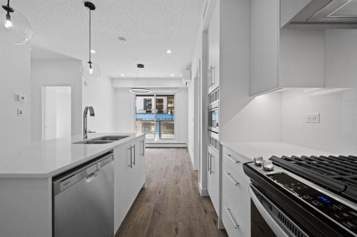 Nestled in the vibrant West District, Mondrian offers a perfect balance of style, functionality, and modern urban living. This 2-bedroom, 2-bathroom + den residence is thoughtfully designed to maximize space while maintaining an inviting, upscale atmosphere—perfect for those who appreciate both comfort and convenience. From the moment you step inside, the open-concept layout creates a seamless flow between the chef-inspired kitchen, dining, and living areas. Premium finishes and high-end appliances—including an integrated refrigerator, gas range, and built-in microwave—add a touch of sophistication, making everyday living both effortless and elegant. The primary bedroom, features a walk-through closet and a 3-piece ensuite with a sleek glass-enclosed shower. A second spacious bedroom provides flexibility for family, guests, or a home office. The den offers additional versatility, perfect for remote work, a creative space, or extra storage. Enjoy the added luxury of in-suite laundry, air conditioning, and stylish window coverings, ensuring a turnkey, move-in-ready experience. The private balcony extends your living space outdoors—ideal for morning coffee or unwinding at the end of the day. Beyond your home, Mondrian elevates the urban lifestyle with a rooftop terrace, offering breathtaking views, stylish seating areas, and the perfect ambiance for relaxation or entertaining. Situated just steps from boutique shops, gourmet dining, green spaces, and everyday essentials, this home delivers unparalleled convenience in one of Calgary’s most desirable neighbourhoods. With Titled Underground Parking, your vehicle stays secure and accessible year-round. This isn’t just a home—it’s an exceptional opportunity to live in the heart of West District. Don’t miss your chance to experience the best of urban living—Mondrian is waiting for you!
