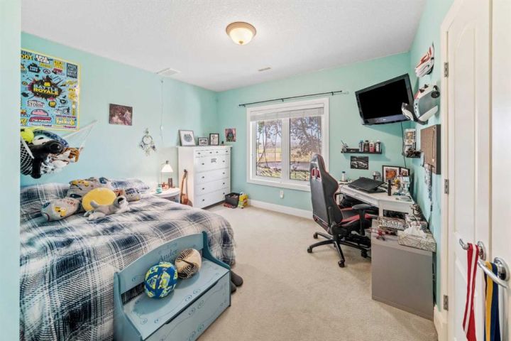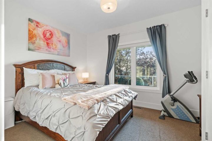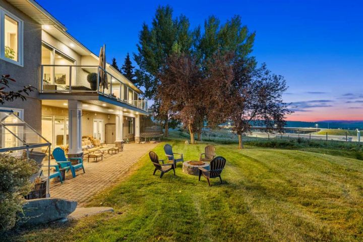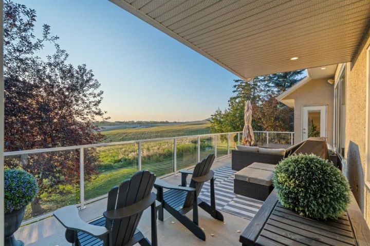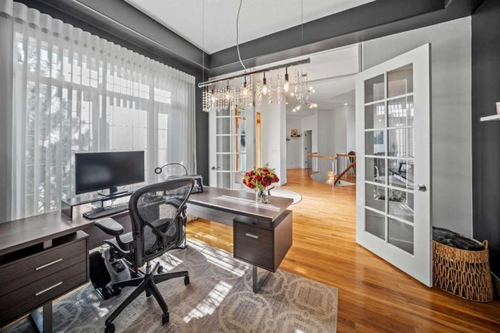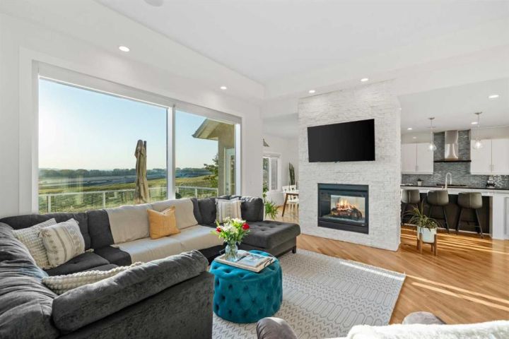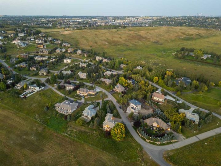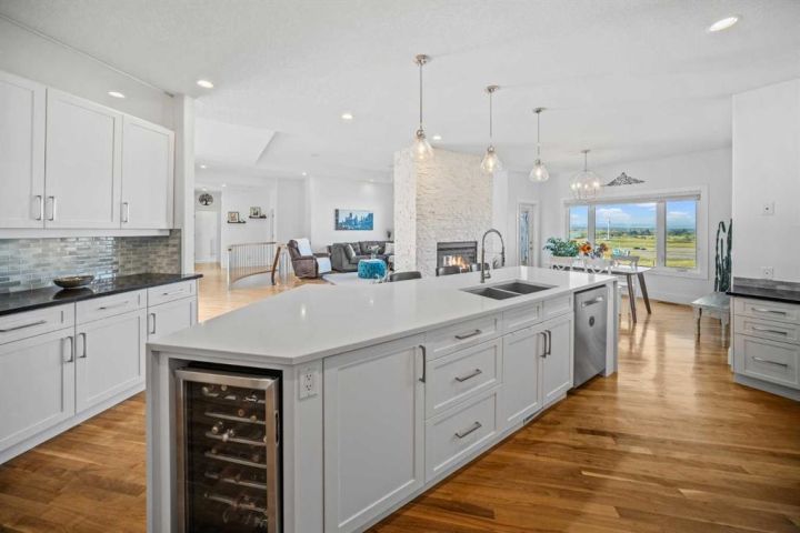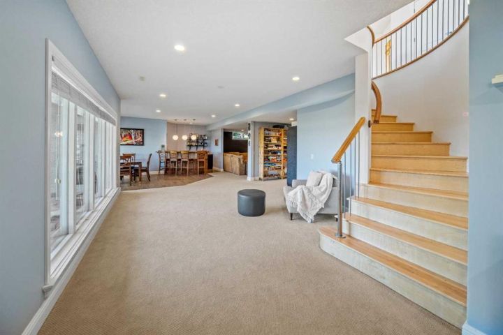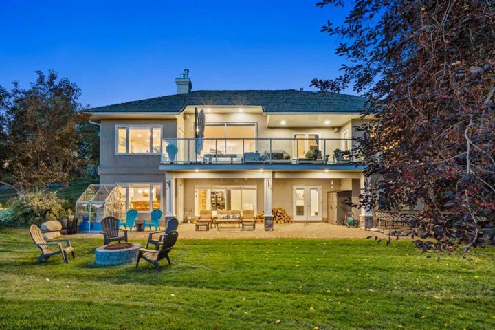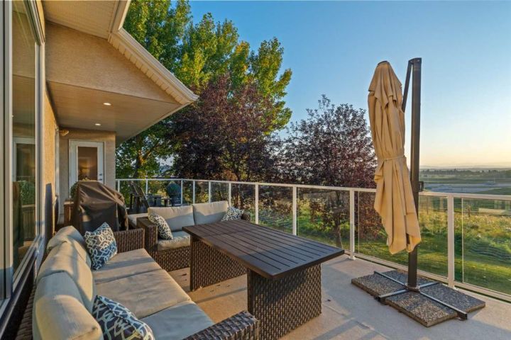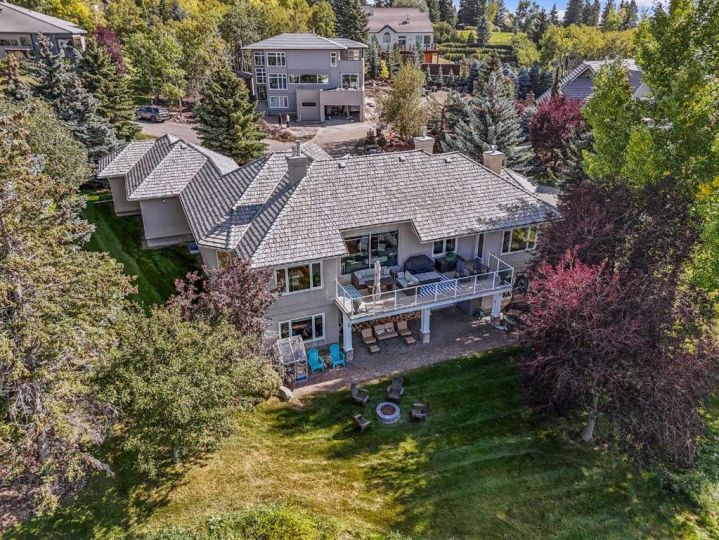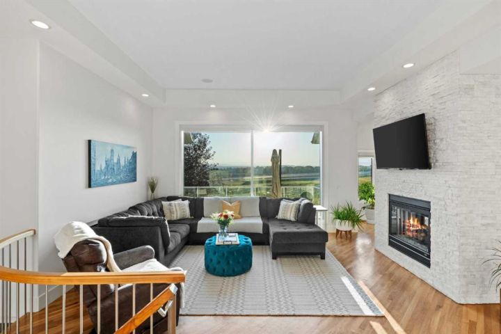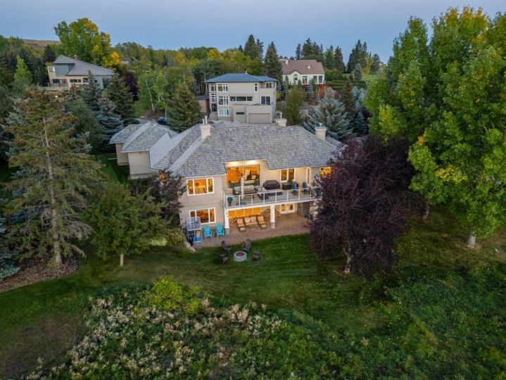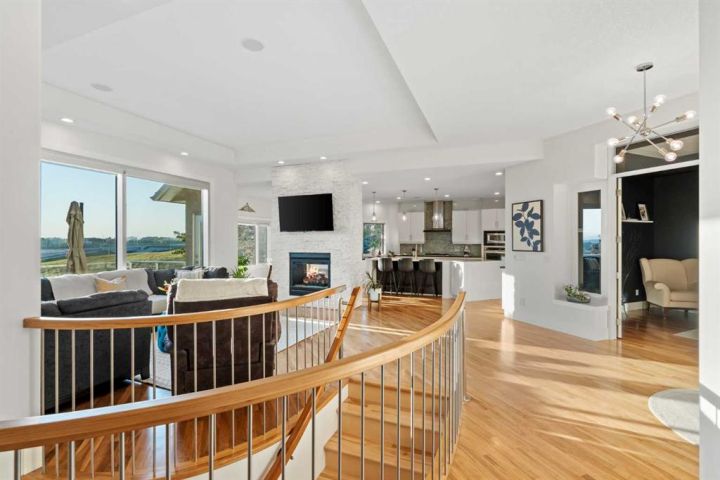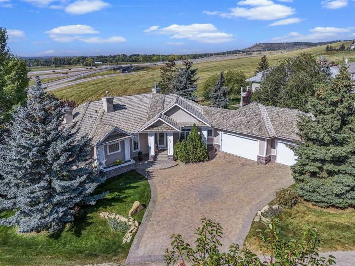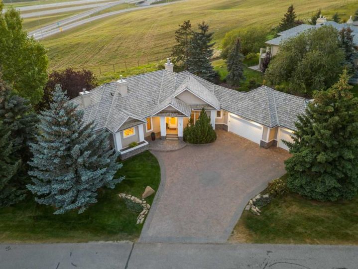 This stunning and charming five-bedroom walkout bungalow offers over 4,000 sq. ft. of fully developed living space in the prestigious gated community of The Slopes in Springbank Hill. Set on a half-acre lot with PANORAMIC MOUNTAIN VIEWS, the home blends elegance, comfort, and convenience— just minutes from Calgary's finest west ammenities and top schools in the city. The main level highlights 12-foot ceilings, natural walnut hardwood floors, and a graceful curved staircase connecting both levels. A large main-floor office offers a quiet workspace. The open-concept living area is anchored by a double-sided fireplace set in an elegant stone feature wall, creating warmth and style between the kitchen, dining, and living spaces. The chef’s kitchen boasts a gas cooktop, stainless steel appliances, quartz countertops, abundant cabinetry, and a massive island—perfect for entertaining and everyday living. The primary suite captures breathtaking mountain vistas, offers direct access to the west-facing deck, and includes a spa-inspired ensuite with a steam shower, soaker tub, double sinks, walk-in closet, and heated floors. A second bedroom with a walk-through bathroom and a convenient main-floor laundry room complete this level. The fully finished walkout basement with 9-foot ceilings and in-floor heating provides three additional bedrooms—including one currently used as a gym with double French doors—along with an expansive entertainment and games area, bar, and dining space. Outdoors, enjoy a south- and west-facing deck, a landscaped half-acre yard, and a triple-car garage with a custom interlocking stone driveway that offers plenty of parking. With air conditioning, a thoughtful floor pan, large windows, elegant design, and proximity to Calgary’s finest schools, major routes, and the mountains, this residence offers a lifestyle as remarkable as its views. Opportunities like this are RARE!