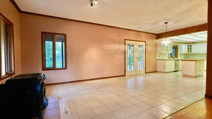 Pellet stove, hot tub, 1 shed, TV and book shelf, window coverings