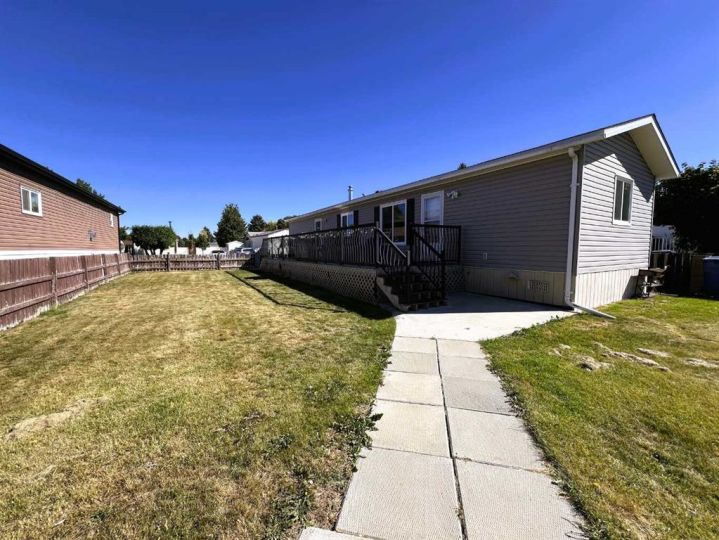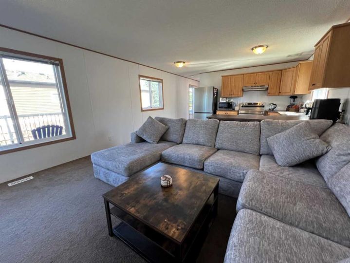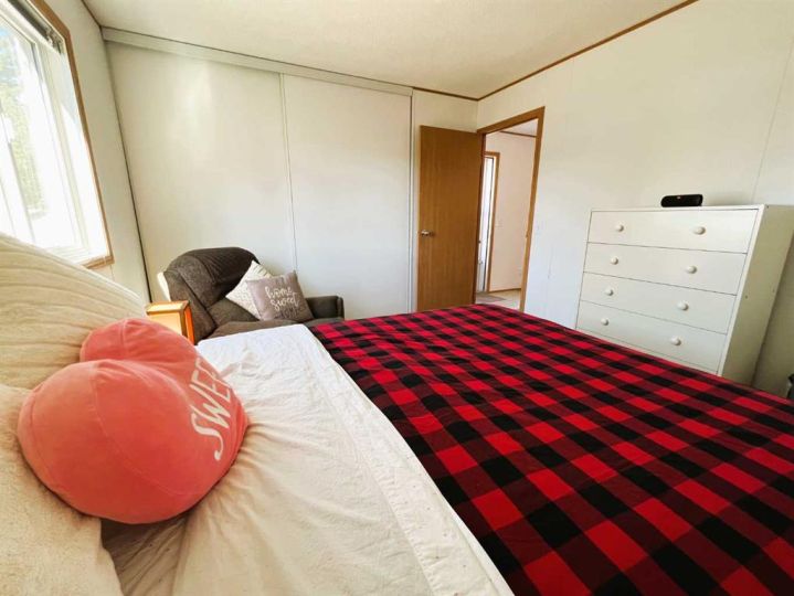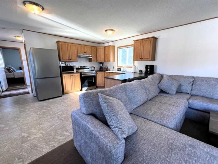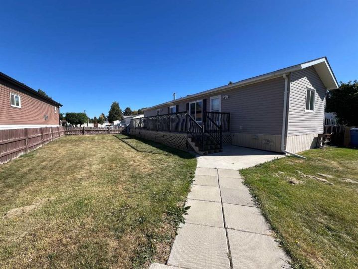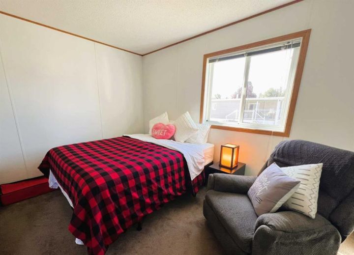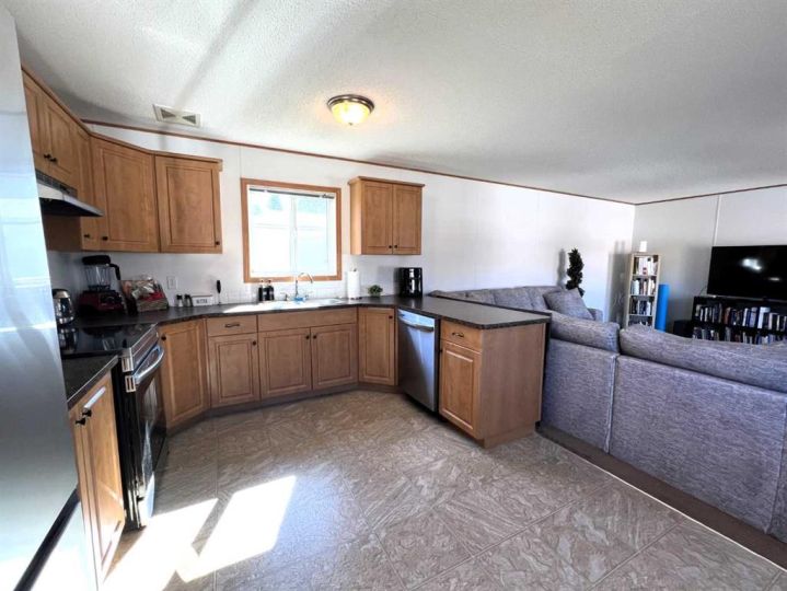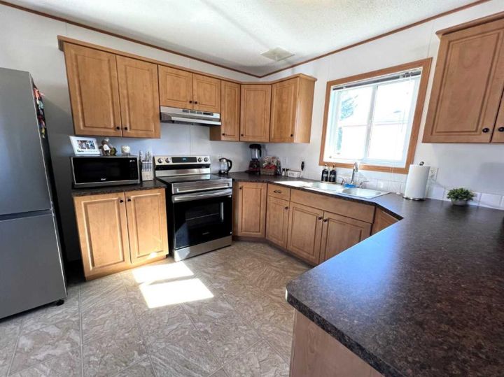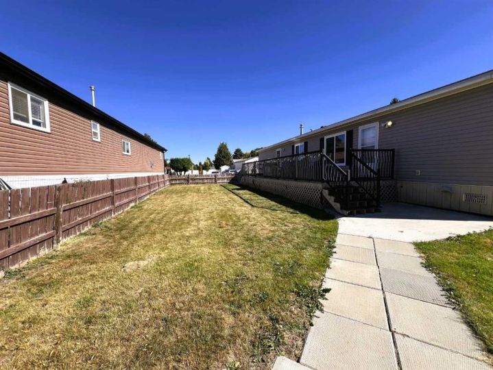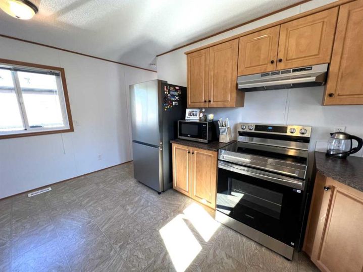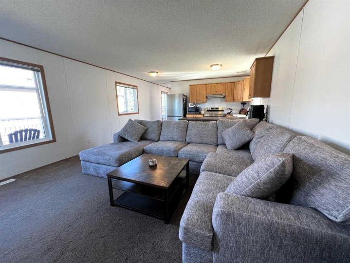 Looking for something bright and affordable with a large fenced yard? You've just found it! Freshly painted throughout, this 2 bedroom home with vaulted ceilings has been gently lived in and has brand new stainless steel kitchen appliances and new a washer & dryer. The kitchen is open and spacious with warm, maple cabinetry and plenty of counter space and overlooks the large living room. The laundry area is conveniently situated just outside the primary bedroom for ease of use. Enjoy the beautiful sunset on the large deck overlooking the spacious yard where there's plenty of room to putter around in if you are inclined to create a beautiful garden area. There are 2 paved parking spaces for your vehicles and the property backs onto a green space. Located in a great community and close to walking paths, this home is perfect!