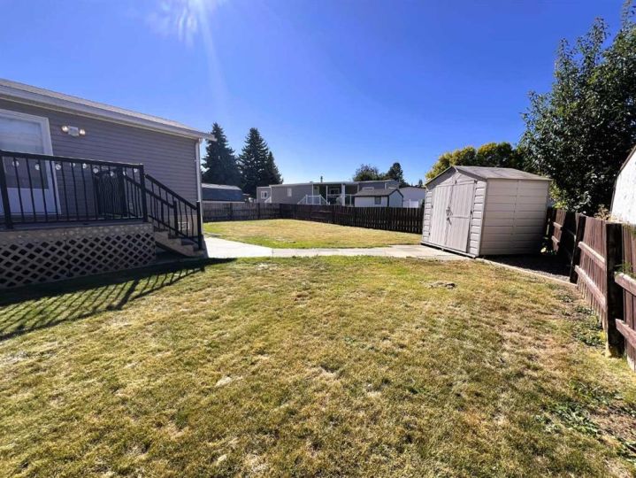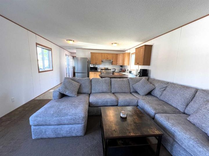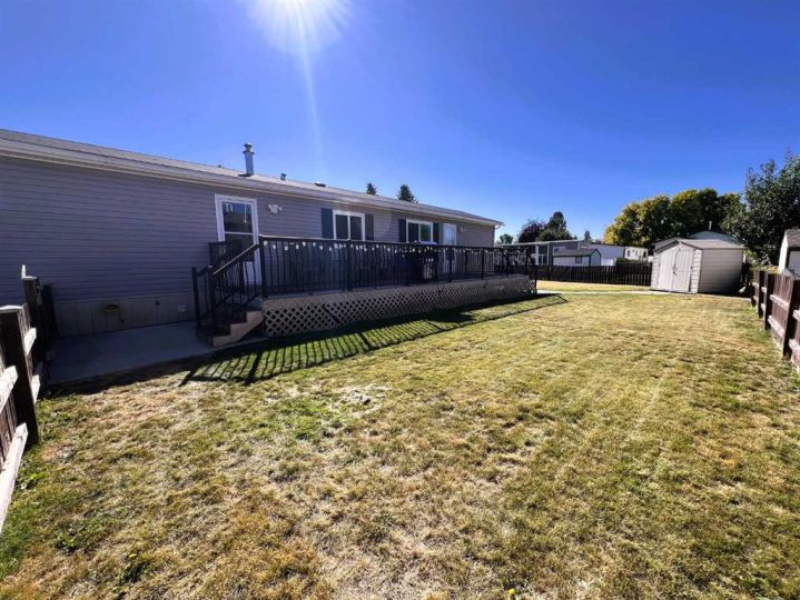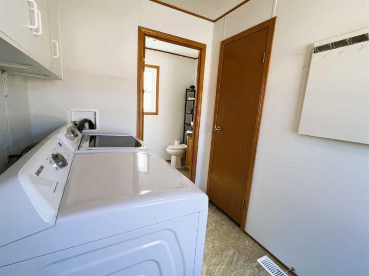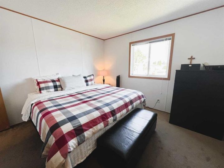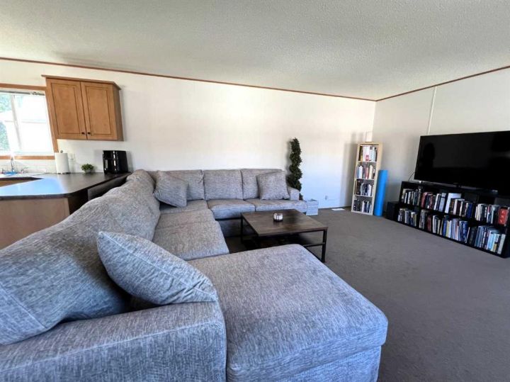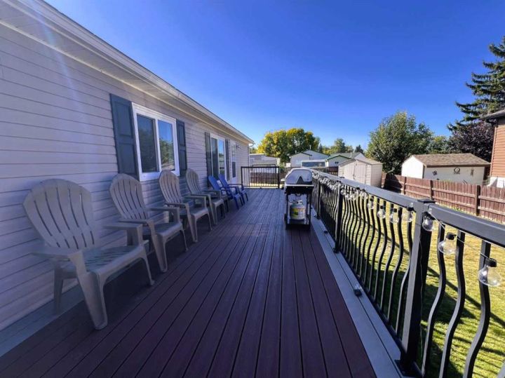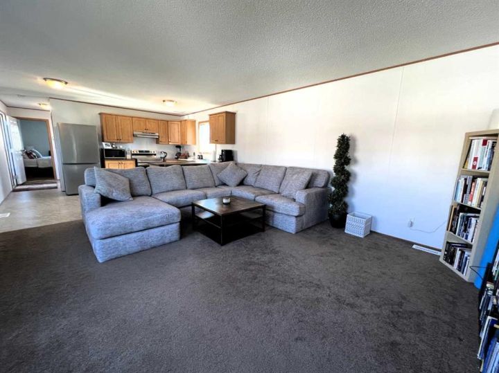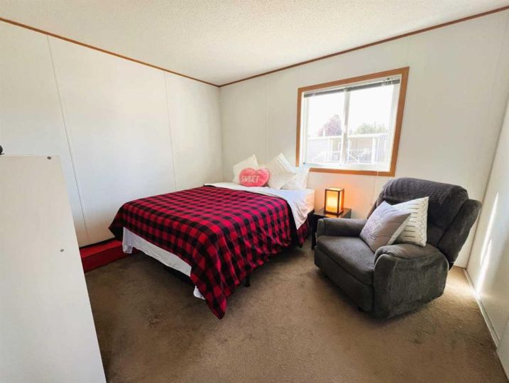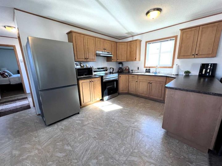 Looking for something bright and affordable with a large fenced yard? You've just found it! Freshly painted throughout, this 2 bedroom home with vaulted ceilings has been gently lived in and has brand new stainless steel kitchen appliances and new a washer & dryer. The kitchen is open and spacious with warm, maple cabinetry and plenty of counter space and overlooks the large living room. The laundry area is conveniently situated just outside the primary bedroom for ease of use. Enjoy the beautiful sunset on the large deck overlooking the spacious yard where there's plenty of room to putter around in if you are inclined to create a beautiful garden area. There are 2 paved parking spaces for your vehicles and the property backs onto a green space. Located in a great community and close to walking paths, this home is perfect!