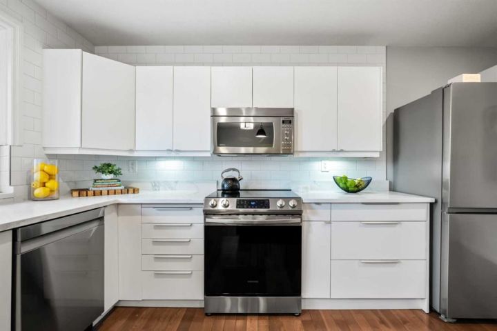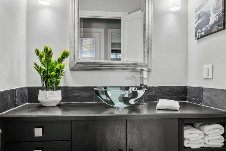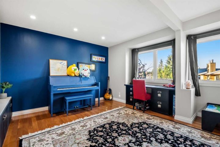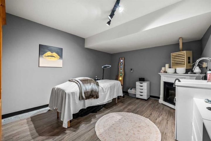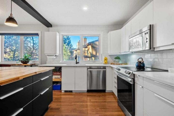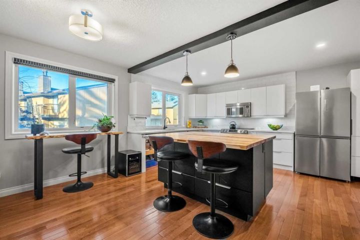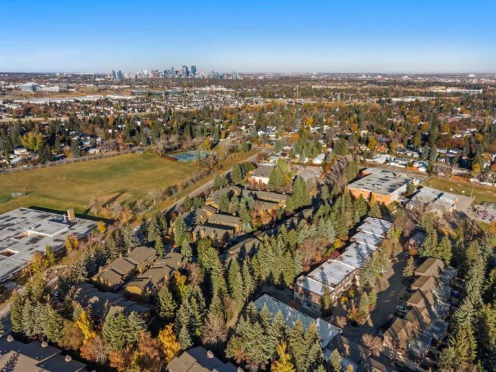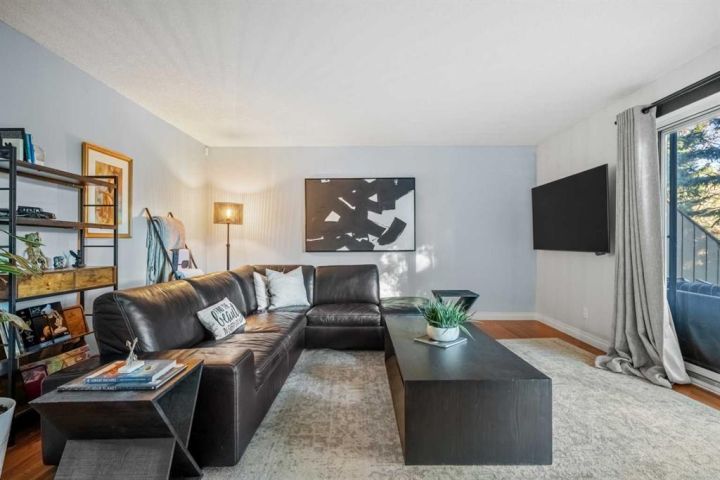 Welcome to Lakeview Greens, the pinnacle of desirable living in Calgary’s sought-after Lakeview community. This exceptional townhome boasts a sun-drenched, south-facing backyard and an unbeatable location that truly has it all. Families will appreciate being just steps away from top-rated schools, including Jennie Elliot Elementary, Bishop Pinkham Jr. High, and Connect Charter School. Take leisurely strolls along Lakeview’s charming, tree-lined pathways, or enjoy nearby outdoor gems like North Glenmore Park, Weaselhead Provincial Park, and the prestigious Earl Grey Golf Course. Commuters will love the quick drive to downtown Calgary, while mountain enthusiasts can escape to the Rockies in under 45 minutes. Step inside to find a beautifully designed townhome featuring gorgeous hardwood flooring throughout. The open riser stairs lead to a mid-century inspired layout, evoking warmth and calm. The chef-inspired kitchen includes white quartz countertops, a striking butcher block island, sleek modern cabinetry, stainless steel appliances, a subway tile backsplash, and a practical corner pantry. The spacious living room is flooded with natural light from large patio doors that open onto your private backyard, anchored by a cozy wood-burning fireplace — perfect for entertaining or unwinding after a long day. Upstairs, you’ll discover two generous bedrooms (which could easily be converted back into three), including a serene primary suite featuring a large walk-in shower, creating a peaceful retreat. The finished basement studio adds versatility, ideal for a home gym, creative space, or private office. Notable updates include a new furnace (2023), hot water tank (2021), dishwasher (2024), fridge (2021), and all windows replaced in 2017. This remarkable home is your opportunity—don’t miss the chance to make Lakeview Greens your new address. Book your private viewing today and experience the best of Lakeview living. Don’t forget to explore the immersive virtual tour of this exceptional home!
