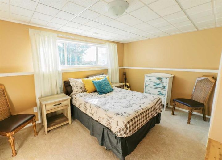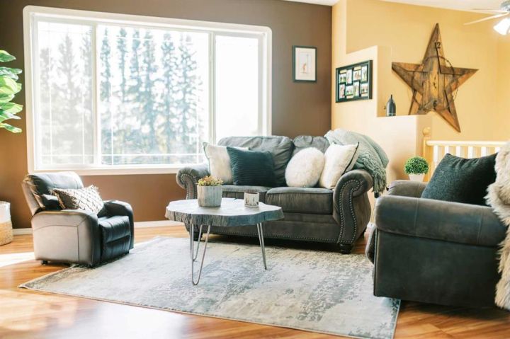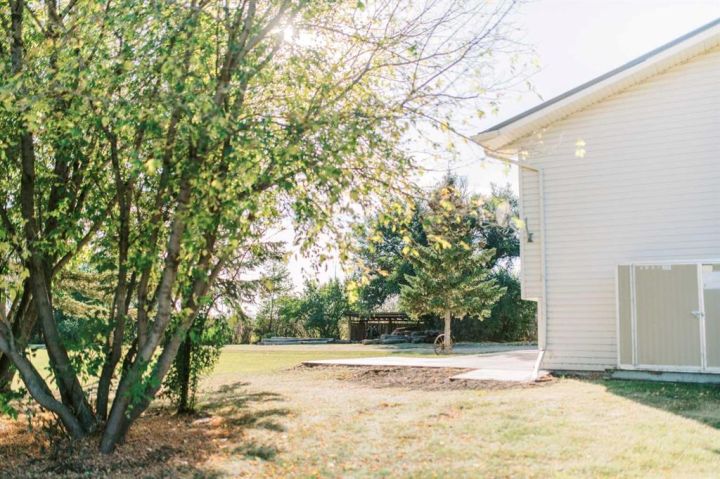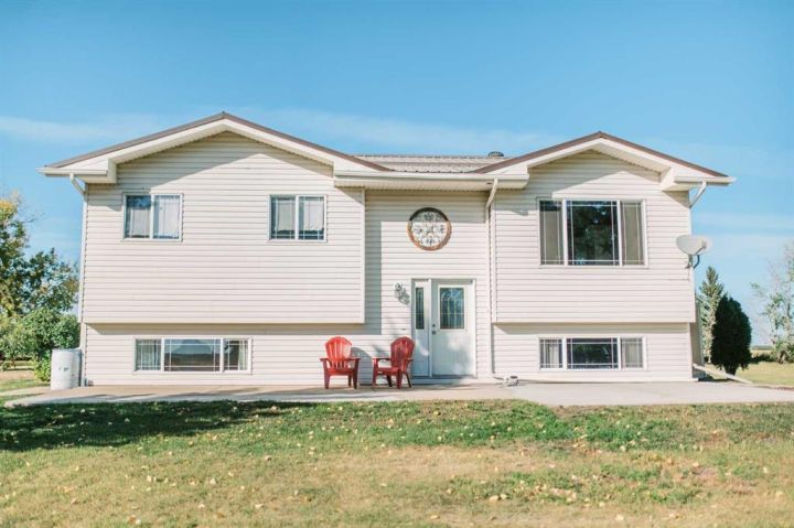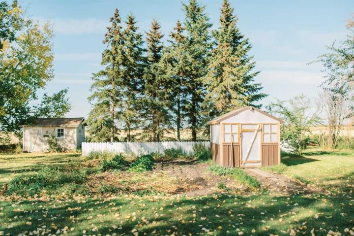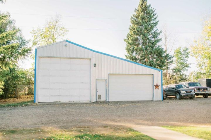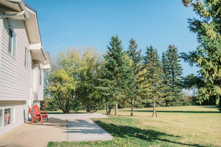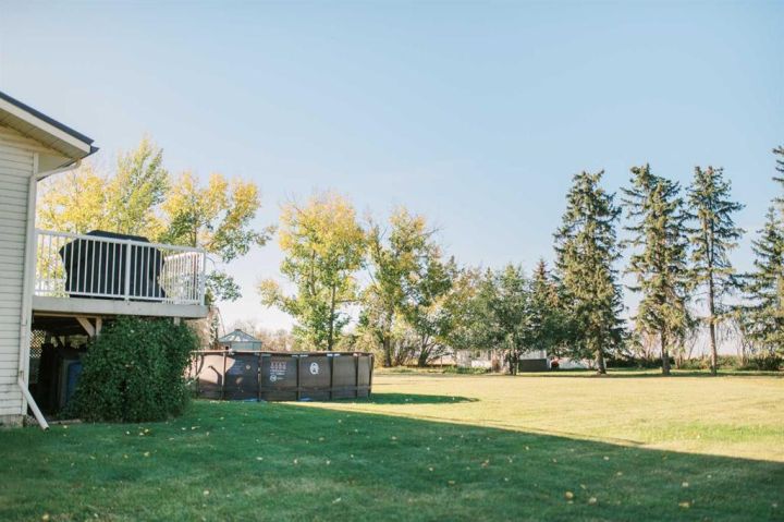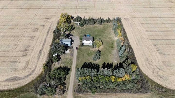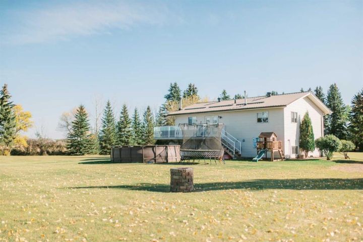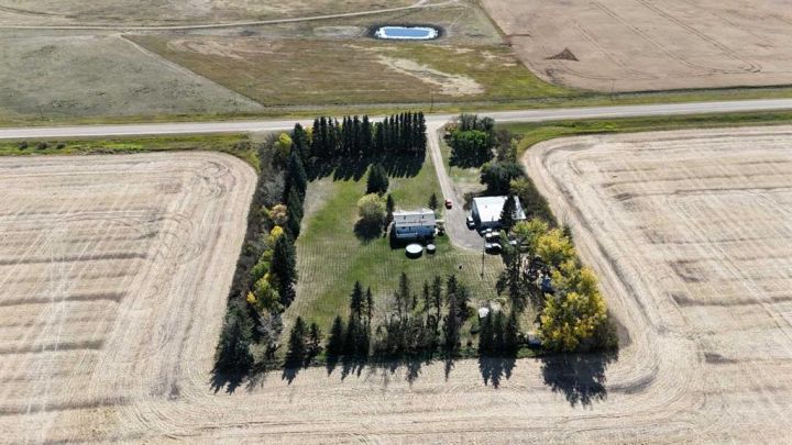 ONLY HALF A MILE OFF PAVEMENT and just 15 minutes SW of Stettler, this beautifully kept 4-acre property is a private oasis completely surrounded by mature trees and a meticulously manicured yard. The 4-BED, 2-BATH BI-LEVEL home offers an OPEN-CONCEPT kitchen, dining, and living area with VAULTED CEILINGS and LARGE WINDOWS that fill the space with natural light. The spacious primary bedroom easily accommodates a king bed with room to spare, and the bright lower level feels nothing like a basement thanks to big, eye-level windows. Step out to the NO-MAINTENANCE BACK DECK—complete with storage underneath and a FREESTANDING POOL—for effortless summer living, or relax on the poured-concrete patio at the front. A HEATED WORKSHOP is cleverly divided to provide warm work space on one side and unheated cold storage with a LARGE OVERHEAD DOOR and mezzanine on the other. Attached to the shop is a FENCED DOG RUN with a DOGGY DOOR for year-round indoor/outdoor access. Nearby, a versatile SHELTER adds even more covered space for projects or equipment. Garden enthusiasts will love the GARDEN AREA, GREENHOUSE, and POTTING SHED. One of the property’s showpieces is the CUSTOM GRAIN-BIN BAR/BUNKIE (2022)—HEATED, INSULATED, and POWERED—set beside a FIRE-PIT AREA complete with swing-bench seating and a 30-AMP RV PLUG-IN for easy camper or guest hookups. This home has been lovingly maintained with MANY PRACTICAL UPDATES: 2018 sewer pump and furnace motherboard, 2019 hot water tank, 2020 dishwasher, 2021 KitchenAid gas stove with DOUBLE OVENS and over-the-range microwave, 2022 water pressure tank plus new washer and dryer, a METAL ROOF in 2023, and a NEW FRIDGE in 2025. The property is PERIMETER-FENCED and gated for convenience and peace of mind. All around, this acreage offers exceptional privacy, thoughtful upgrades, and tremendous value in the County of Stettler.