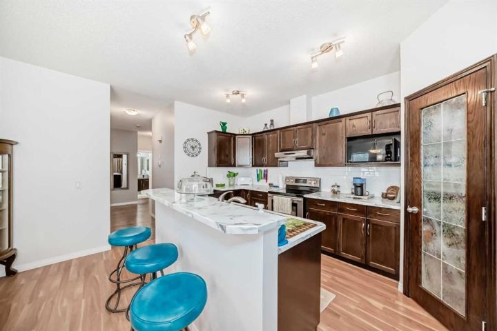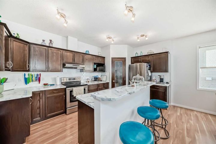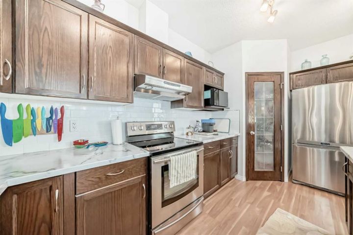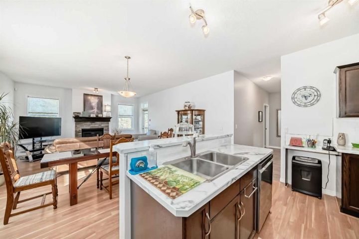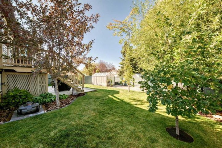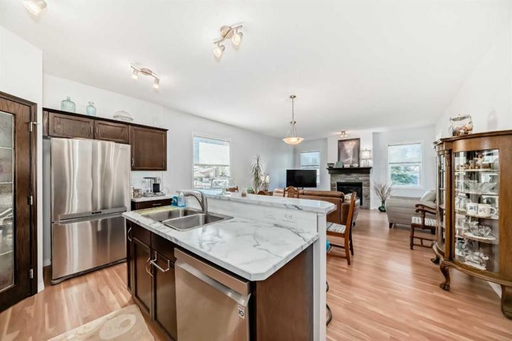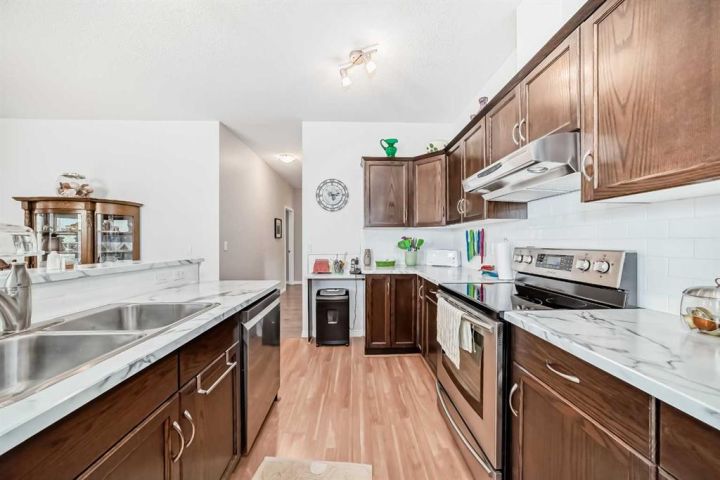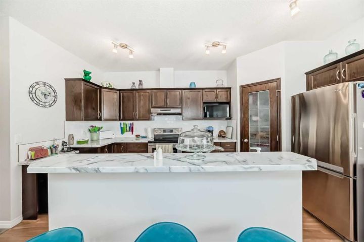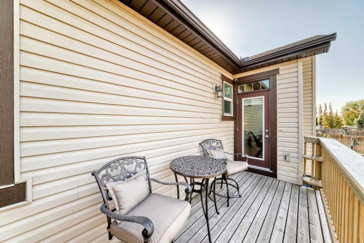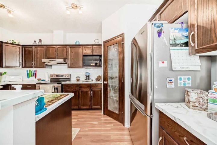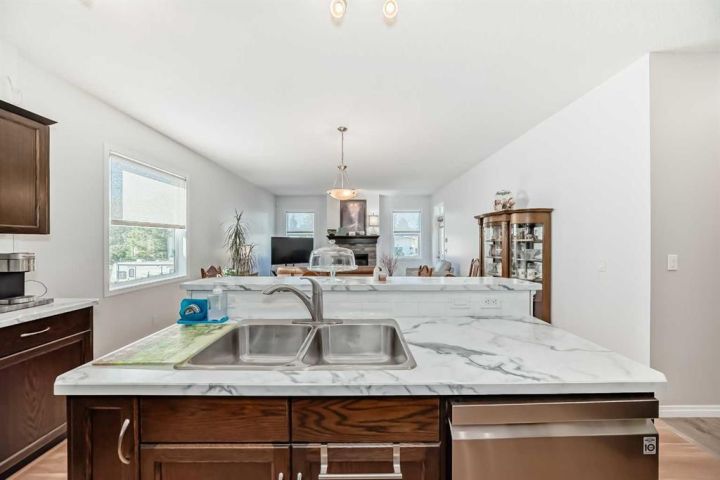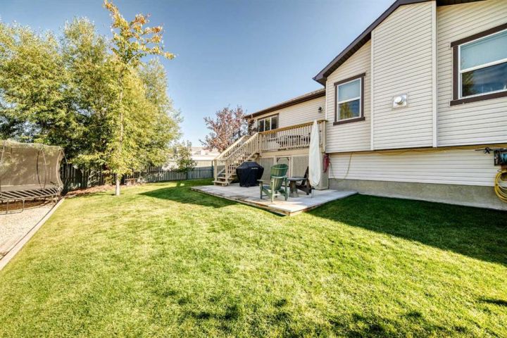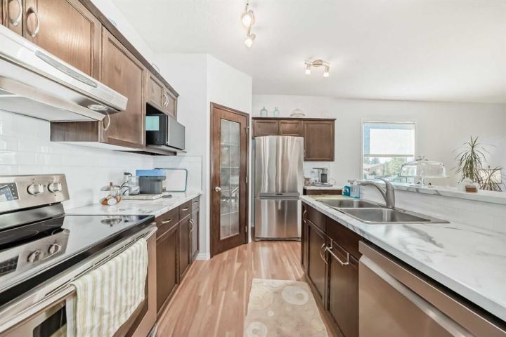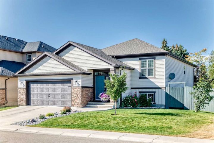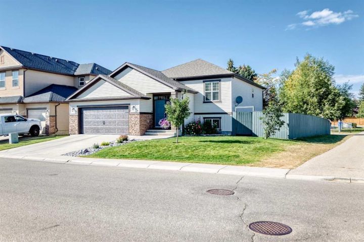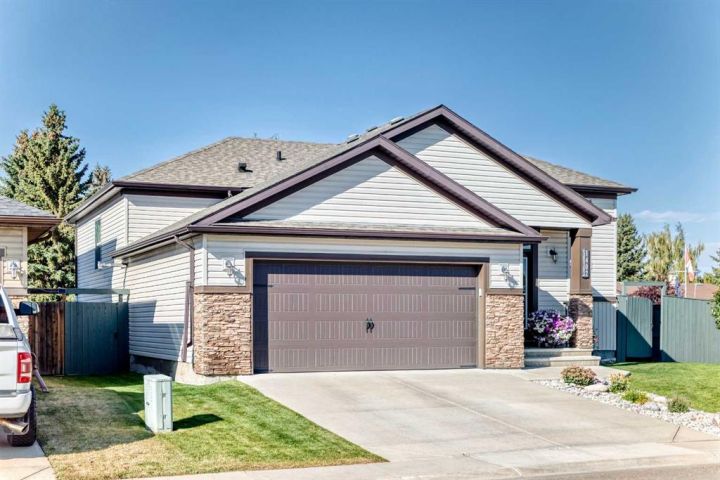 Come and take a look at this beautiful, meticulously maintained Bi-Level in Carstairs — a home that has been lovingly cared for with thoughtful details throughout, leaving nothing for you to do but move in and enjoy. From the moment you drive up, the meticulous landscaping sets the tone for what awaits inside. Step through the front door and you’ll be greeted with updated flooring that flows seamlessly through both the main and lower levels. The kitchen offers ample counter space, a corner pantry, stainless steel appliances, and opens onto the living and dining areas. A cozy gas fireplace with a mantle anchors the living room, while patio doors lead out to the deck, patio, and backyard oasis. The main floor also features a spacious primary suite with a walk-in closet and a 5-piece ensuite, complete with double sinks, a soaker tub, and a separate shower. A second bedroom and full bathroom complete the main level. The fully developed lower level boasts high ceilings with a suspended design for easy access, two large bedrooms, a family room, a four-piece bath, a generous laundry area, and fantastic storage with shelving that stays. Practical touches continue in the double heated attached garage, equipped with a workbench and rubber mats on the stairs. Outside, the backyard is truly a work of art — complete with a greenhouse, trampoline, mature trees, a large patio with built-in umbrella, and full fencing. Even better, the yard is wired for a Husqvarna automower (robotic mower), which is included.This home is the perfect blend of comfort, practicality, and beauty — and must be seen in person to be fully appreciated.