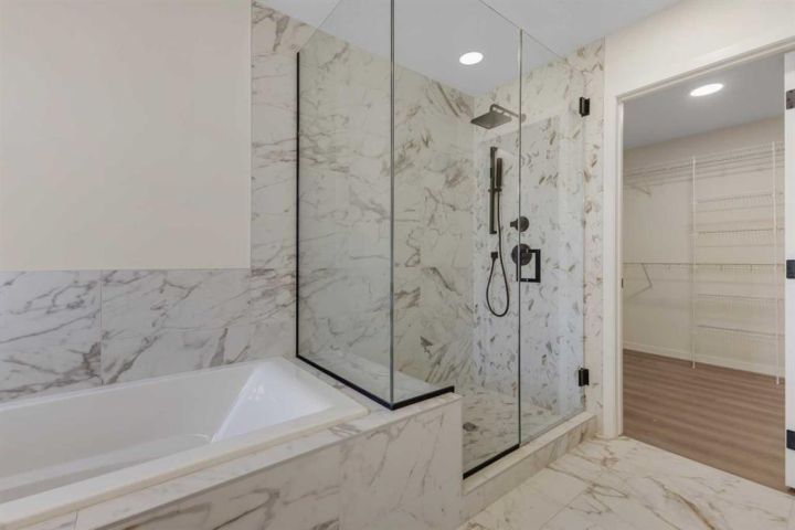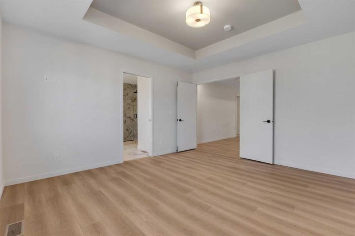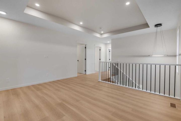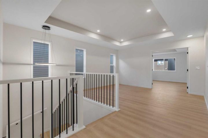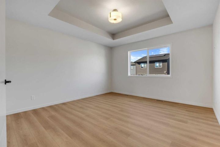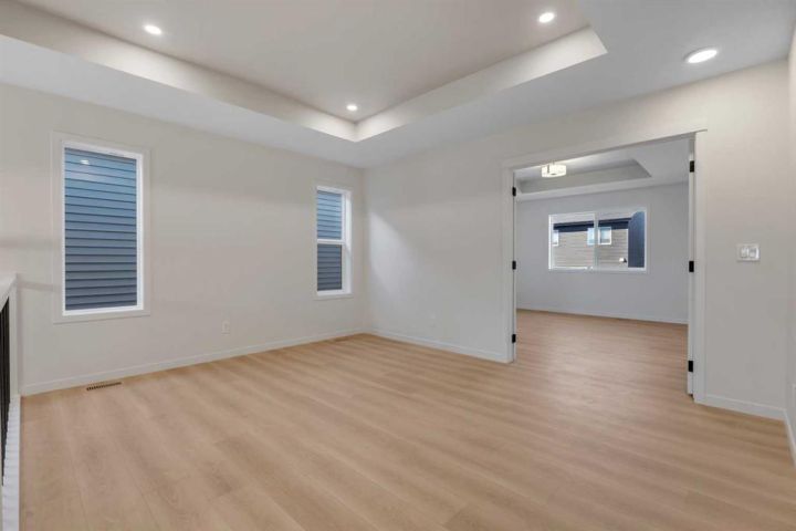 The home features plank flooring throughout the main floor, stairs, bonus room, and upper hallway, plus a striking 50” built-in electric fireplace with tile to the ceiling. Iron spindle railings add architectural charm, while sleek black plumbing fixtures, upgraded bathroom hardware, and custom tilework bring a modern edge. The ensuite is a true retreat with a two-sided glass, custom-tiled shower and tray ceiling details in both the master bedroom and bonus room.