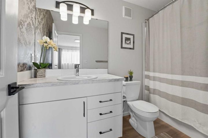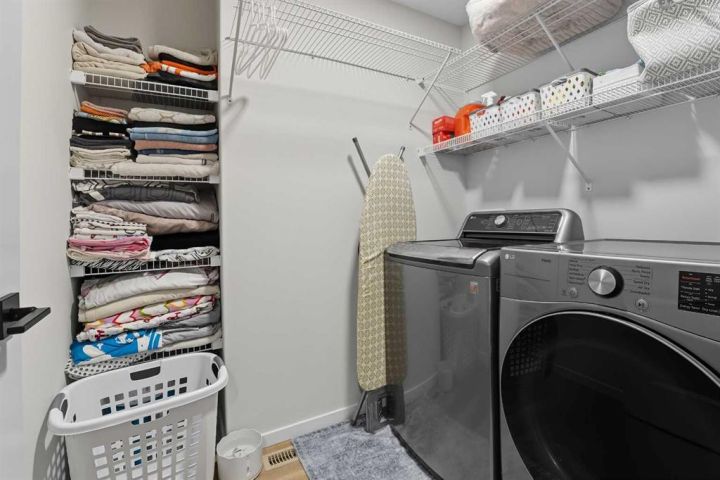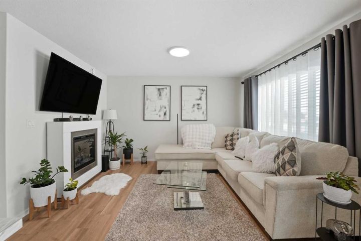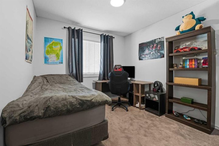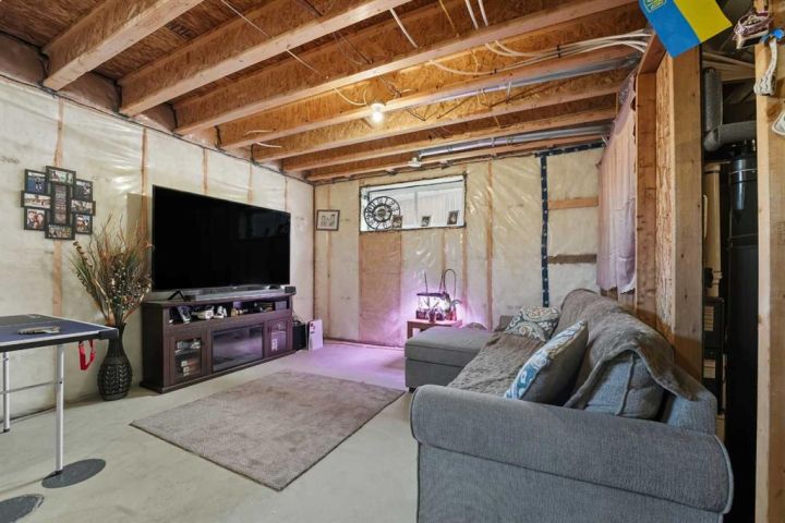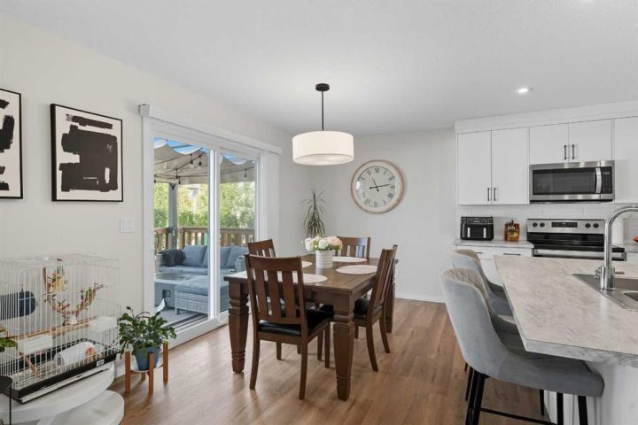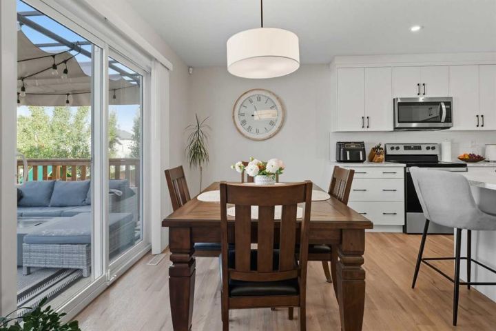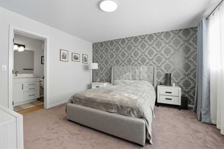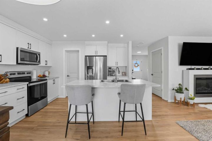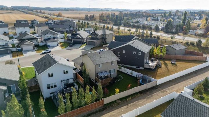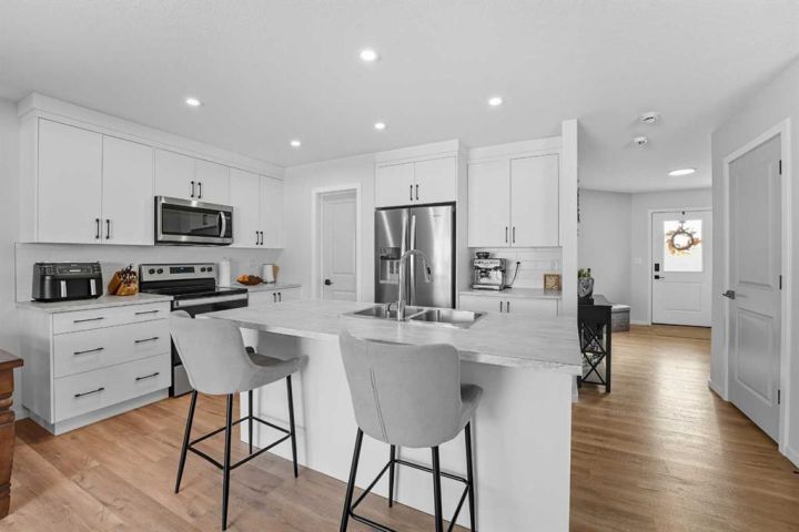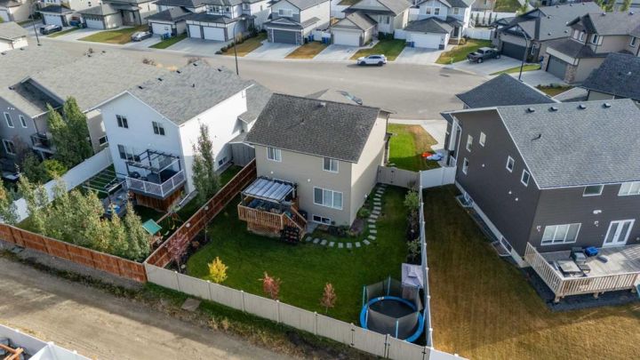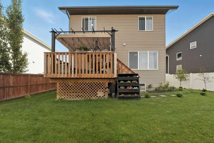 Located in Timber Ridge, this 2-storey home offers an open floorplan with 3 bedrooms up, along with an upstairs laundry room, A/C, and a pie lot! There is vinyl plank flooring on the main level with the upstairs carpeted. The kitchen features white cabinetry that extends all the way to the ceiling, stainless steel appliances, tiled backsplash, walk-in pantry, and an island with an eating bar. The living room receives a ton of natural light from the yard facing West and the dining area includes sliding glass doors leading out to the back deck. The owners have made the deck a very welcome space to unwind after a days work, and includes a pergola and a designated area to BBQ next to the deck. There is a 2 PC bath off the main entry and the garage is painted, along with attached shelving for additional storage. Upstairs, the primary suite gets the morning sun and has a large walk-in closet and a 4 PC ensuite. Two more bedrooms share a 4 PC bathroom, and as mentioned, you have the convenience of an upstairs laundry room. The basement is awaiting your finishing touch. The pie-shaped lot has been beautifully landscaped and comes with maintenance free vinyl fencing. If you need trailer parking, that is possible here. Balance of 10 year Alberta New Home Warranty. This home is in amazing condition and in a great neighbourhood!
