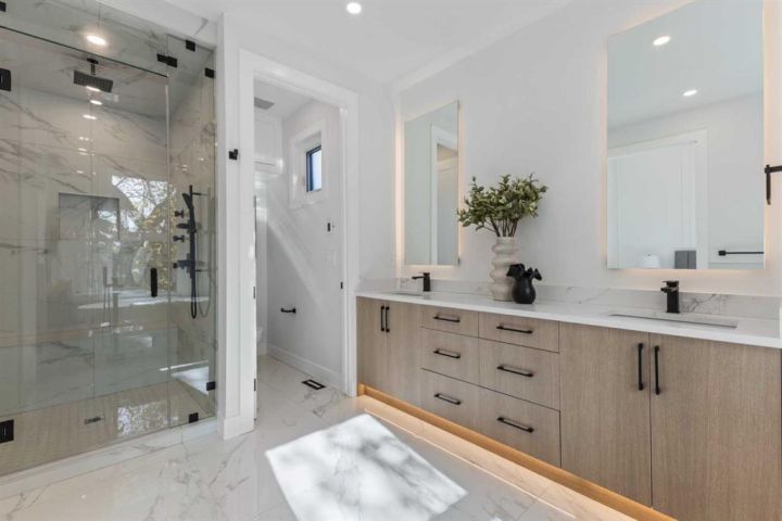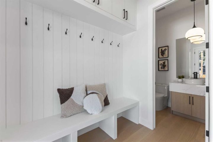 Beyond, the living room invites gatherings with its gas fireplace surrounded by sleek tile and floating shelves. Large sliding doors flood the space with natural light and extend the living area into the landscaped backyard. At the rear, a mudroom with built-in lockers and a powder room keep daily comings and goings seamless.