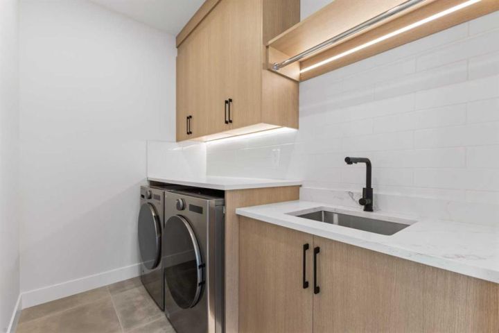 Two additional bedrooms with custom closets, a 4-piece bath, and a full laundry room with sink and cabinetry complete this level.