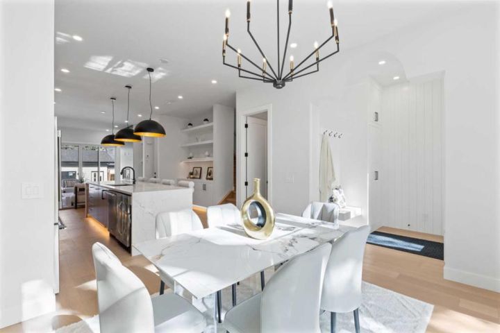 Step inside to 10’ ceilings, wide-plank engineered hardwood, and custom millwork that set an elevated tone from the start. At the front of the home, a bright dining space overlooks the tree canopy, while a discreet pocket office provides the perfect work-from-home setup with a built-in desk and storage.