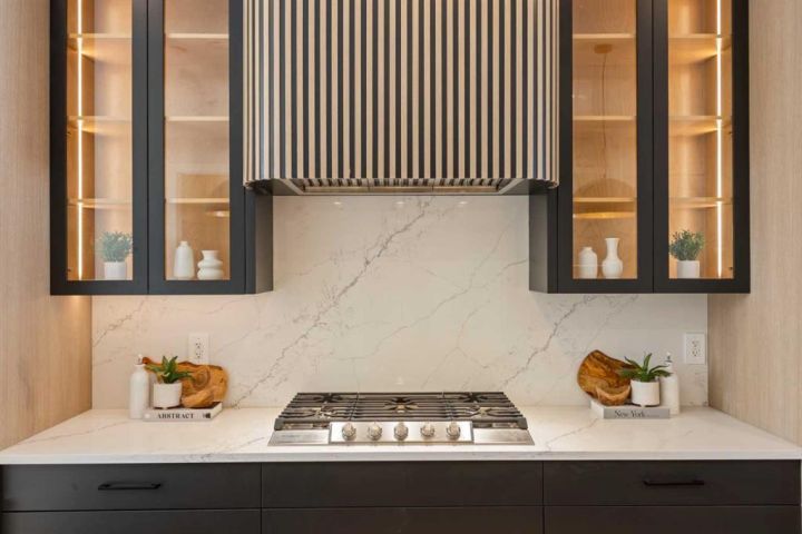 The heart of the main level is the chef’s kitchen, featuring a striking two-tone design with full-height cabinetry, quartz counters, a waterfall island with seating, and premium appliances including a panel-ready fridge, gas range, wall oven, and custom hood fan. A built-in pantry wall and oversized island ensure both form and function.