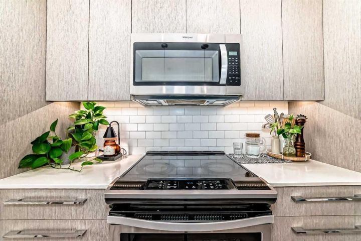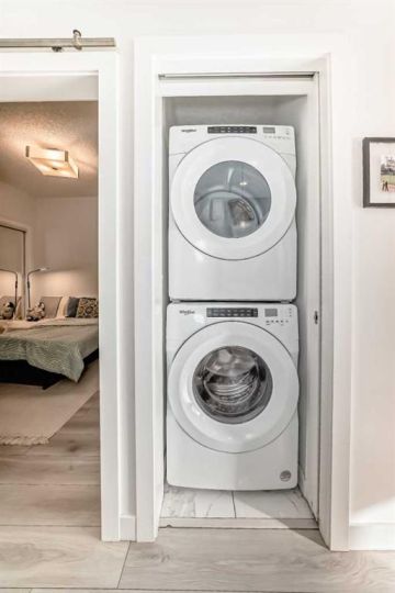 Dishwasher, Electric Stove, Microwave, Range Hood, Refrigerator, Washer/Dryer Stacked