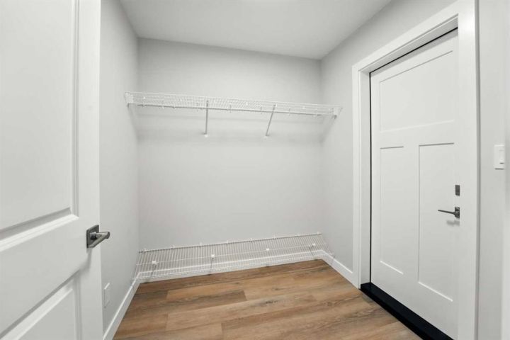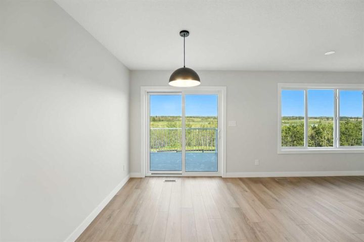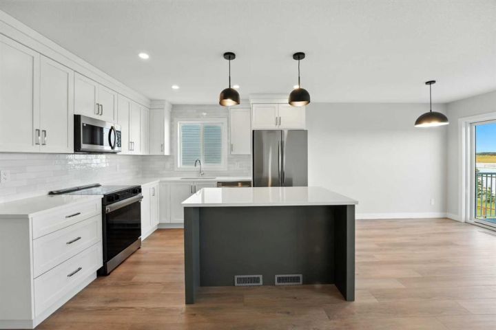 A brand new Larkaun Homes two storey with a front attached triple car garage and a walk-out basement! The curb appeal is accented by the composite-covered front veranda. The front entryway greets you with luxury vinyl plank flooring that spans the entire main floor. Two-toned ceiling height kitchen cabinets are complemented by full tile subway backsplash, quartz countertops, crown moldings, pot/pan drawers and an eating bar island. The dining room has patio doors out to the upper level deck that has a view to the west. The living room is flooded with natural light through the large picture window. You'll appreciate the large back entry way that leads to the triple car garage that boasts 2 floor drains and rough in gas for a future heater. Follow the wrought iron railings up to the second floor. The primary bedroom has a walk-in closet & a 3-piece ensuite with a raised vanity, drawers & a window. There are 2 more bedrooms & a 4-piece bathroom that has a jack & jill divider pocket door for functionality. You'll appreciate the convenience of the upper-floor laundry room. The walk-out basement is ready for your development with rough in underfloor heat and patio doors out to a 10x23 concrete pad and fenced yard. The home includes front sod.