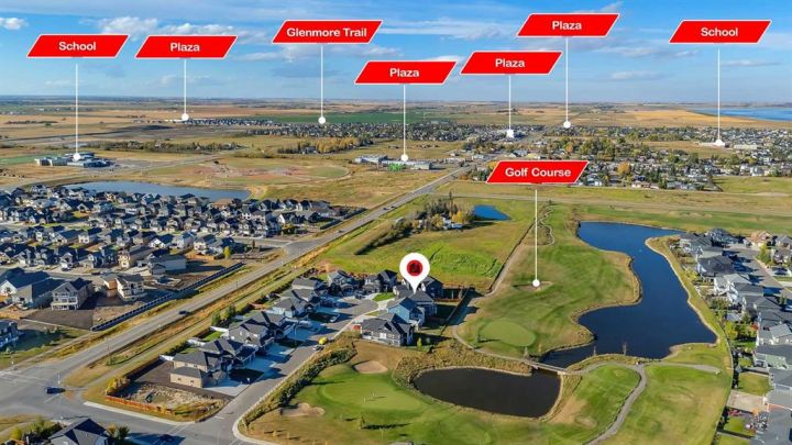 BACKING ONTO GOLF COURSE!! HUGE LOT (8700+ SQFT)!! QUAD OVERSIZED HEATED GARAGE!! SEPARATE ENTRANCE!! WALKOUT BASEMENT!! 5 BEDROOMS!! 3.5 BATHS!! MAIN FLOOR BEDROOM/OFFICE!! This DETACHED HOME is tucked away in a quiet CUL-DE-SAC OF BOULDER CREEK ESTATES, offering over 3000+ SQFT of living space! On the main floor, you’ll find a spacious living room with a cozy fireplace, a bright dining area, and a chef-inspired kitchen with HUGE ISLAND, BUILT-IN FEATURES, PANTRY, and AMPLE CABINETRY. The living area is OPEN TO BELOW, showcasing windows that flood the home with natural light. Dining area opens directly to the backyard. A MAIN FLOOR ROOM (currently used as an office) can double as a guest bedroom. Plus, a 2pc bath completes the main floor. Upstairs hosts 4 BEDROOMS + BONUS AREA. The PRIMARY BEDROOM has a WALK-IN CLOSET and luxurious 5PC ENSUITE BATH. TWO BEDROOMS share a convenient JACK & JILL 4PC BATH, while the 4th BEDROOM enjoys its own 4PC FULL BATH. Laundry is also on this level for convenience. The BONUS ROOM is perfect for a family hangout. The WALKOUT BASEMENT comes with a separate entrance. And the backyard? It’s absolutely massive—stretching wide and backing directly onto the BOULDER CREEK GOLF COURSE, where your view is green and serene. 30 MINS DRIVE TO DOWNTOWN CALGARY!! The brand-new Langdon Plaza is coming soon - featuring McDonald’s, Dollarama, Petro Canada, Anytime Fitness and much more! Close to HIGH SCHOOL, shopping, restaurants, and more, this home truly combines luxury, lifestyle, and location.